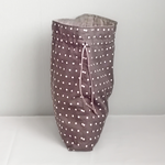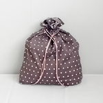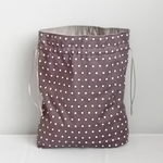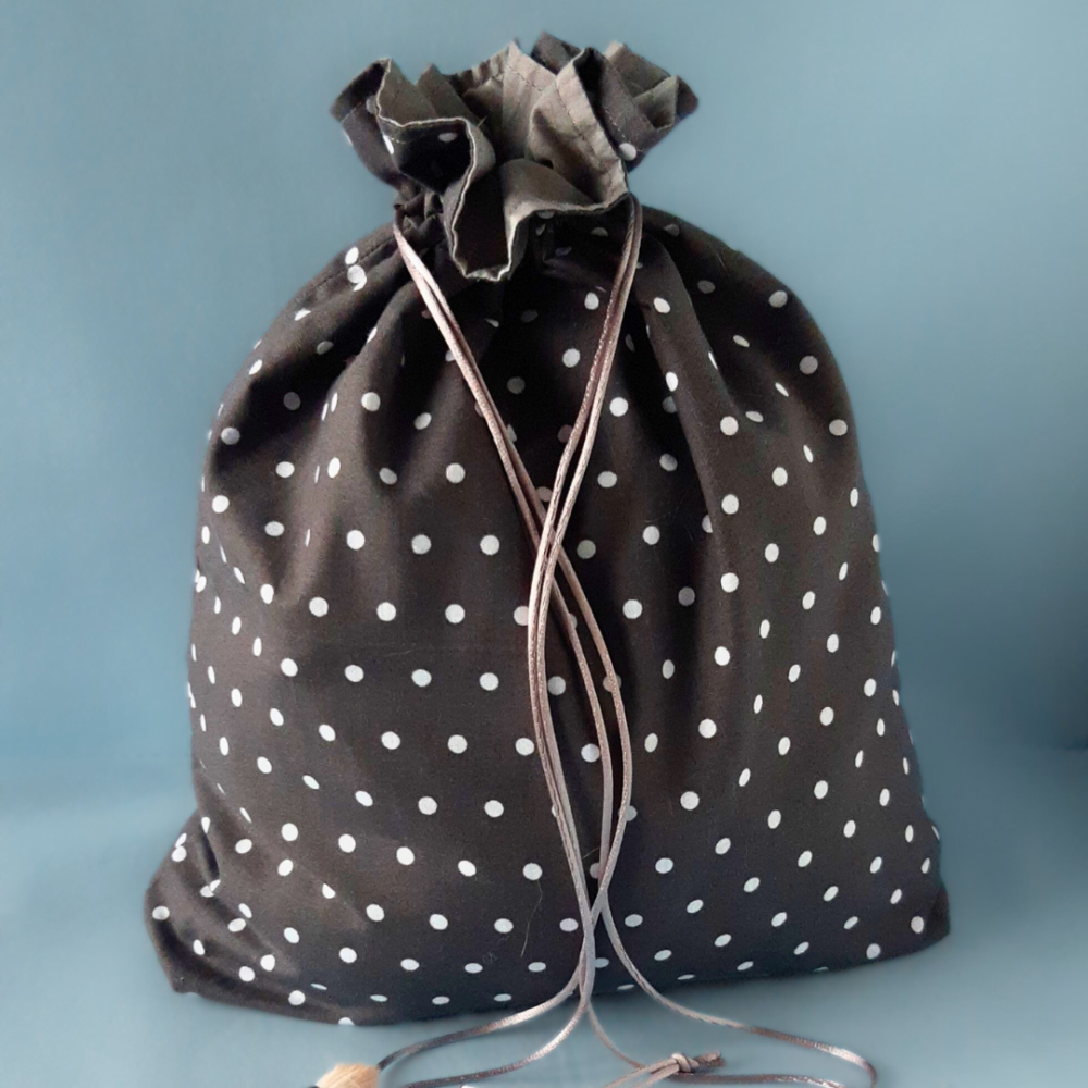 Un grand pochon à pois en coton gris foncé, pratique et élégant. Idéal pour organiser, ranger, ou voyager. Un accessoire fait main indispensable pour une touche cosy dans votre maison ou votre valise