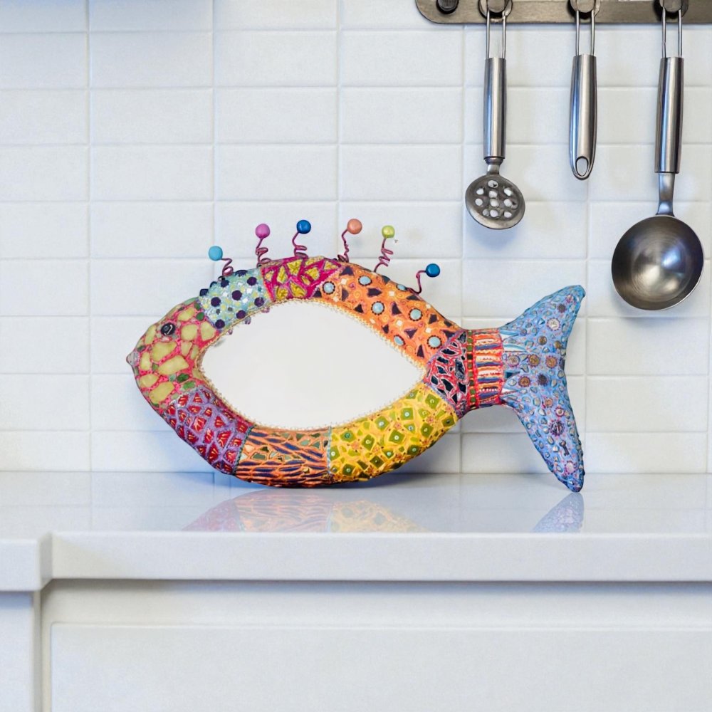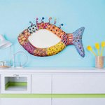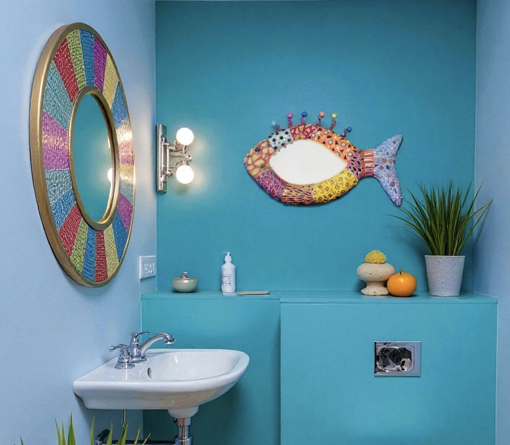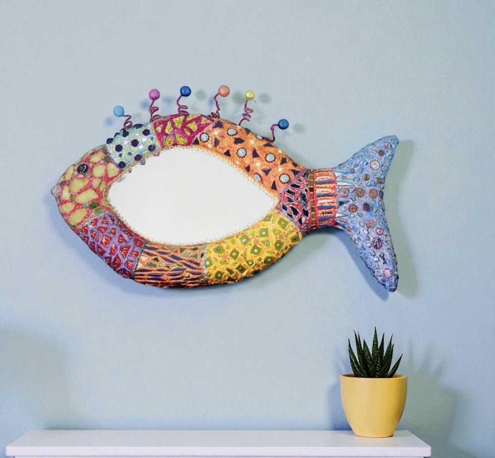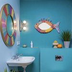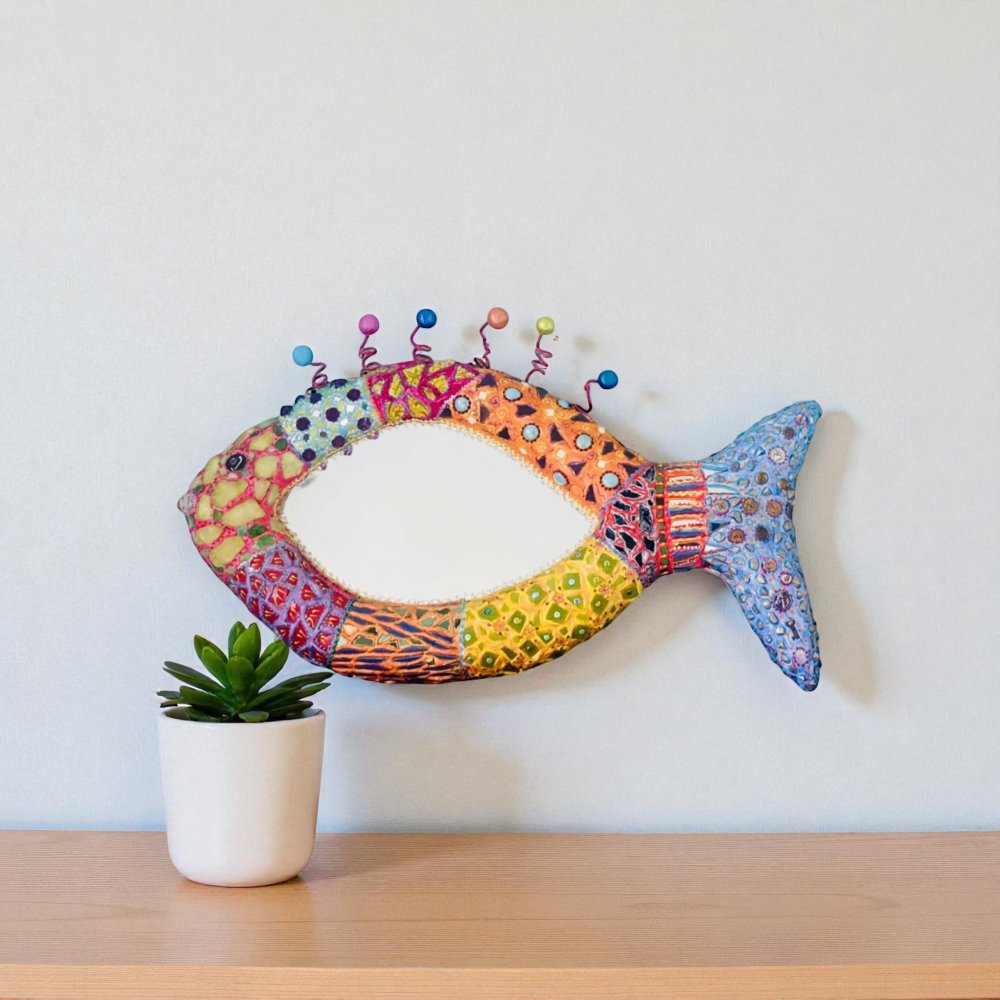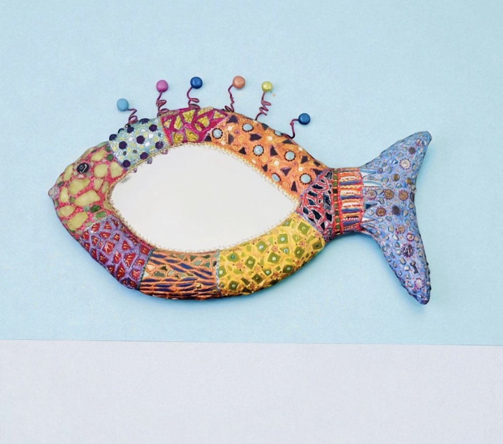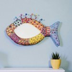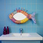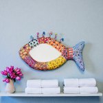 Poisson miroir mural en couleurs, volume sculpté ,mosaïque et peinture ,décoration murale chic et unique ,thème plage ,salle de bain,cuisine