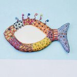 décoration de maison art poisson mosaïque - miroir mural : une ambiance vintage pour ce poisson que j'ai réalisé à partir d'une structure en bois 75 X 40 cm découpée ,avec ajout de matière que j'ai sculptée ,j'ai travaillé en technique mixte, que j'ai inventée pour mon travail et qui marie la peinture et la mosaïque joyeuse! le miroir que j'ai découpé et inséré au centre fait 22 X 38 cm l pour la mosaïque, j'ai utilisé du verre coloré que j'ai récupéré et recyclé ,de la céramique de ma fabrication (de l'argile à l'émaillage en passant par 2 cuissons) ,des perles ,des émaux des boutons métalliques (sur la queue du poisson), des billes de verre, pâtes de verre avec de l'or, micro pâtes de verre, pastilles métalliques et autres éléments joyeux et colorés puis après séchage de la pièce, j'ai peint toutes les parties non recouvertes de mosaïque avec de la peinture acrylique et j'ai dessiné par endroits avec de la peinture 3D relief. j'ai passé, sur toutes les parties peintes, 2 couches de vernis de finission acrylique satiné pour un entretien facile:. Art singulier ,pop art, réalisé dans mon atelier en Drôme provençale, pour une décoration gaie et joyeuse à offrir ou se faire offrir. Pièce unique signée Odile Maffone, fait main en France