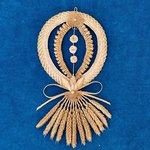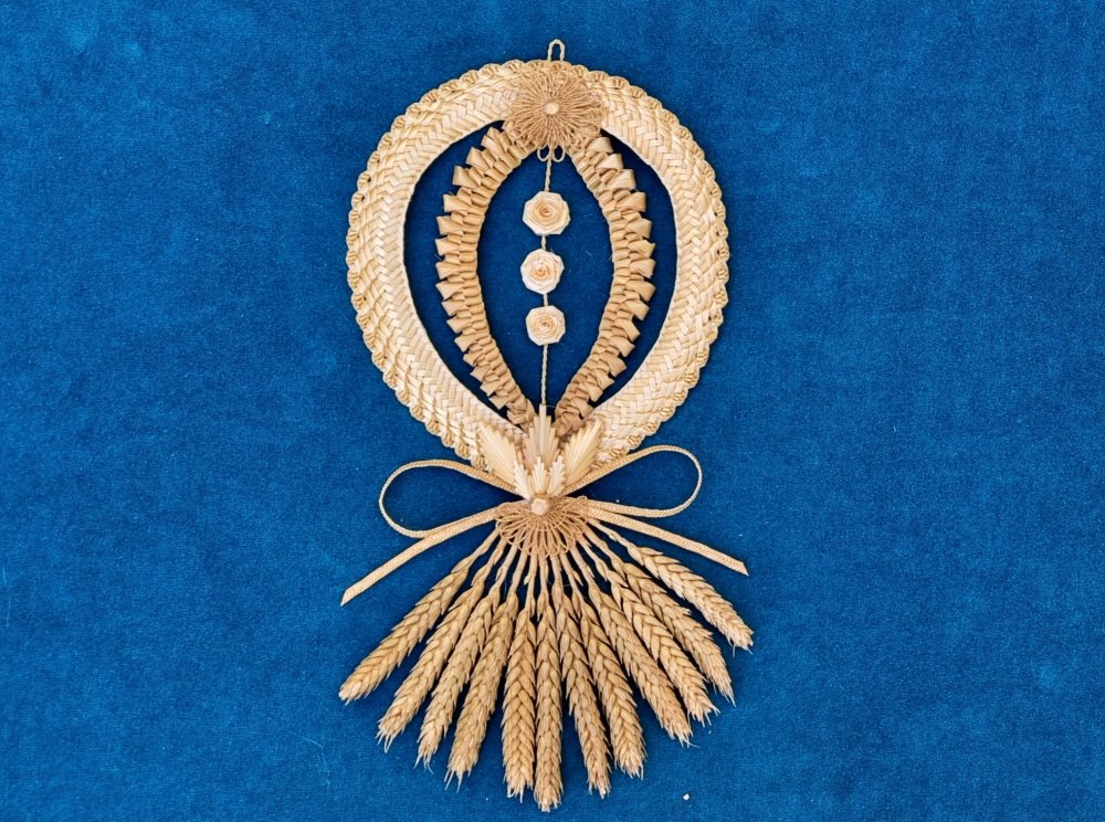 Porte-bonheur confectionnée avec plusieurs tissages en froment, décoré avec des rosettes ( réalisées avec des fils en paille) perle, roses et feuilles fait avec des tiges de paille fendues et un épi de blé stylisé.
