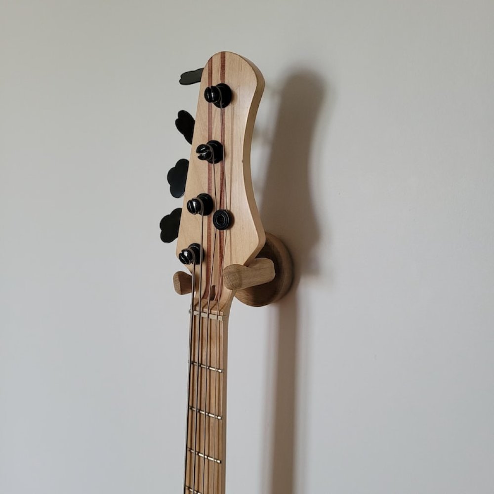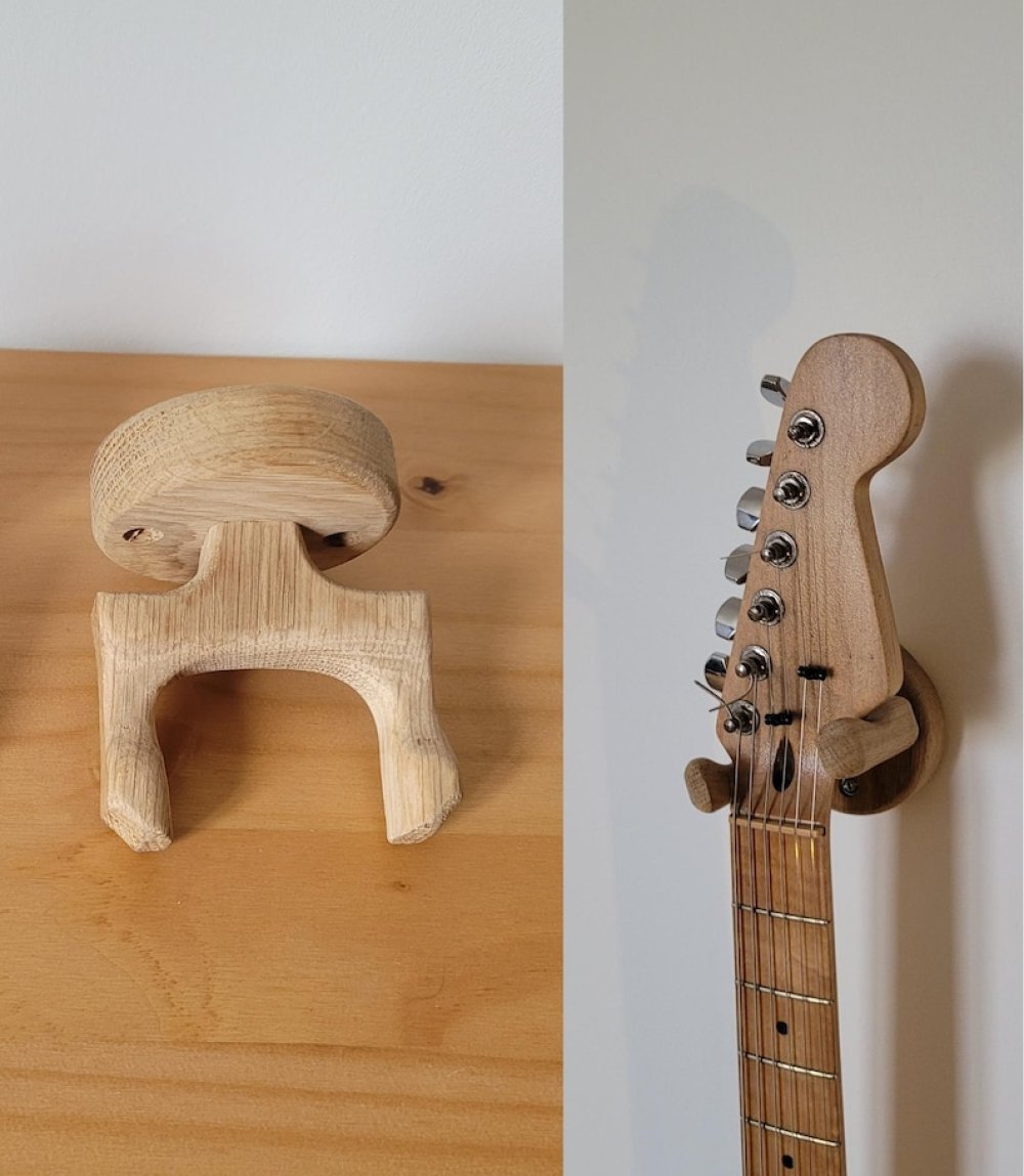 Support mural guitare en chêne, fait main en Normandie. Solide, sûr et élégant, il s’adapte à la plupart des guitares et basses. Facile à fixer, crochet pivotant, idéal pour protéger votre instrument ou offrir un cadeau unique à un musicien