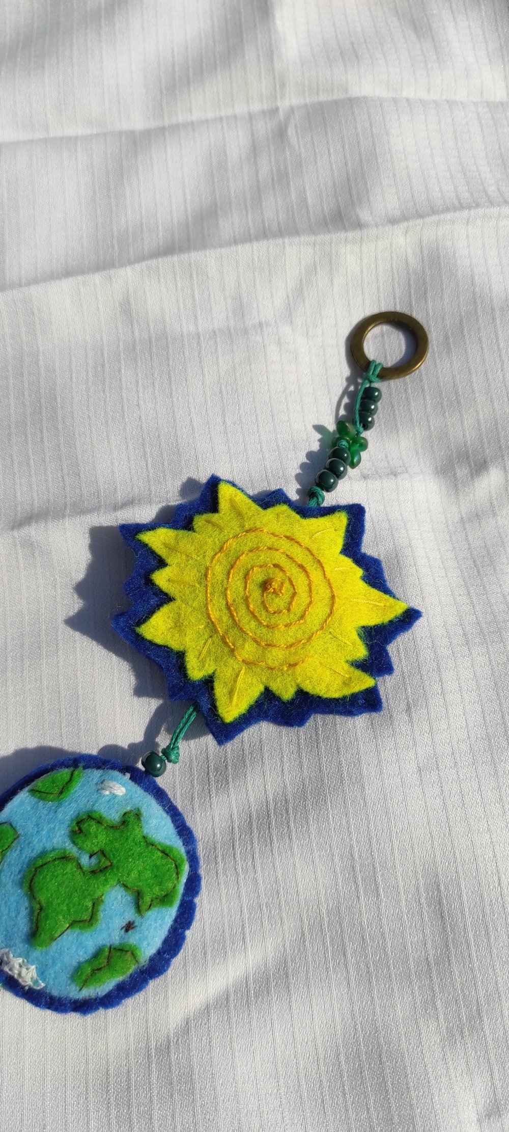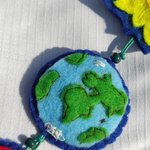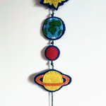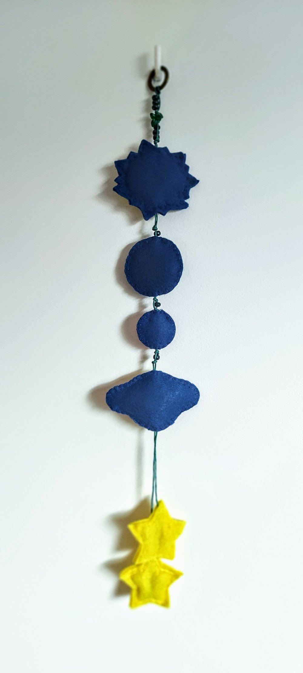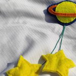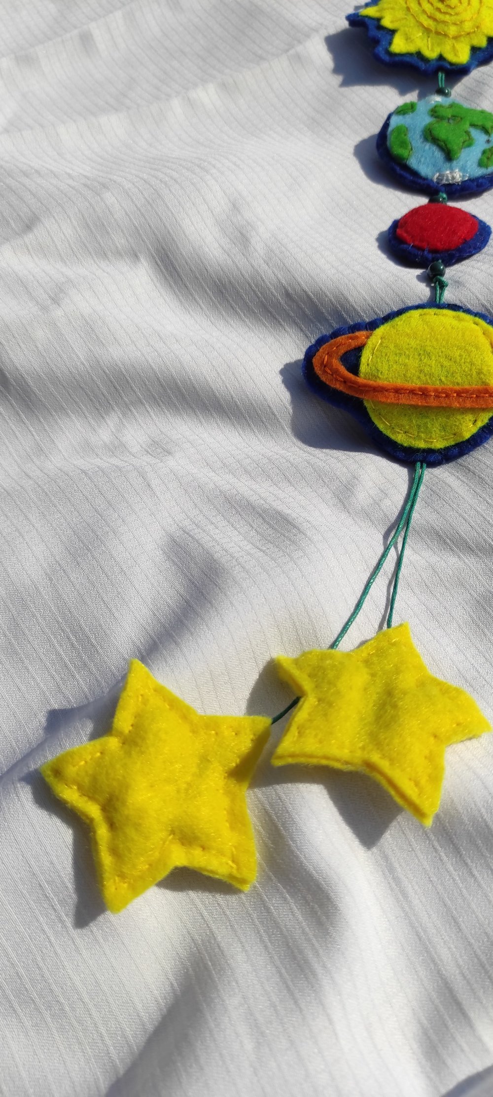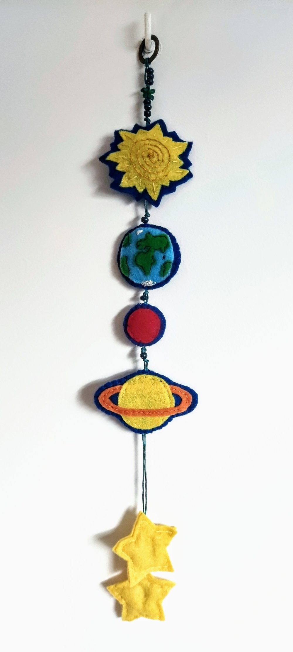 Cette suspension est composée de 4 items sur l'espace ( le soleil, la terre, mars, saturne), terminé par deux étoiles , le tout réalisé en feutrine, reliés sur des fils de coton enduits, avec au sommet un anneau d'accrochage colori bronze. ( ⚠️Les anneaux peuvent différer d'une commande à l'autre selon stock et arrivage merci)