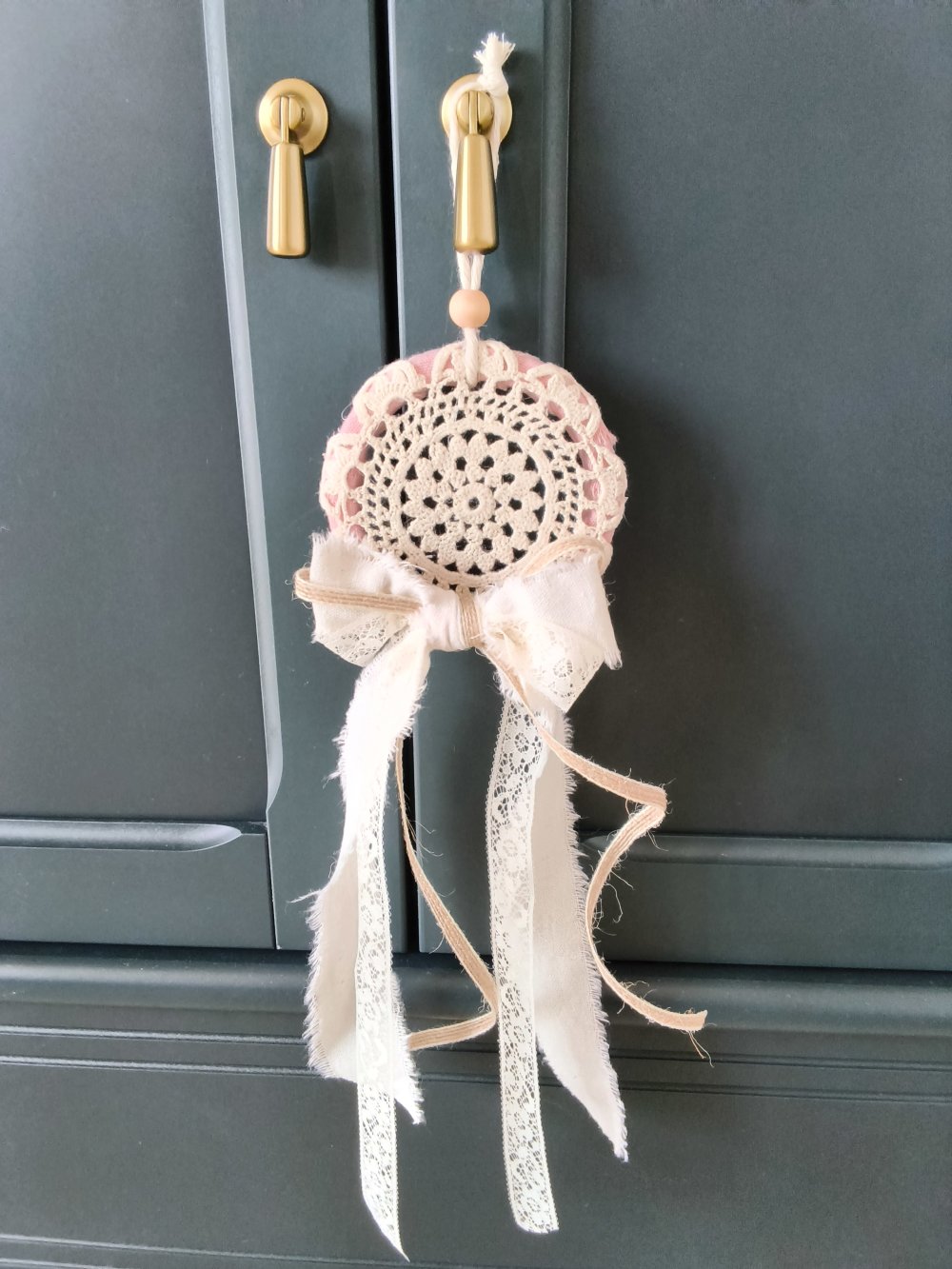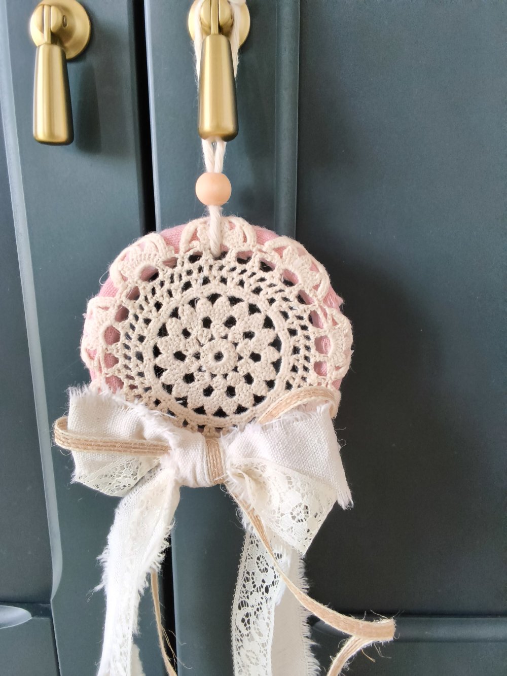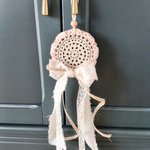 Suspension décorative artisanale de style bohème, réalisée à partir d’un napperon crocheté délicat, agrémentée de rubans en tissu, dentelle et coton aux tons doux (écru, beige, rose poudré). Ornée d’un joli nœud et suspendue par une corde naturelle avec perle en bois. Idéale pour décorer une poignée de porte, une armoire, un mur ou une chambre à l’ambiance romantique et chaleureuse. Pièce unique, faite main.✨