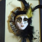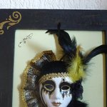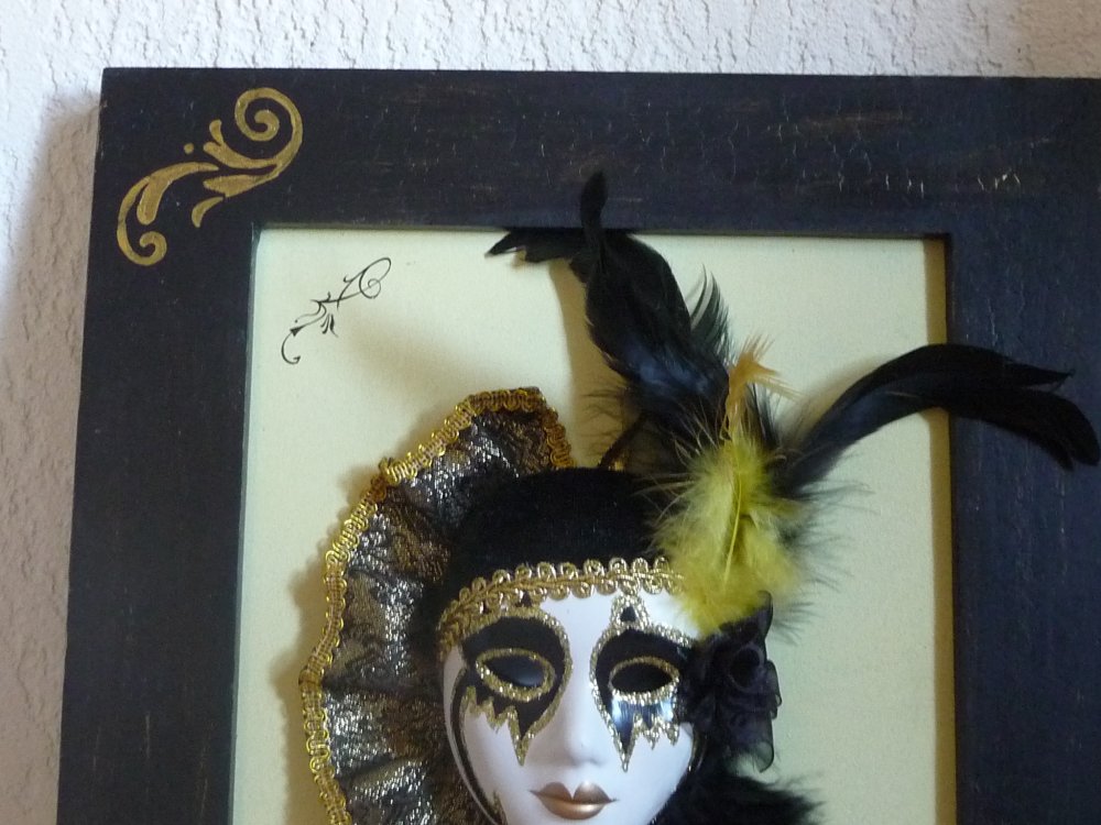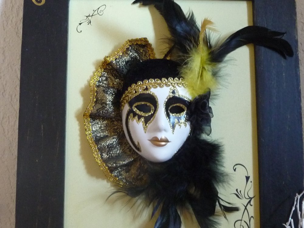 Le fond du tableau est peint en jaune et volutes rappelant les plumes du masque .j'y ai déposé un superbe et véritable masque vénitien acheté au cours d'un voyage à Venise lors du somptueux carnaval mondialement connu