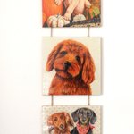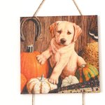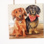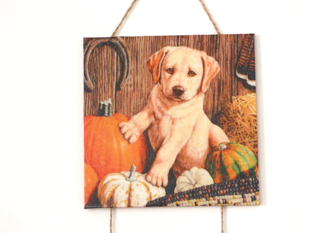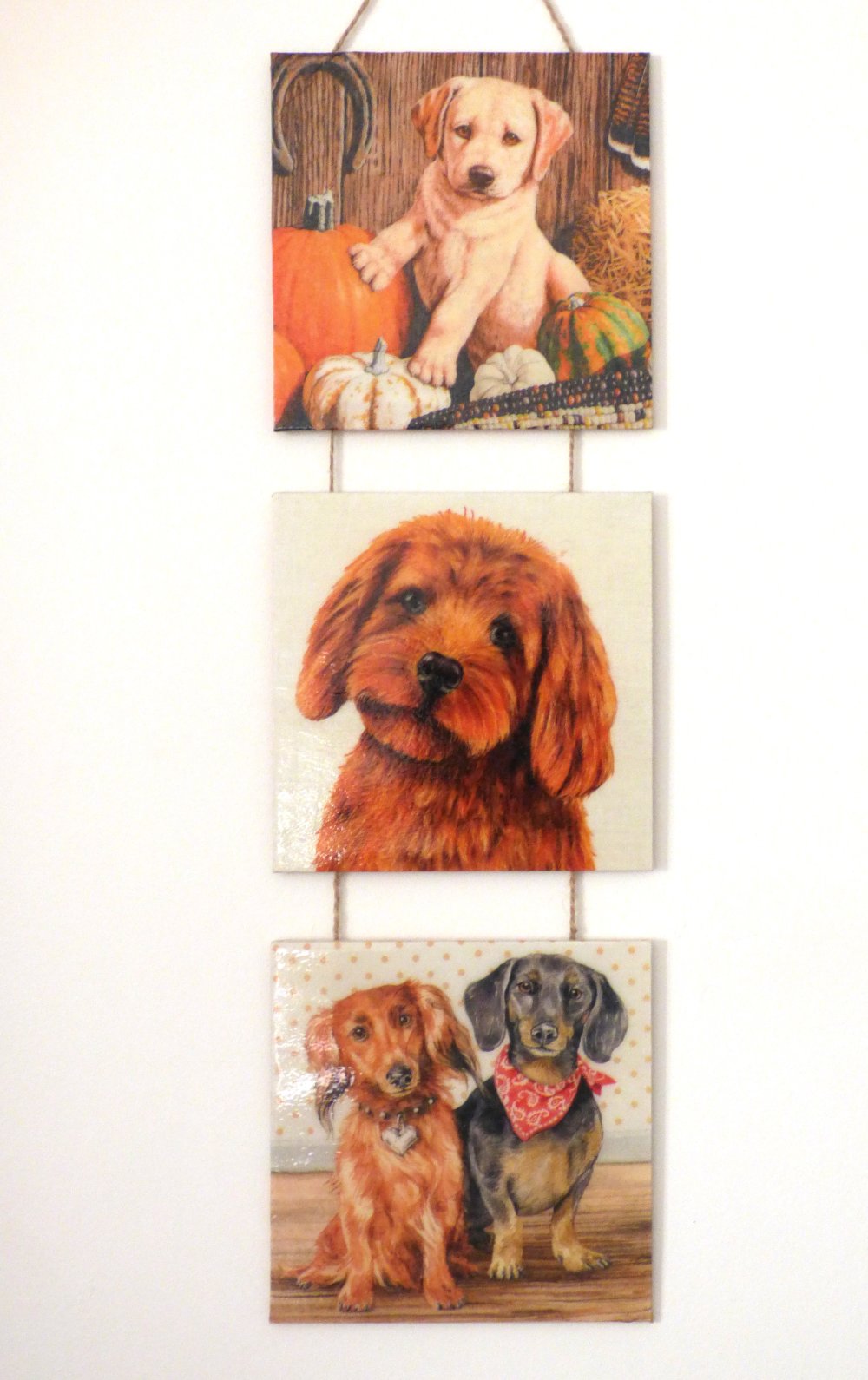 tons orangés pour ce tableau d'adorables petits chiens!! serviettage sur bois medium, 2 couches de vernis brillant , papier au dos ficelle de jute;