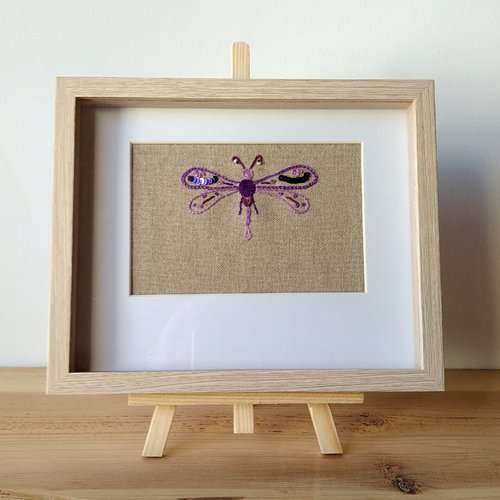J'ai brodé une libellule dans un camaïeu de violet, agrémentée de quelques perles et paillettes. Le tissu utilisé est du lin naturel écru.