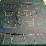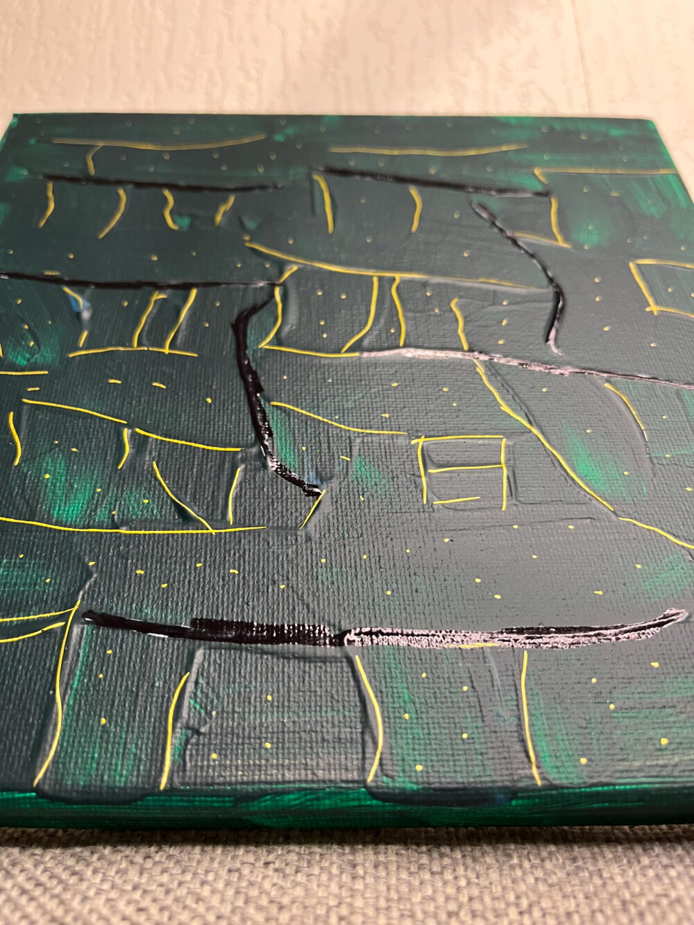 Une œuvre qui explore la force des cicatrices et des fissures. Sur un fond sombre, des éclats de doré et de vert viennent souligner les reliefs, comme des lumières qui persistent malgré les brisures.