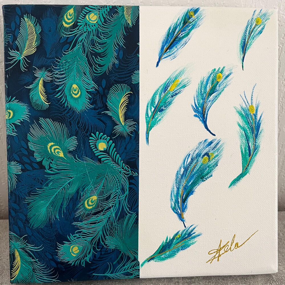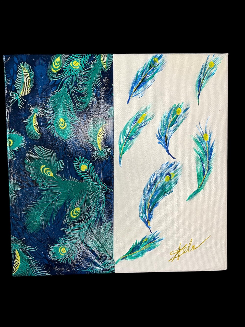 Entre densité et légèreté, cette toile joue sur le contraste : un côté vibrant de plumes foisonnantes, l’autre épuré de plumes peintes à main levée. Une œuvre qui invite à ressentir la dualité entre le plein et le vide, entre le mouvement et le silence.