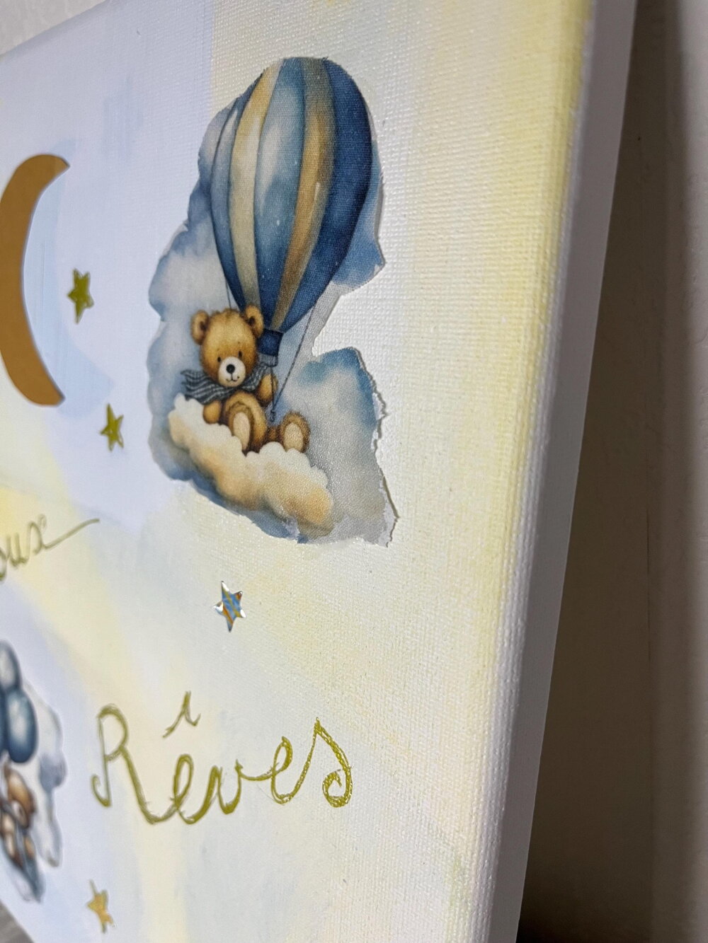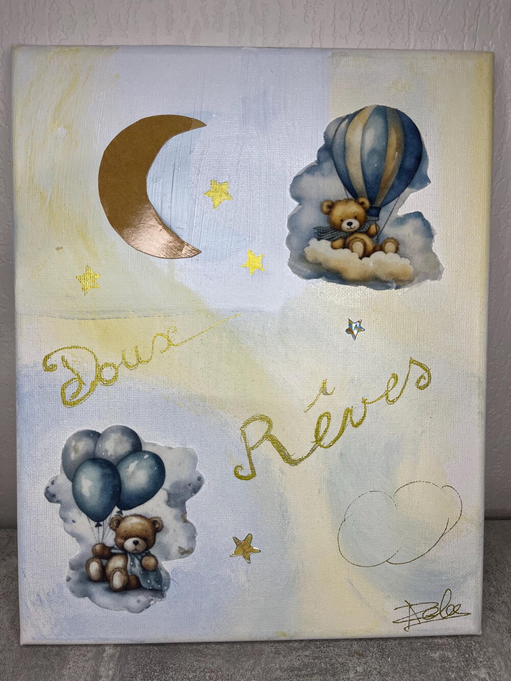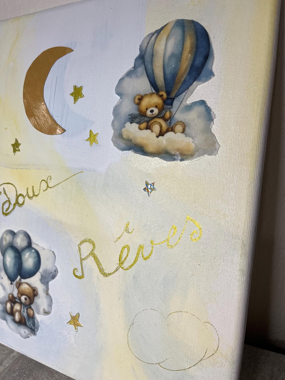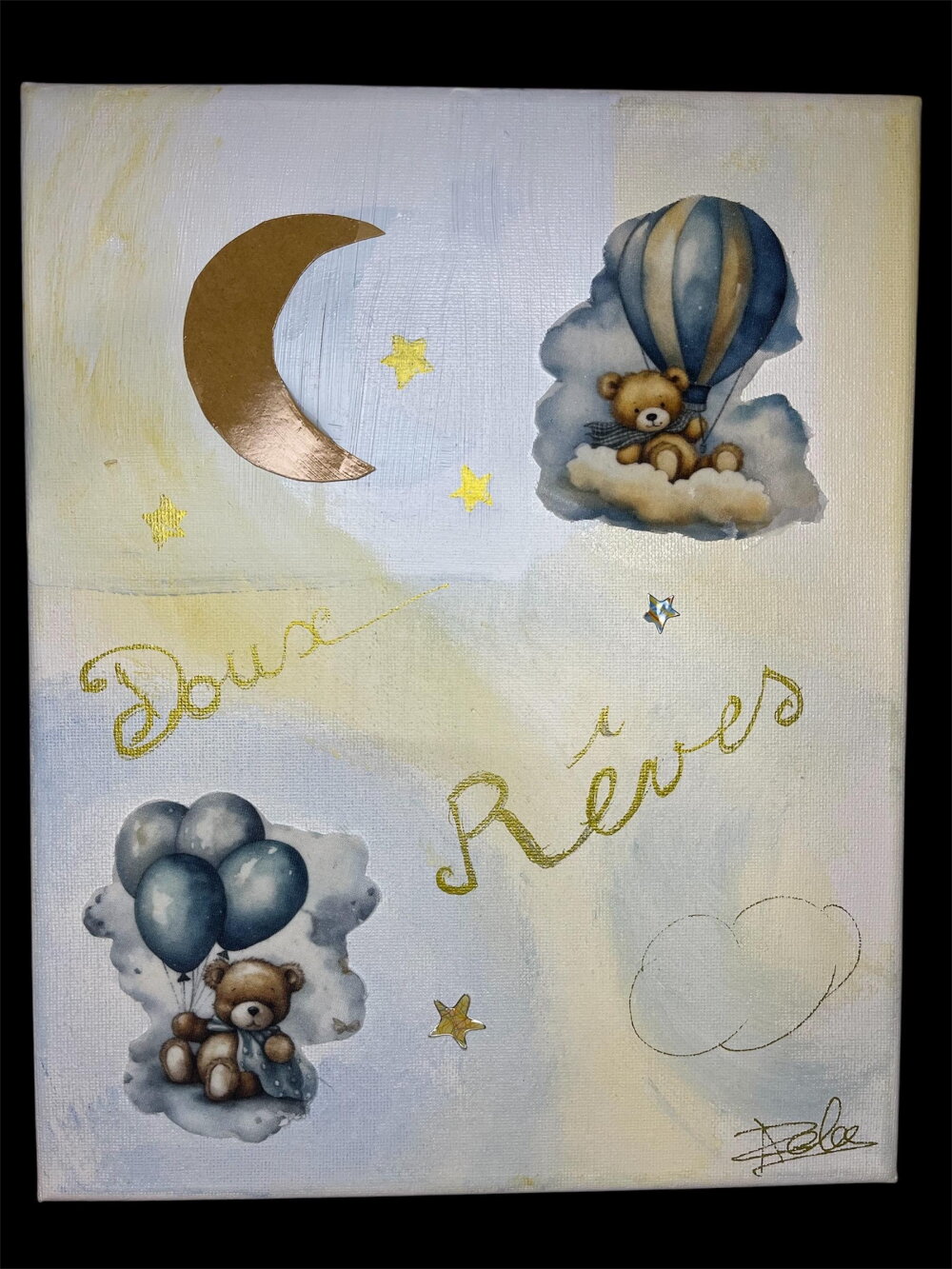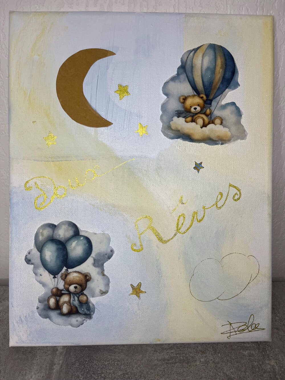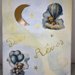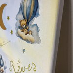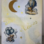 Tableau déco acrylique 24x30 cm, ambiance douce et poétique. Motif “Doux Rêves” avec oursons, nuages, ballons et lune dorée. Idéal pour chambre d’enfant.