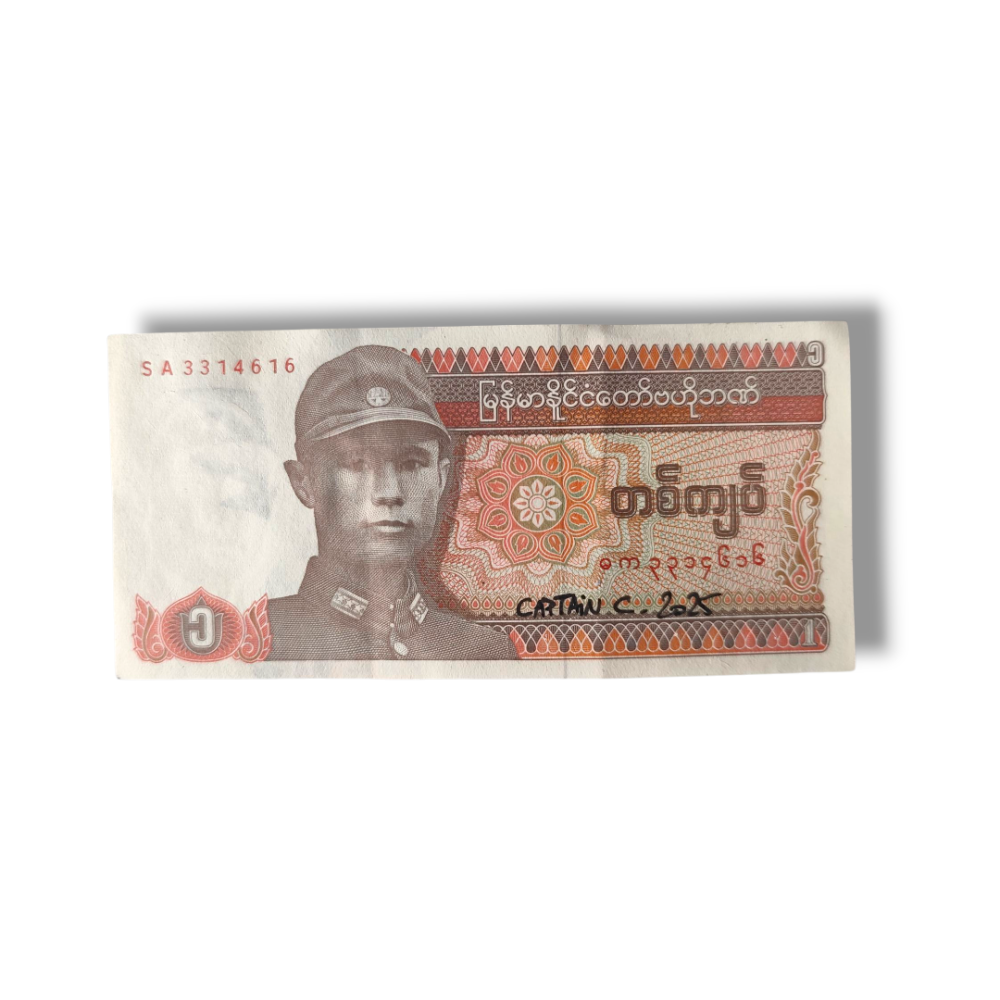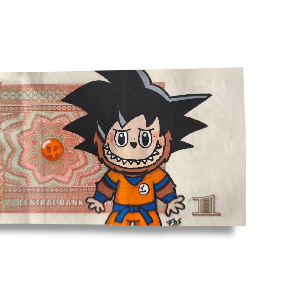 Création unique réalisée à la main par Captain Custom : un billet de Birmanie transformé en toile d’art, représentant Labubu version Goku.