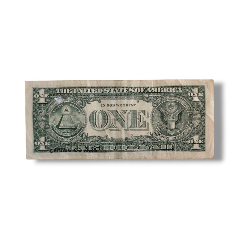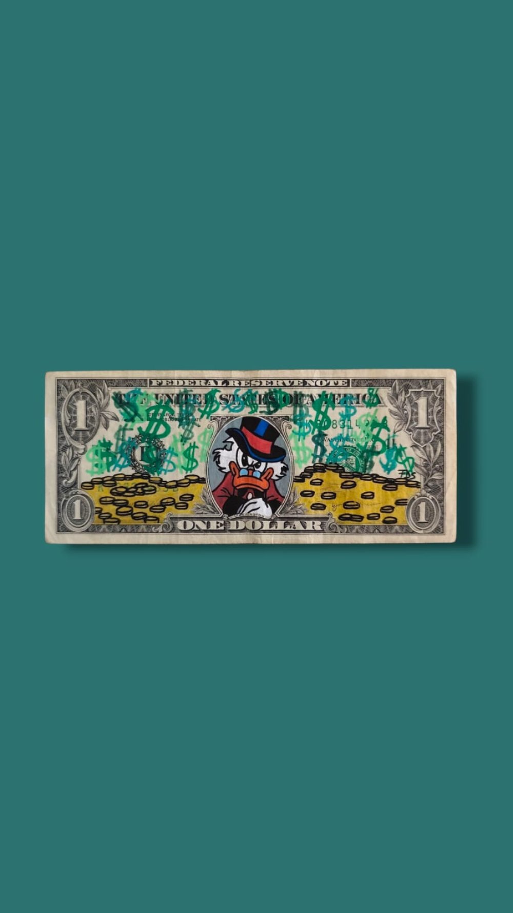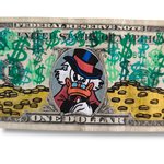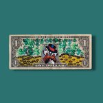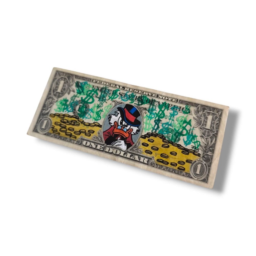 Sur un véritable billet de 1 dollar, Picsou veille sur son tas d’or dans un univers coloré et décalé.