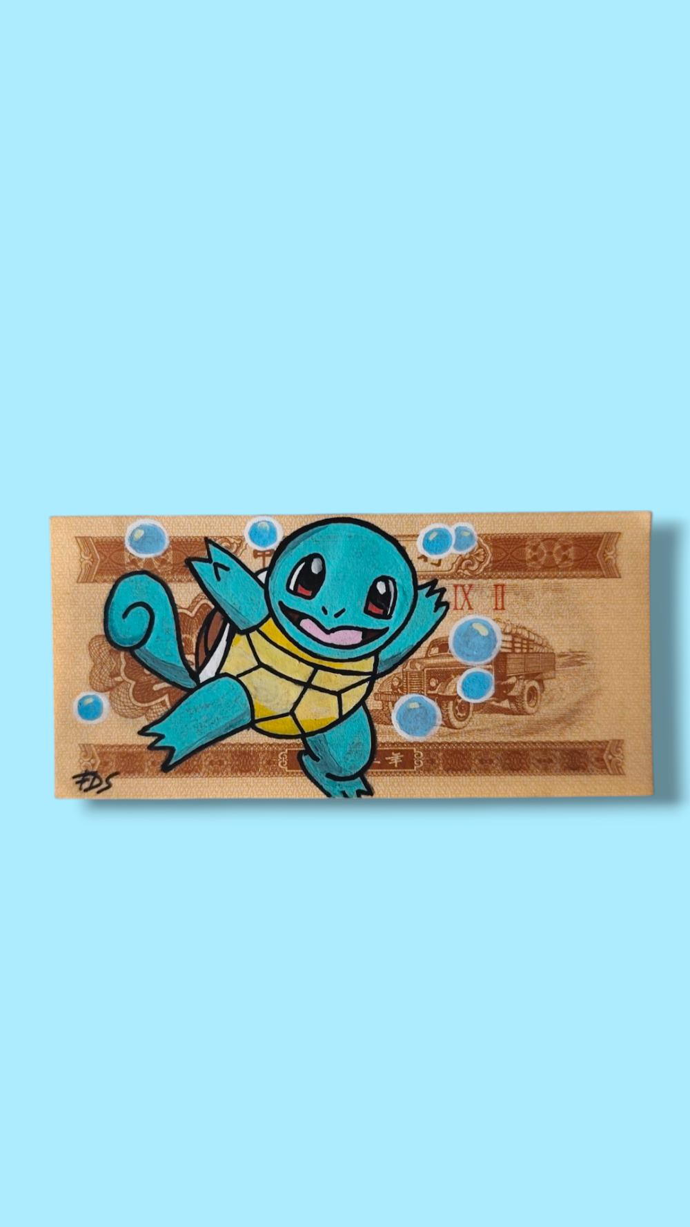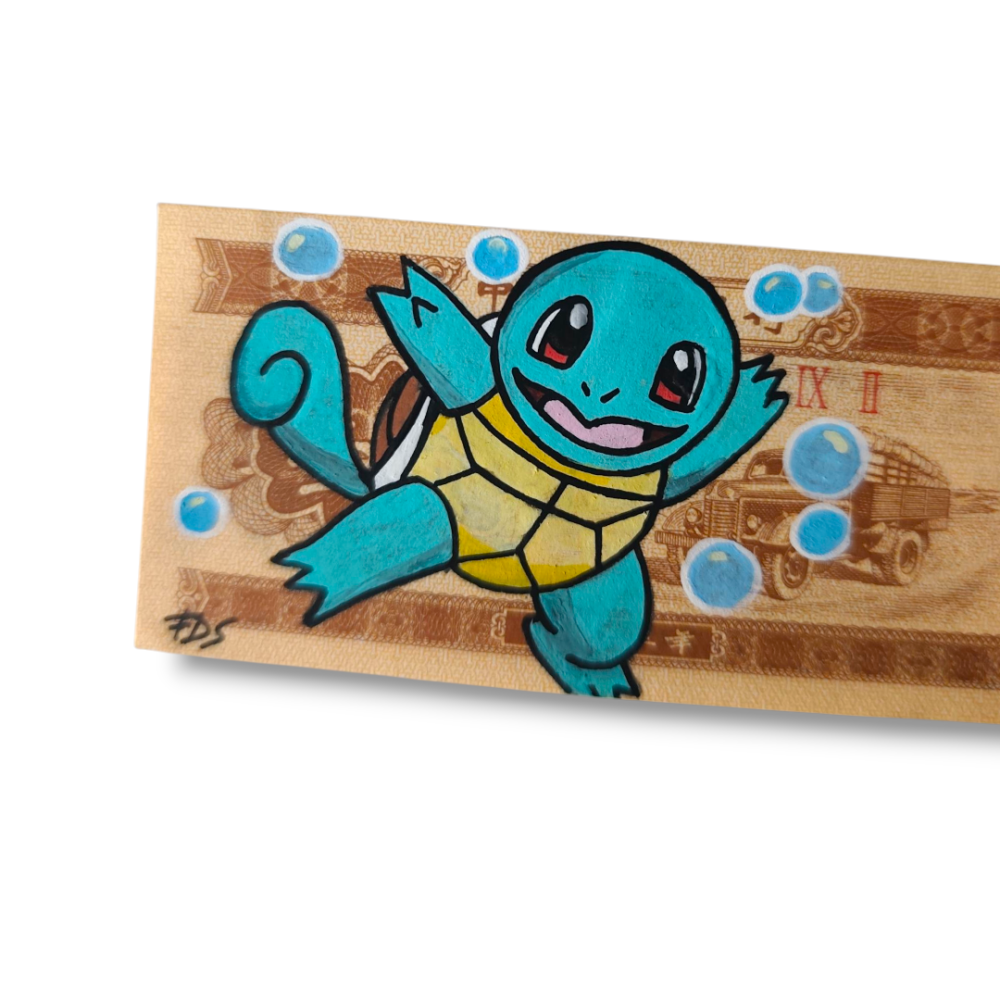 Voici Carapuce, le célèbre Pokémon, illustré à la main sur un billet chinois authentique.