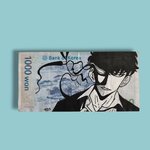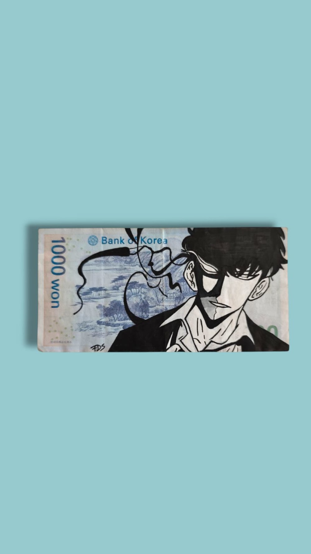 Hommage à Sung Jinwoo, le célèbre chasseur de Solo Leveling, dessiné à la main sur un billet coréen de 1000 won.
