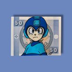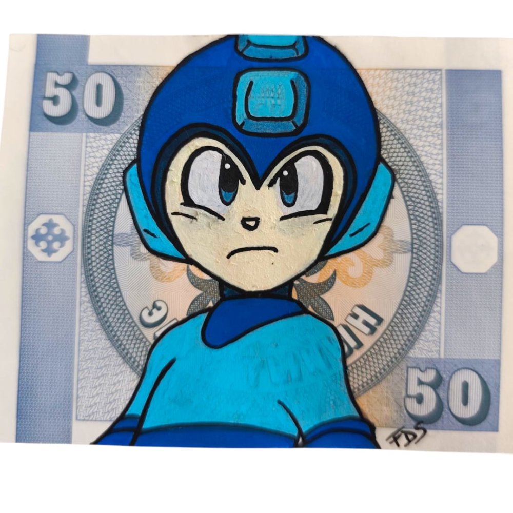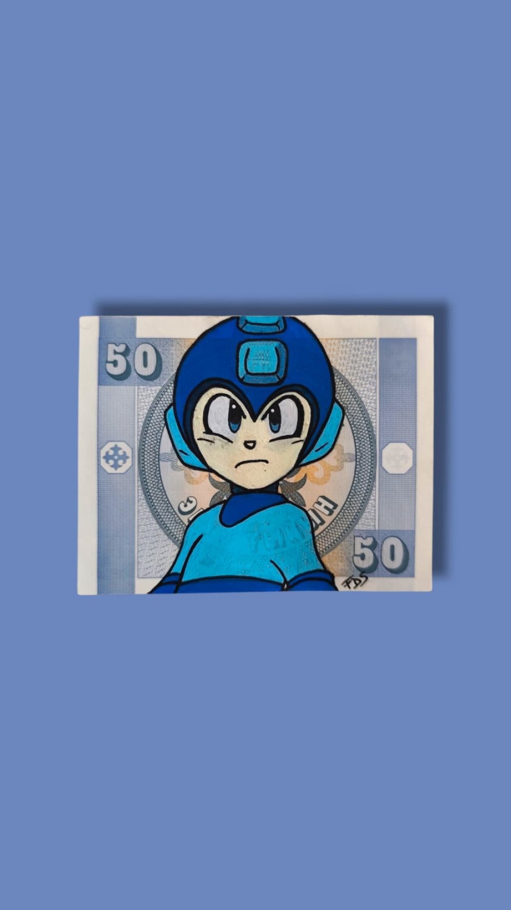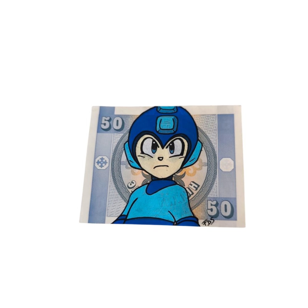Ce dessin de Mega Man est réalisé à la main sur un billet authentique de 50 tenge (Kazakhstan).