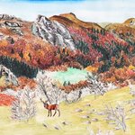 Dessin extrait de mes contes, représentant un cerf dans les monts du Cantal à l'automne. à l'arrière plan, le Roc d'Hozières.