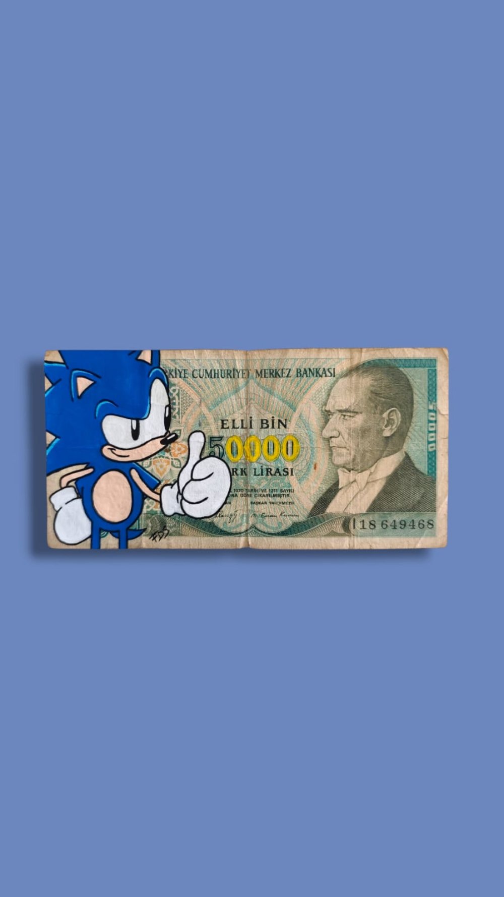 Ce dessin de Sonic, entièrement fait main, est réalisé sur un billet authentique de 50 000 livres turques 🇹🇷.