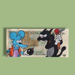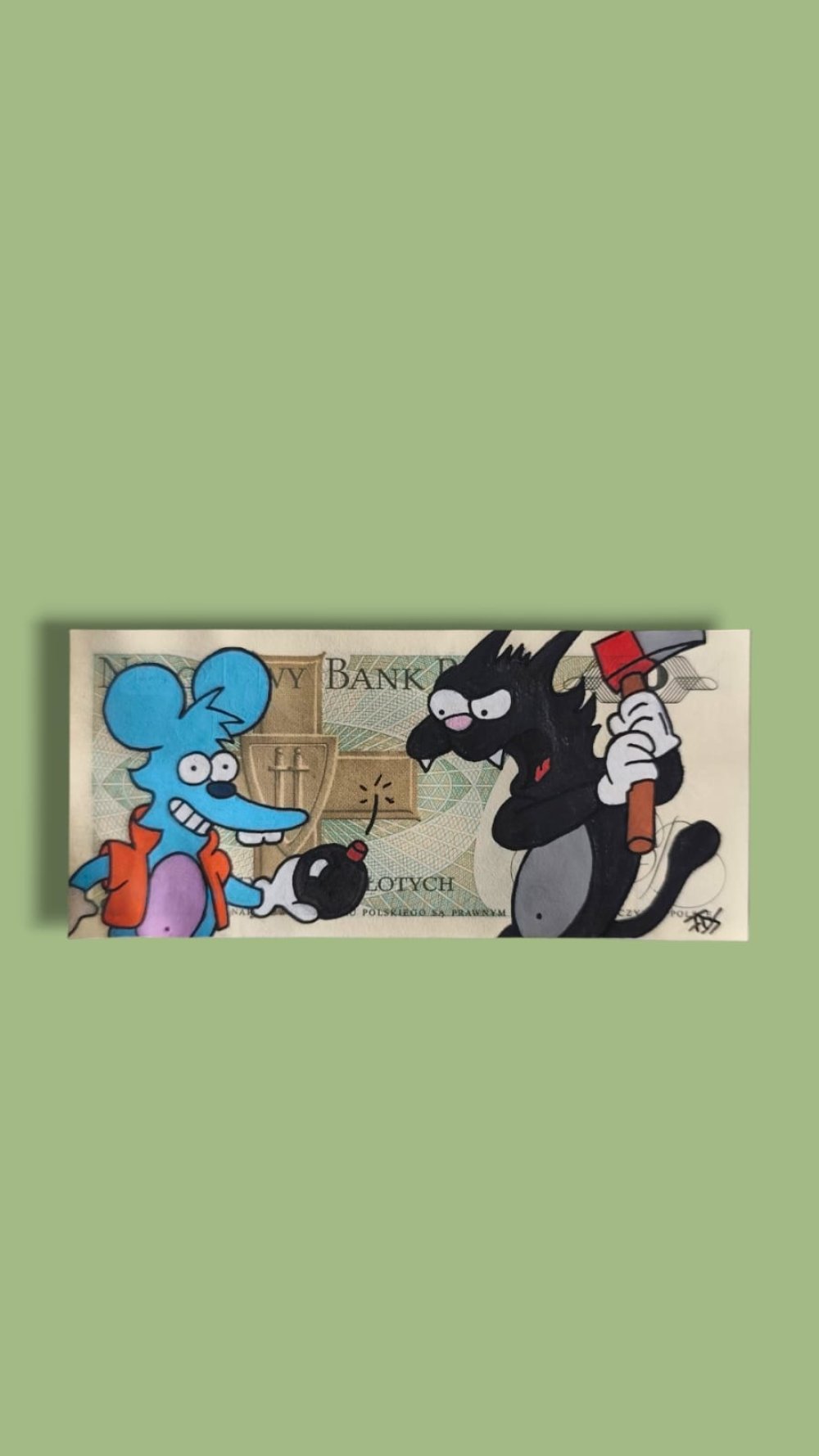 Cette œuvre atypique est peinte à la main sur un billet polonais, mettant en scène deux personnages iconiques dans une ambiance humoristique et décalée. Chaque détail est soigné, pour une décoration murale unique et pleine de personnalité.