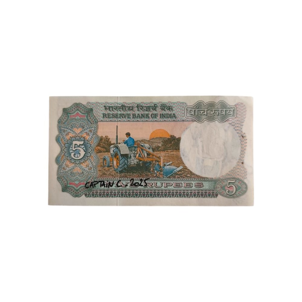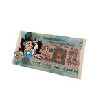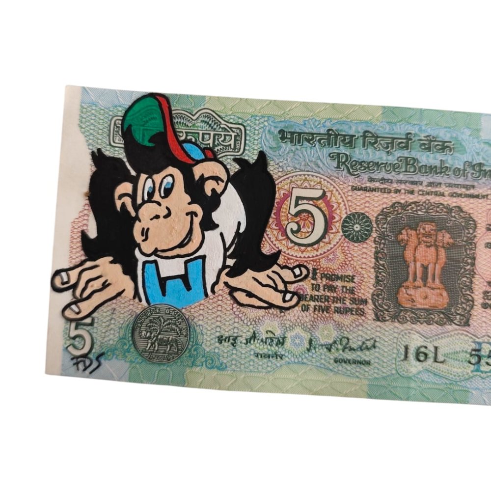Ce billet authentique de 5 Roupies indiennes est entièrement peint à la main pour lui offrir une seconde vie artistique pleine de charme et d’humour.