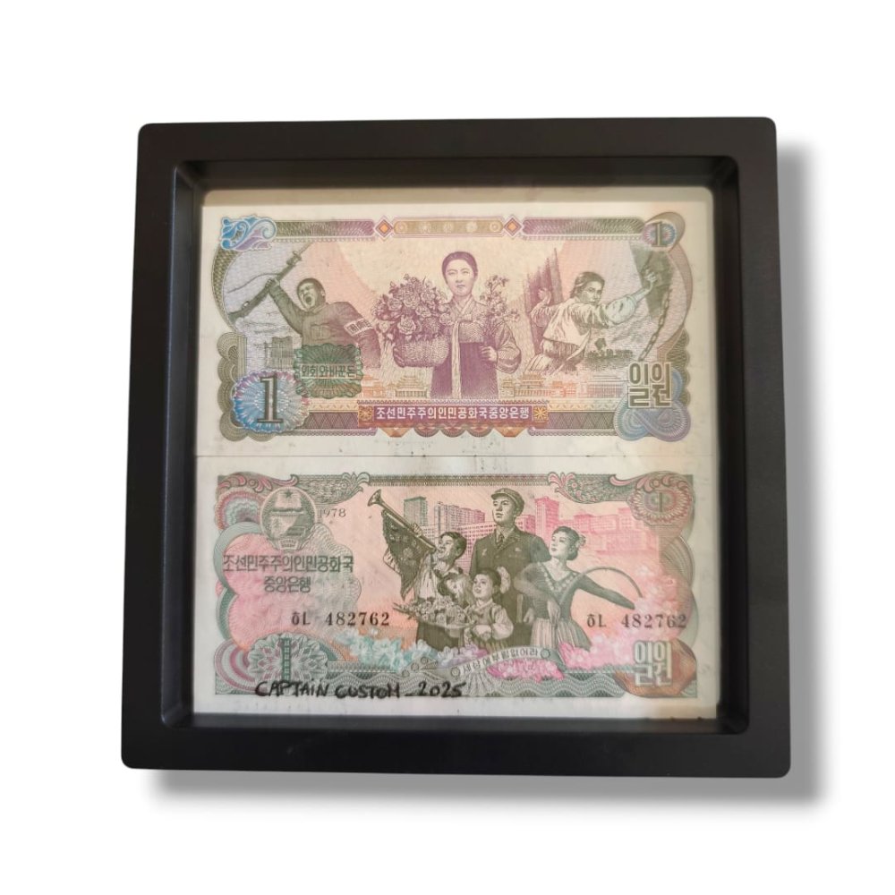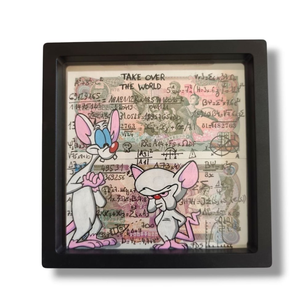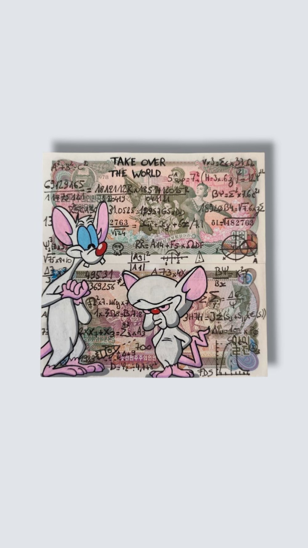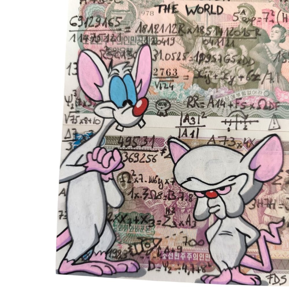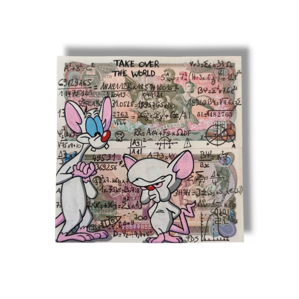 Cette création rare met en scène Minus et Cortex (Pinky and the Brain) sur deux billets nord-coréens authentiques.