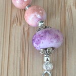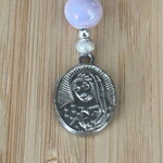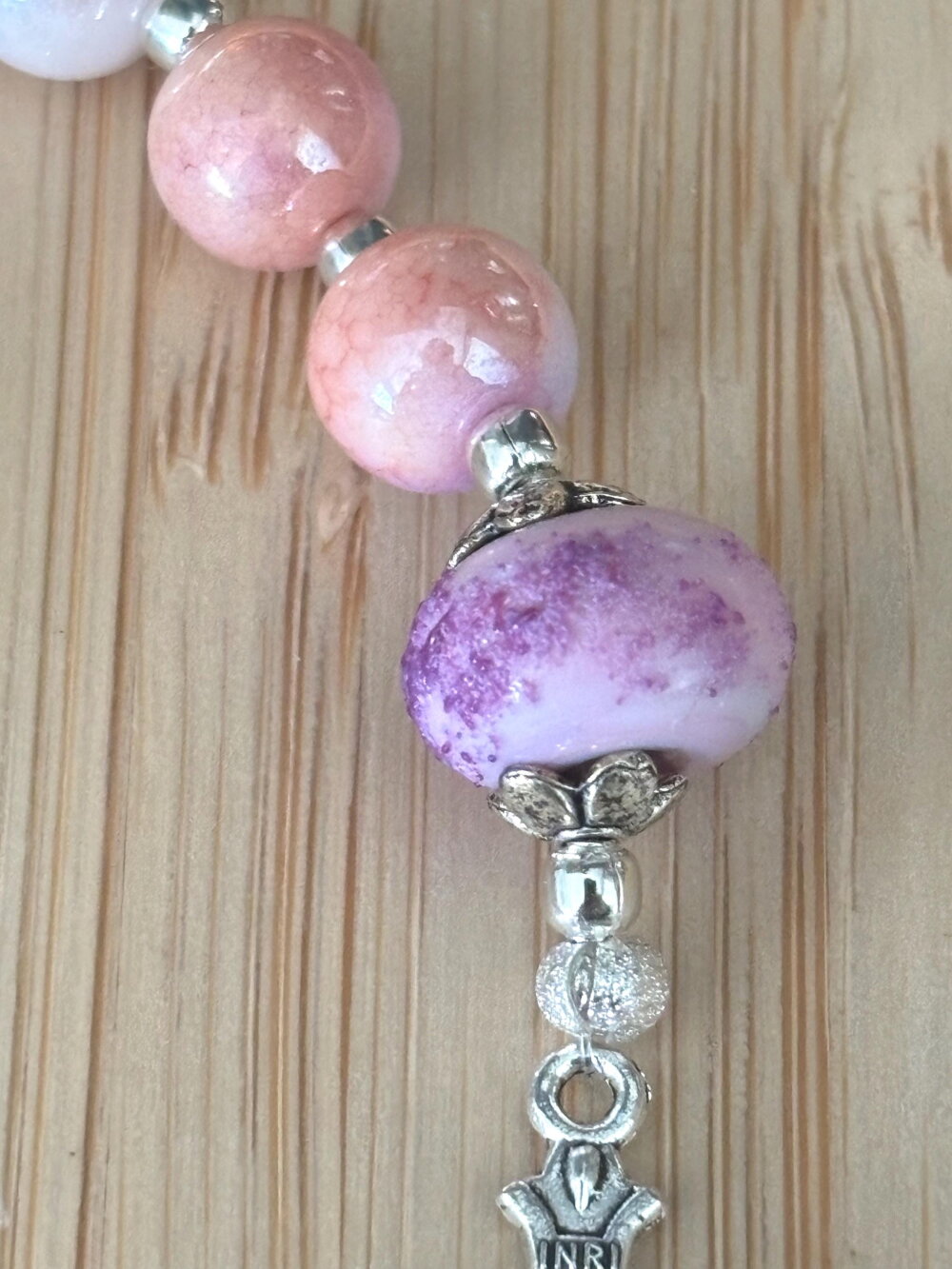 Dizainier perles rose marbré , composé de perles en verre et d’une perles en verre filée artisanale, en pièce centrale, croix chrétienne et médaillon de la vierge Marie assortie.