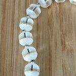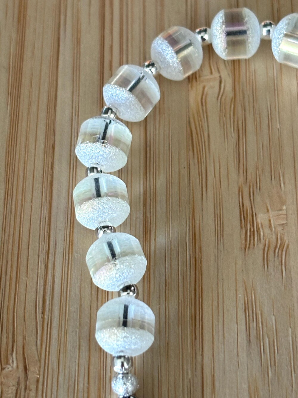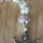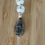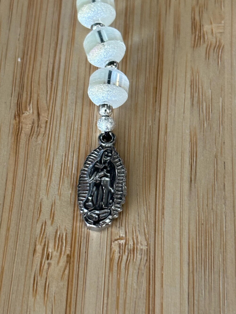Dizainier perles blanche givré mate, composé de perles en verre et d’une perles en verre filée artisanale, en pièce centrale, croix chrétienne et médaillon de la vierge Marie assortie.