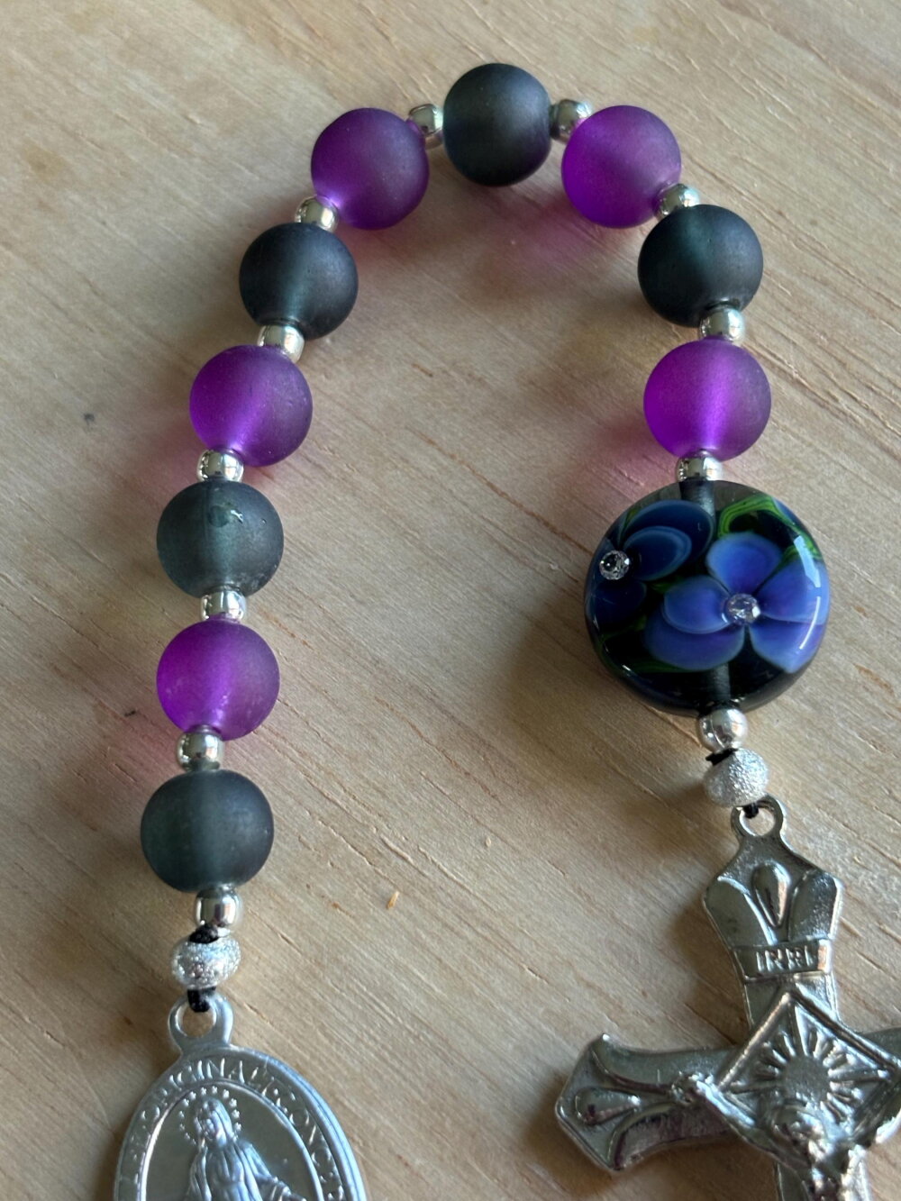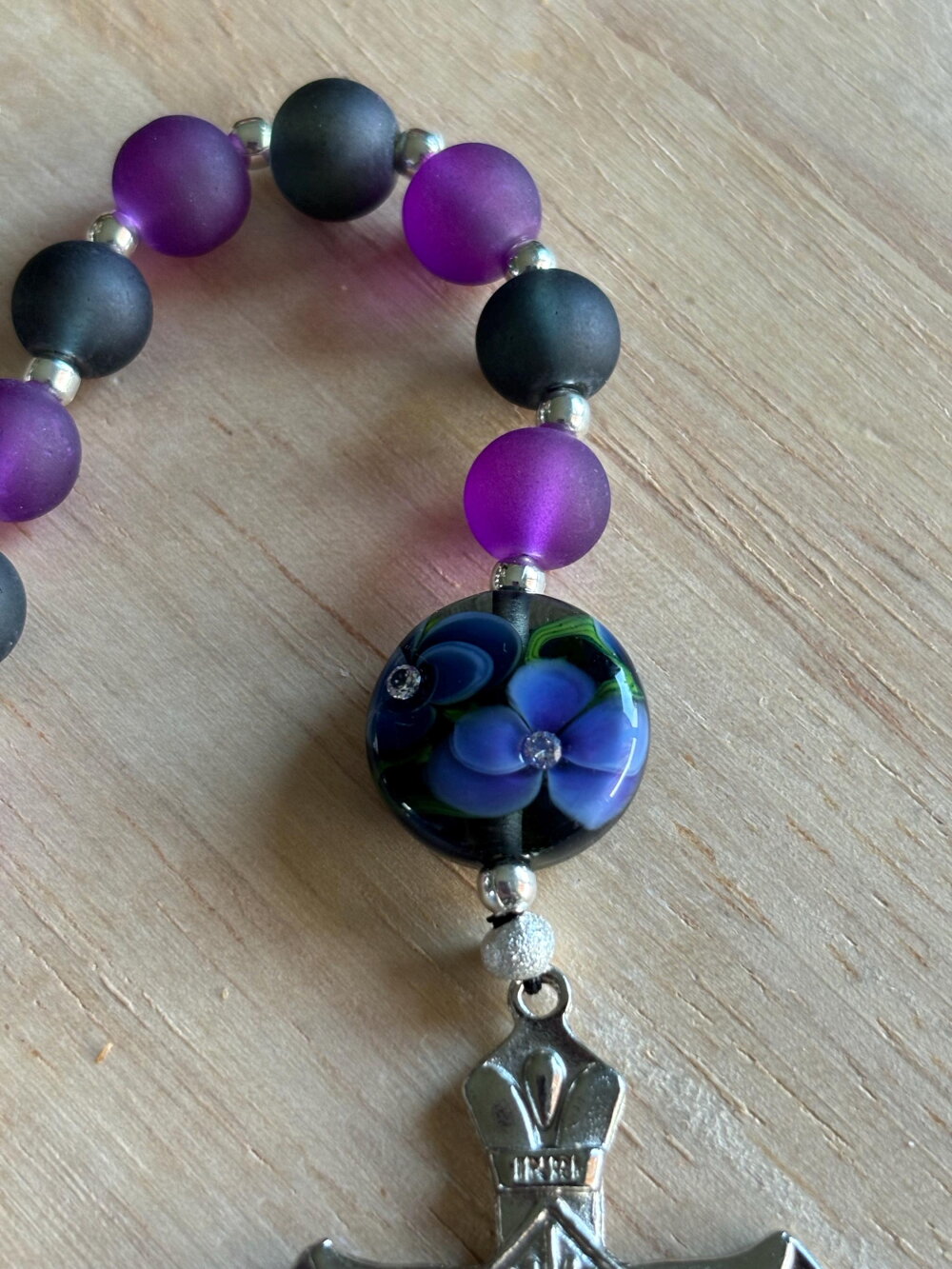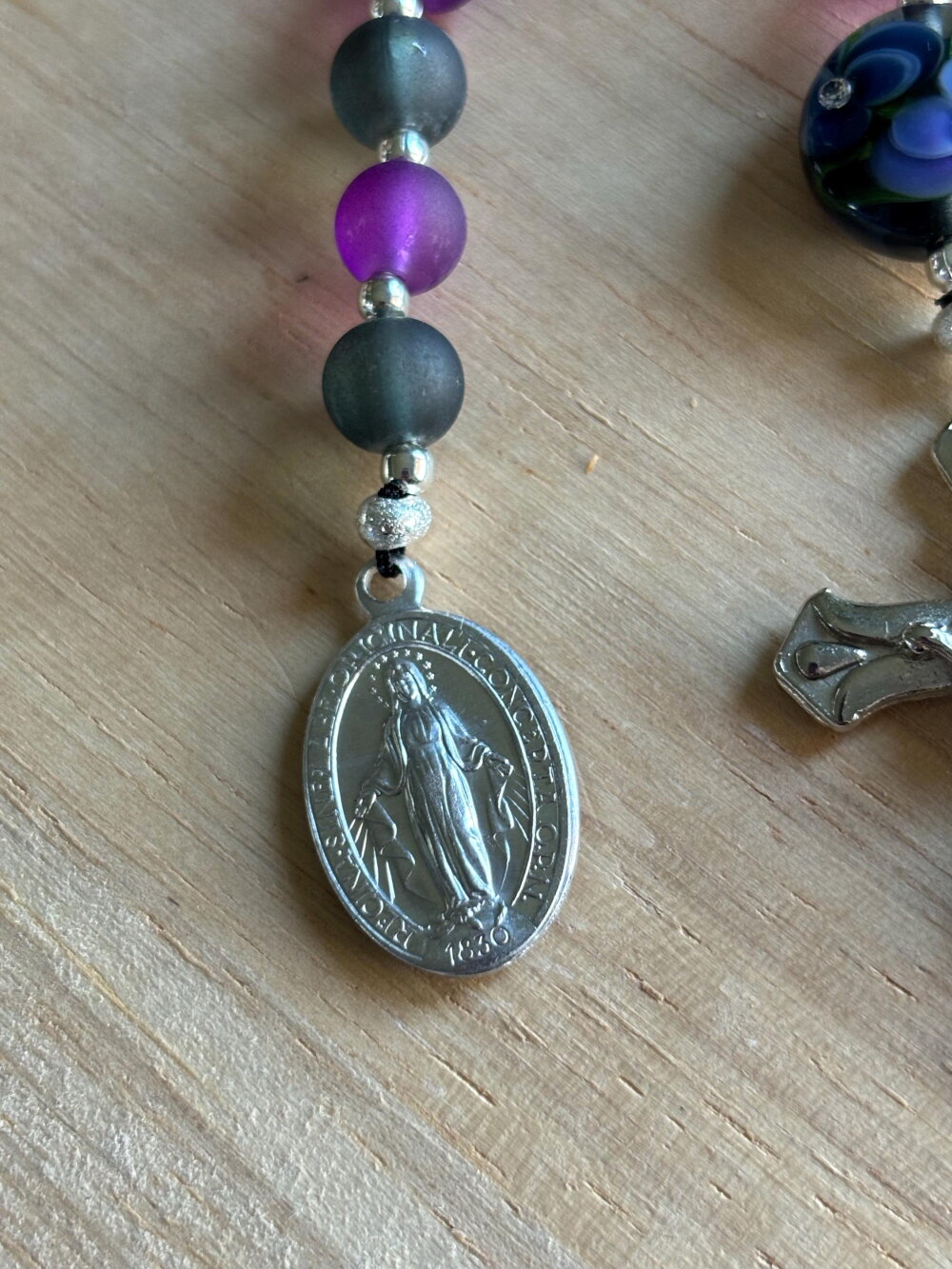 Dizainier Chrétien, chapelet Chrétien de poche composé de perles en verre dépoli noir et violet et d’une perle unique créer par un artisan verrier.