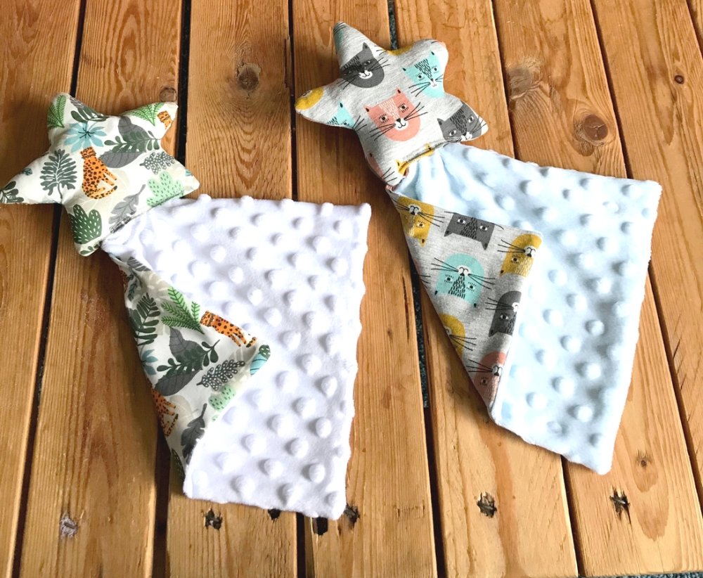 doudou plat bébé, doudou bébé en minkee et jersey, doudou etoile, cadeau bébé naissance