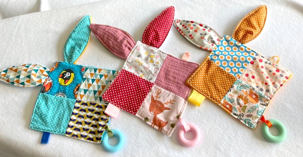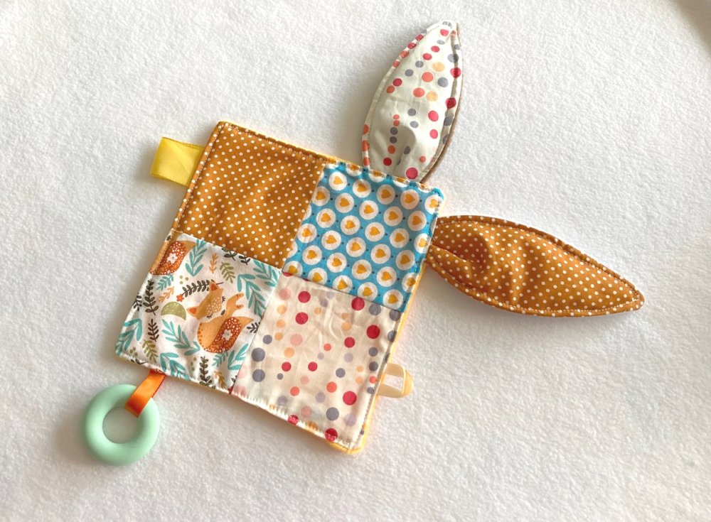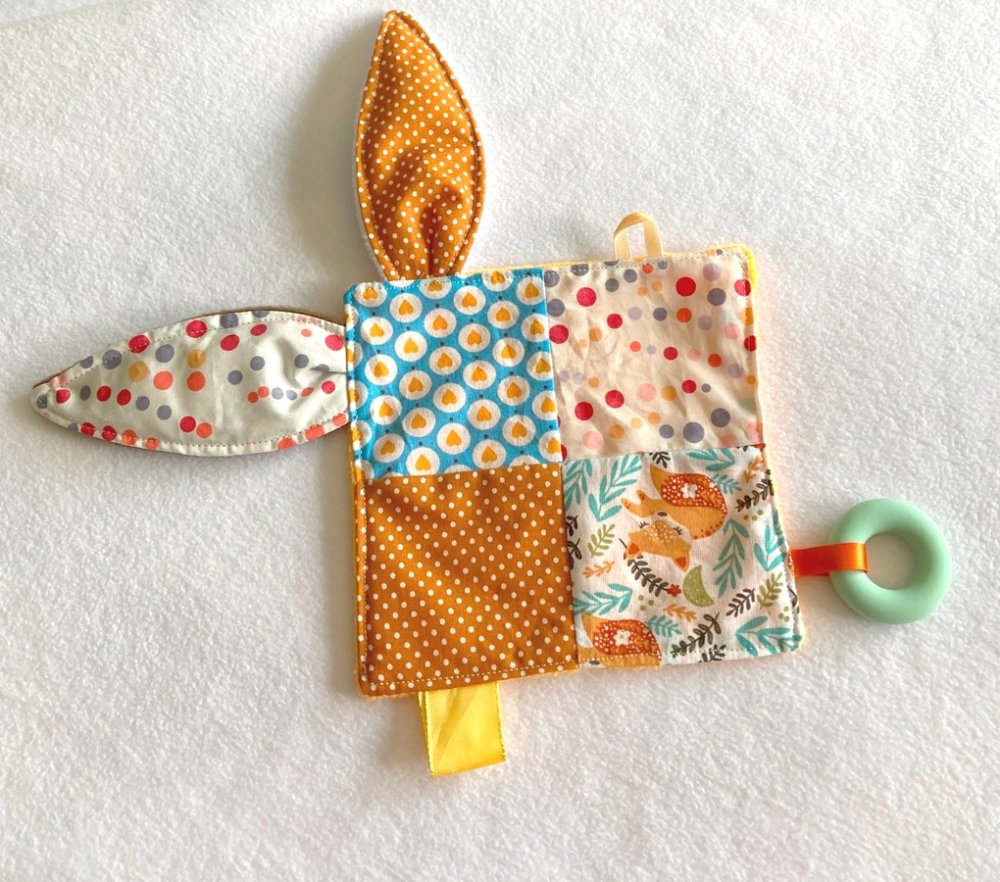 Doudou réalisé avec un assemblage de cotons différents, il est doublé en polaire toute douce