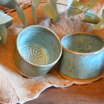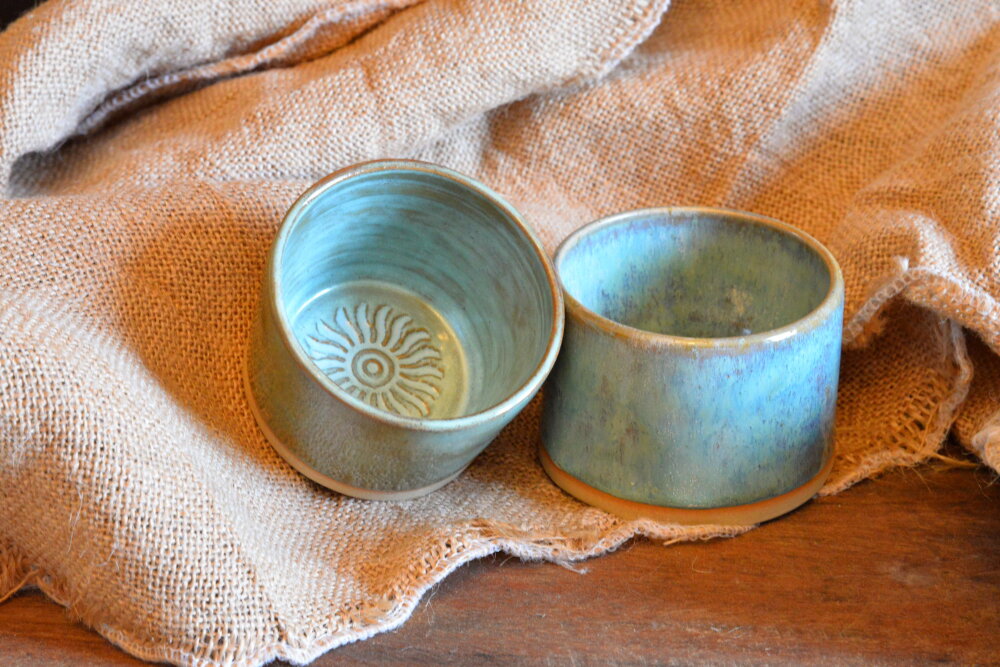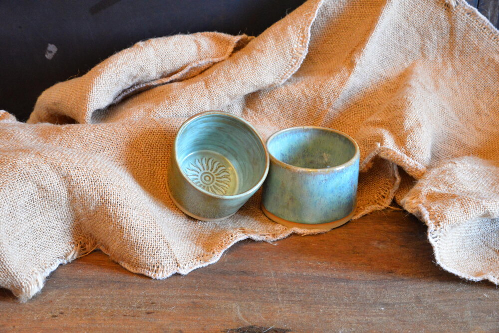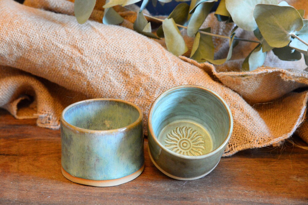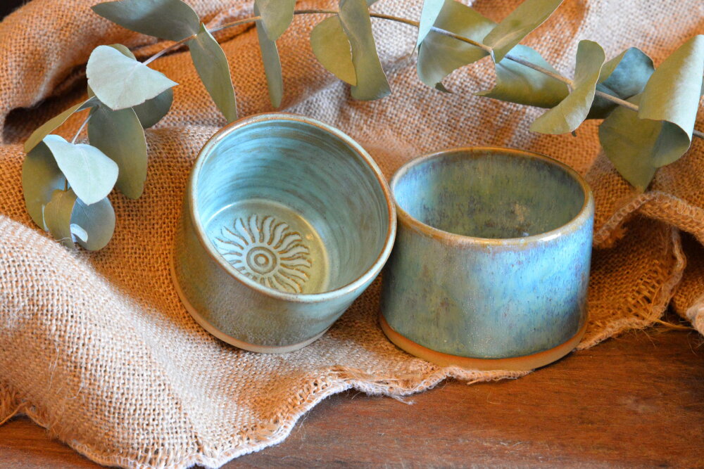 Ce sont 2 petits pots fait main qui peuvent avoir plusieurs fonctions. Une combinaison d'émaillage leur donne leur originalité dans la couleur.
