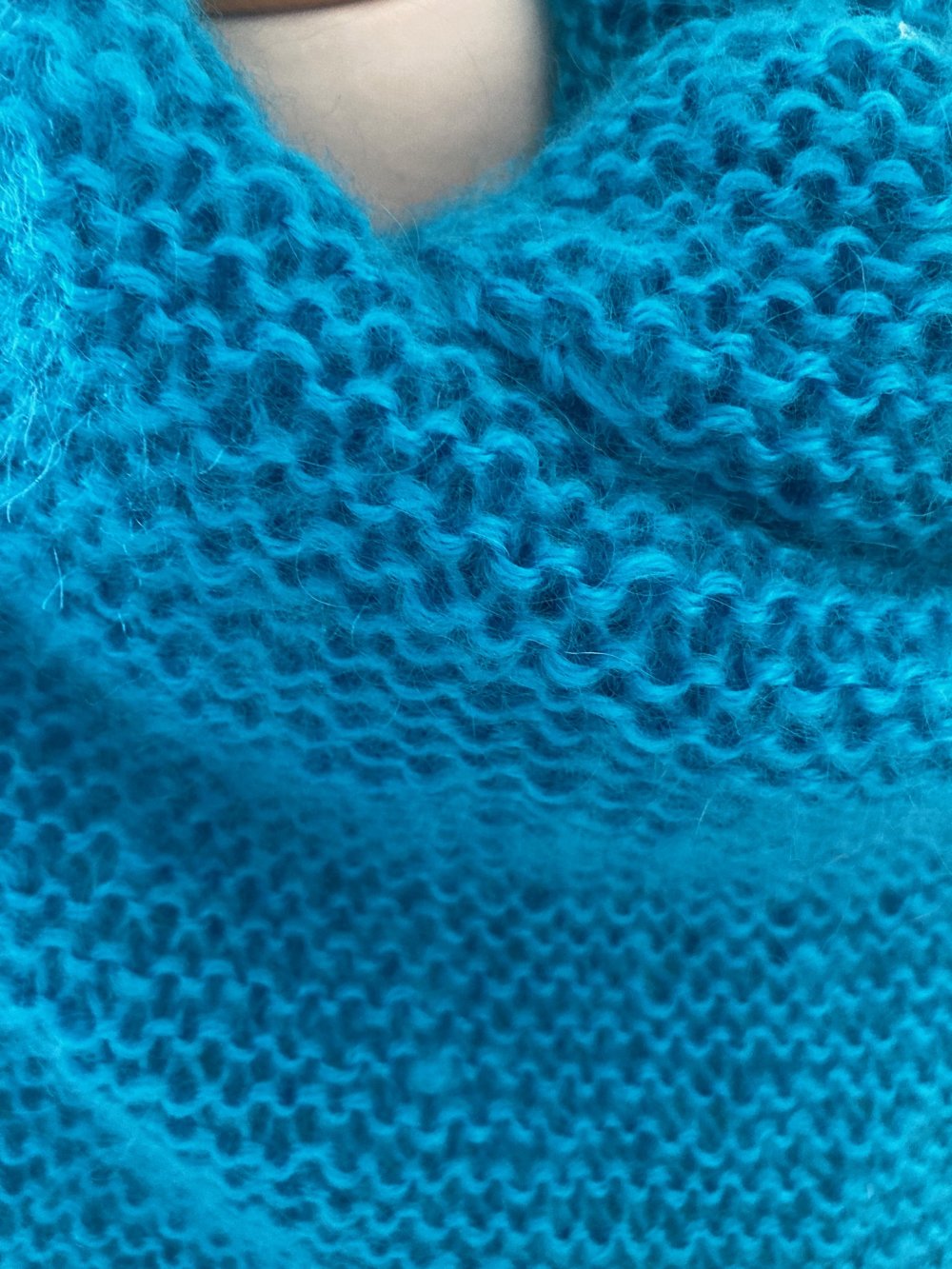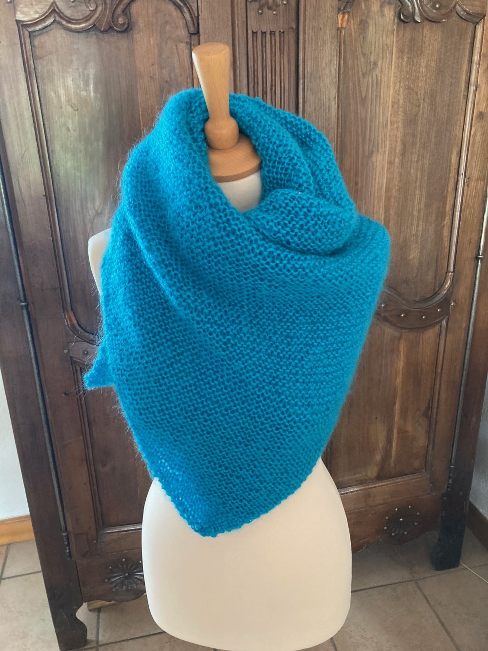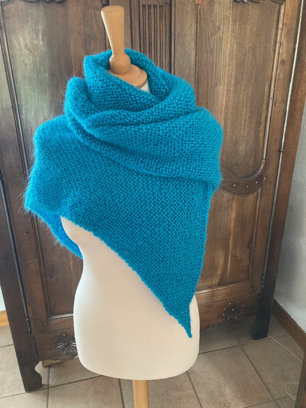 Douillet châle en laine tricoté main dans des laines contenant de la mohair. Très enveloppant pour les soirées fraiches.