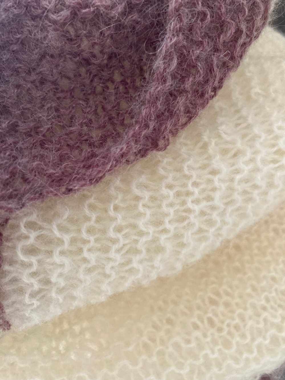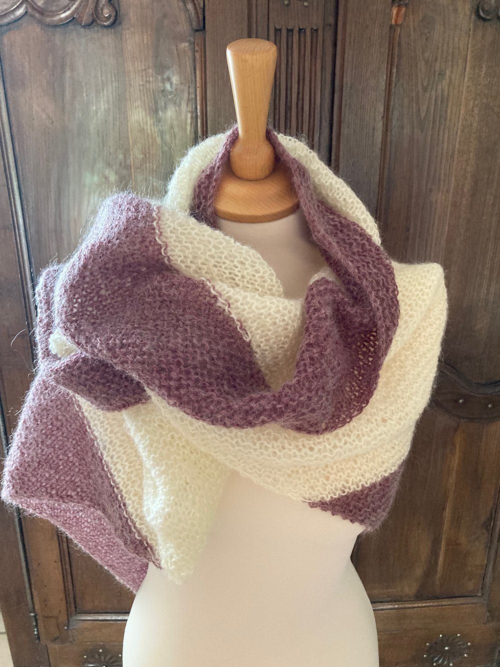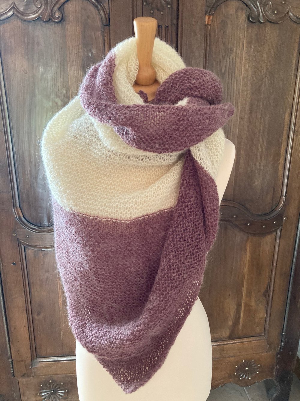 Douillet châle en laine tricoté main dans des laines contenant de la mohair. Très enveloppant pour les soirées fraiches.