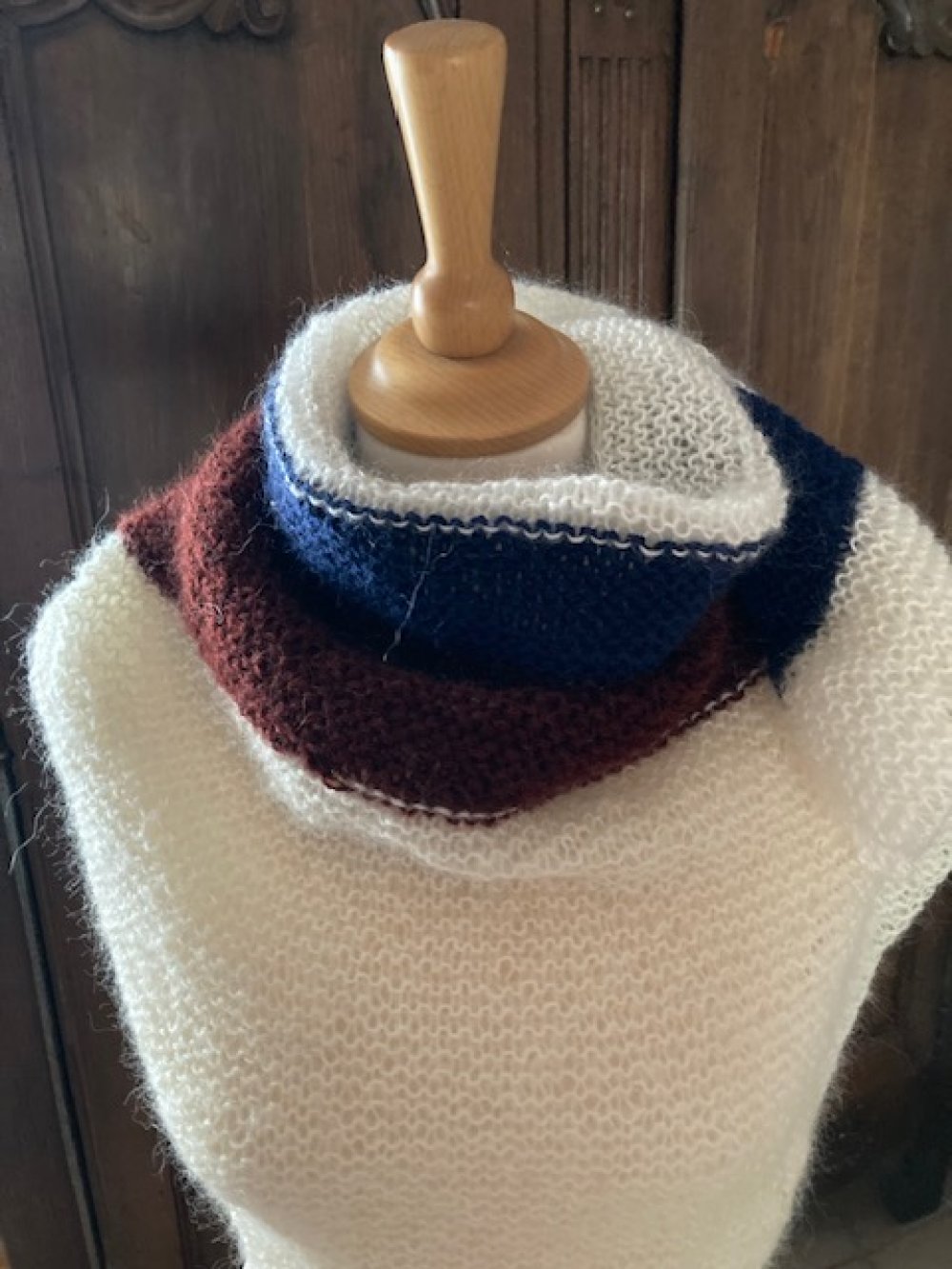 Douillet châle en laine tricoté main dans des laines contenant de la mohair. Très enveloppant pour les soirées fraiches.