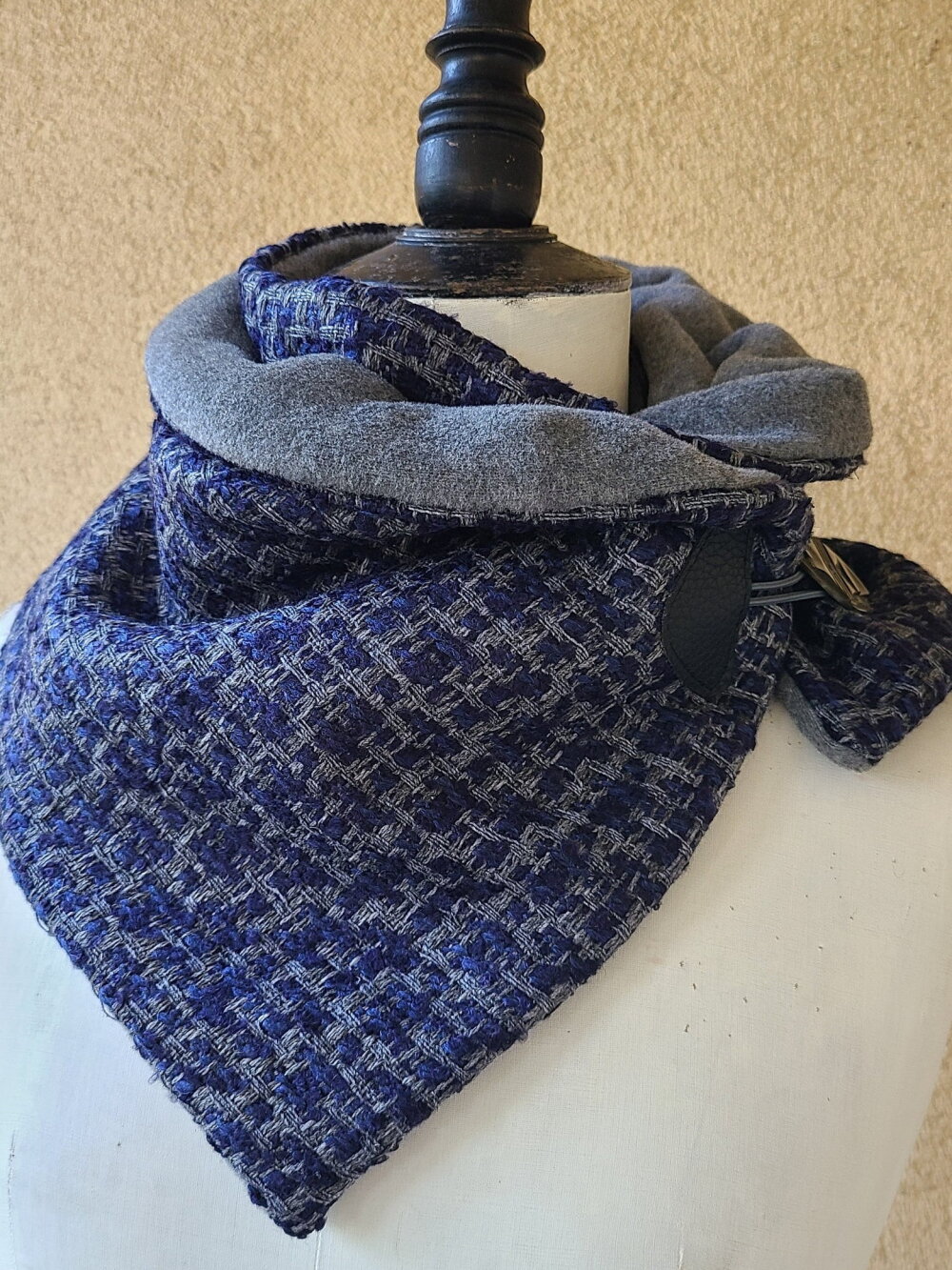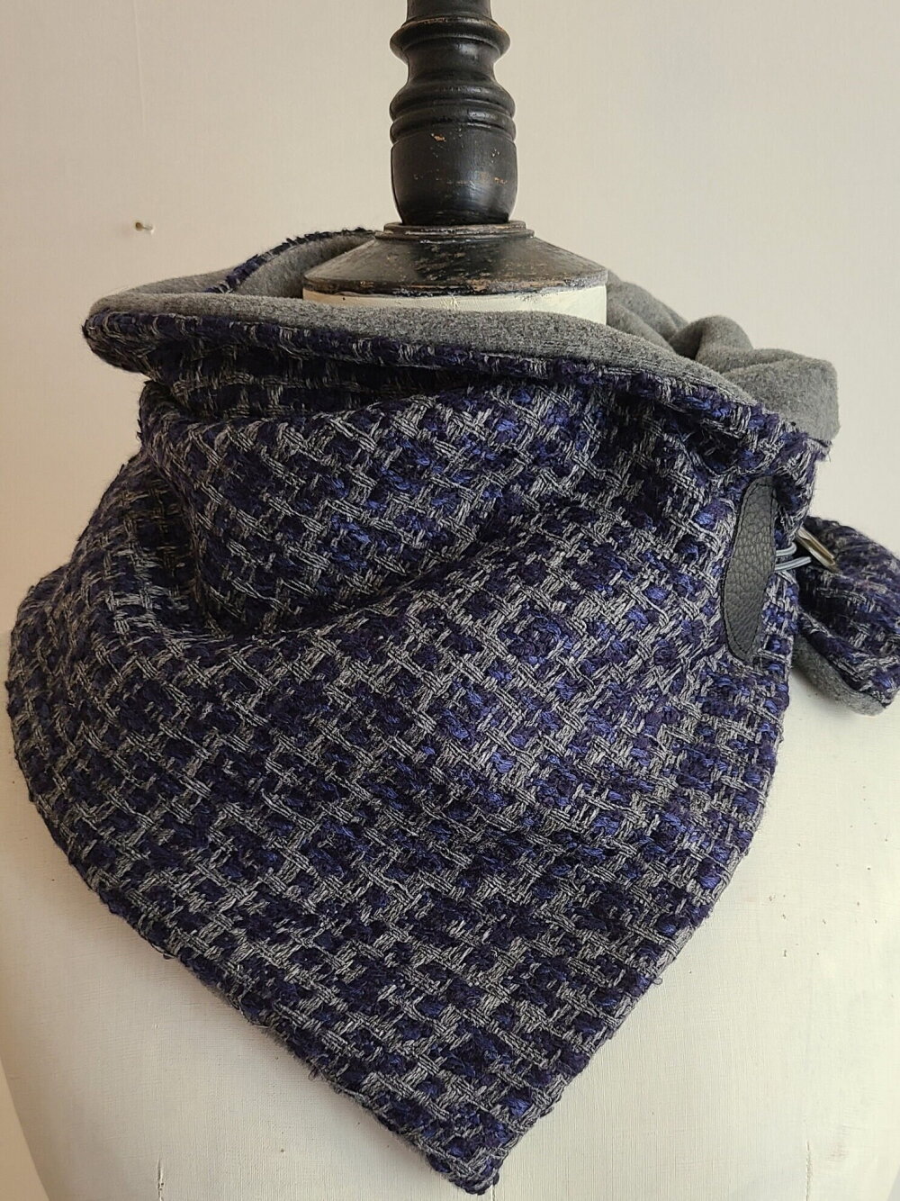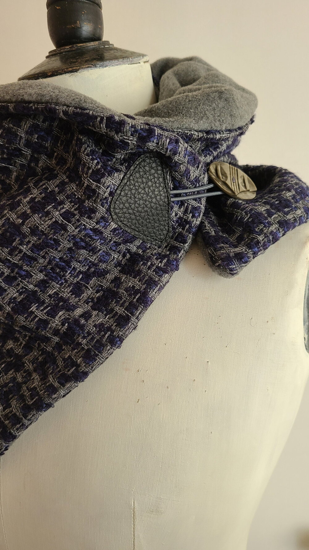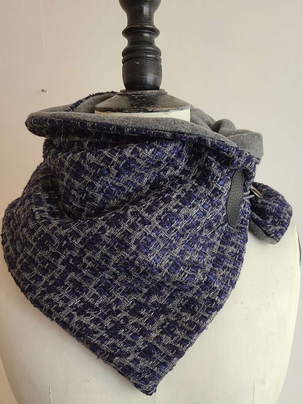 Nouvelle forme d'écharpe dans ma boutique depuis l année dernière. Une écharpe que l' on enroule autour du cou et qui se ferme avec une attache et un gros bouton vintage.