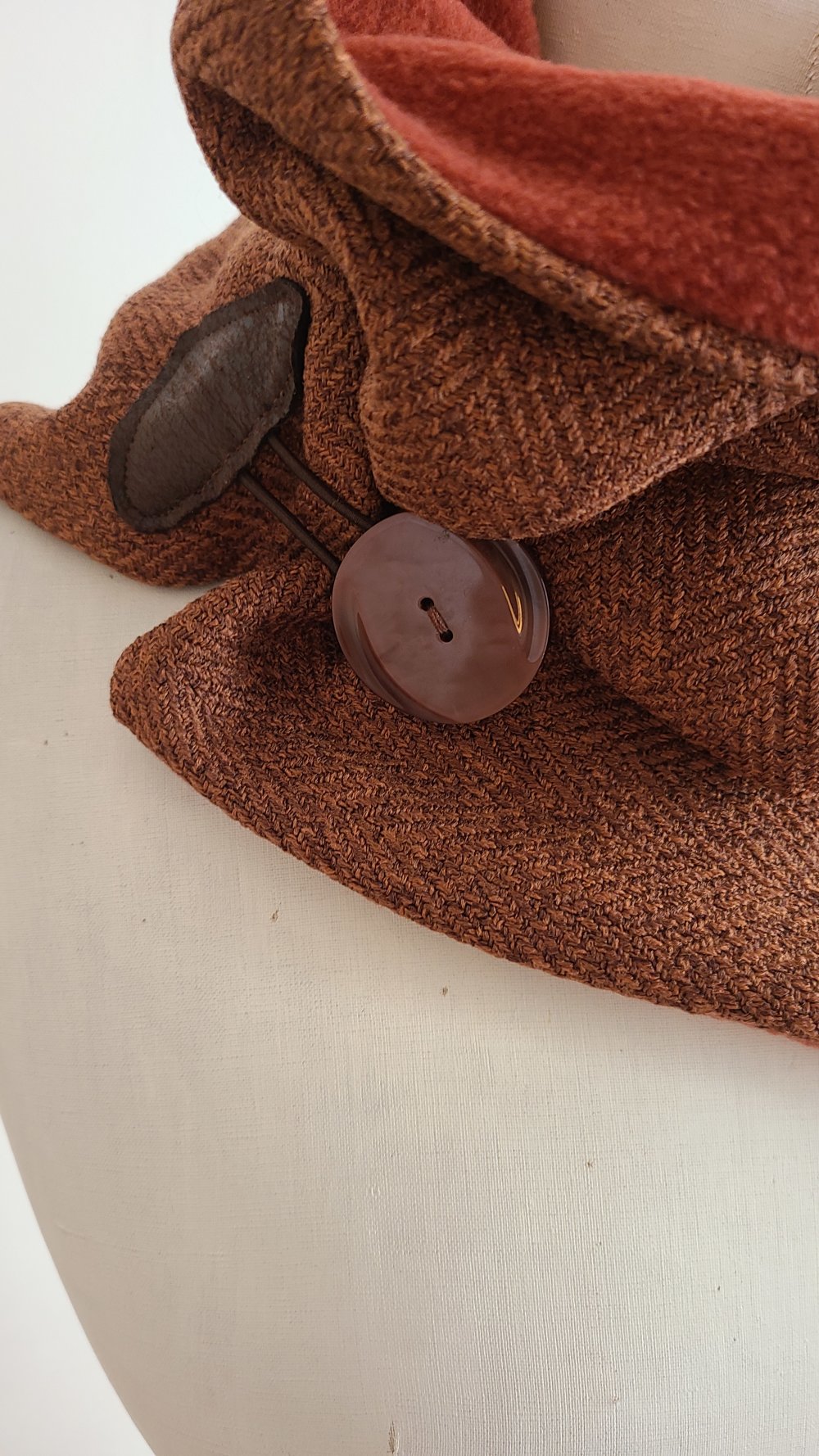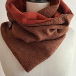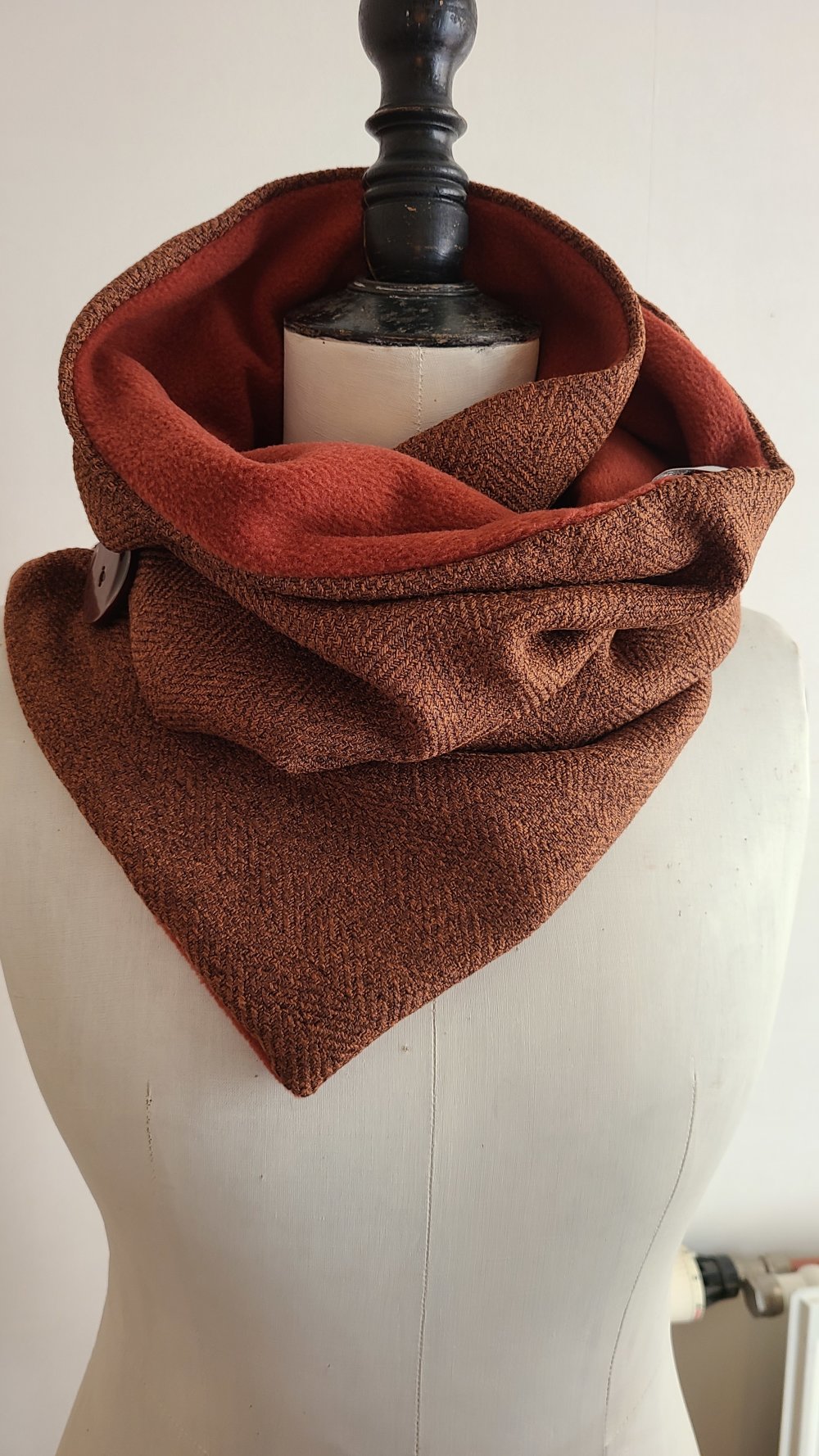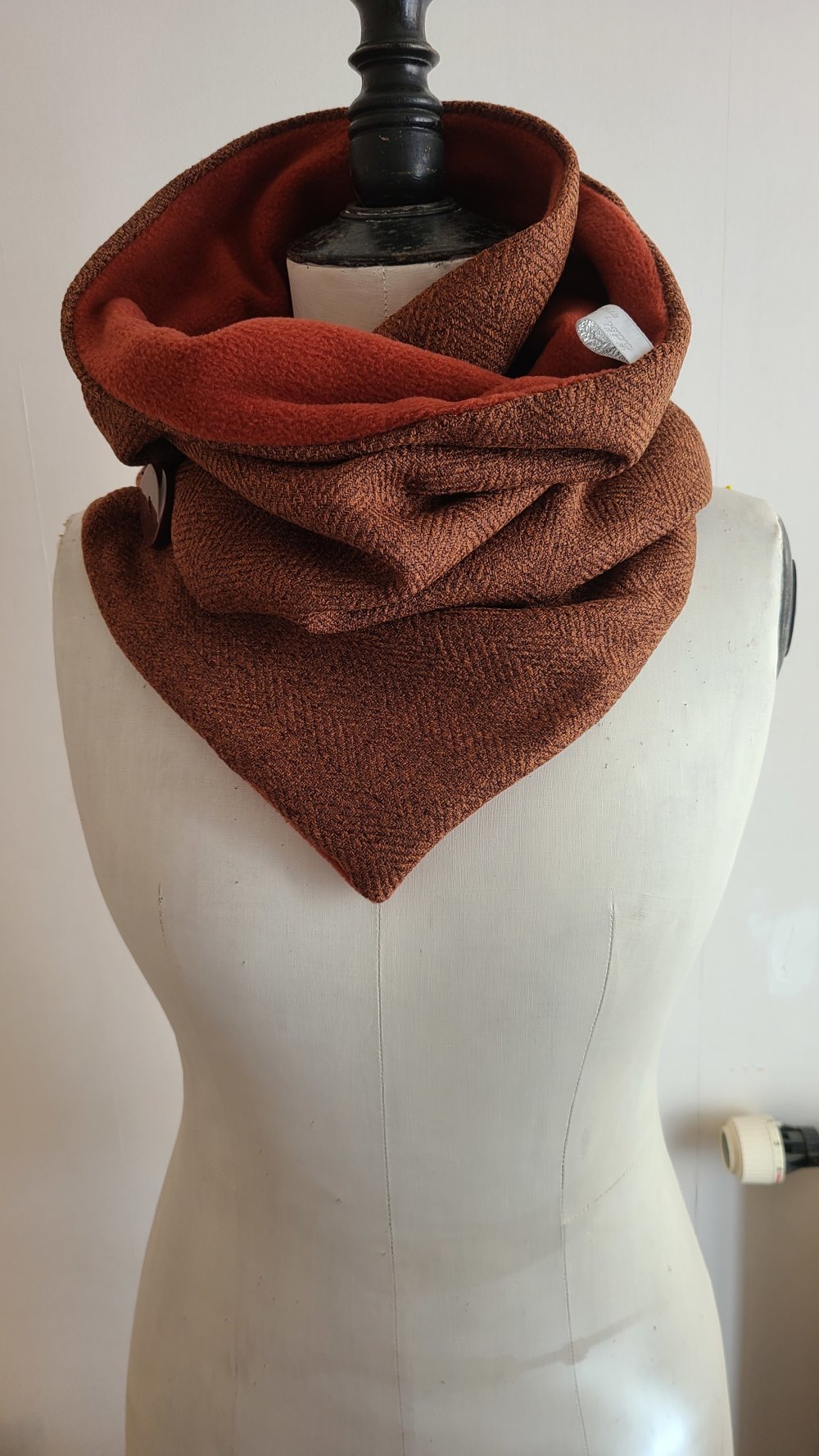 Col écharpe deux tissus : un tissu couleur pain brûlé et une polaire oranger
