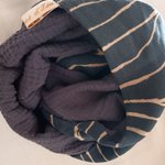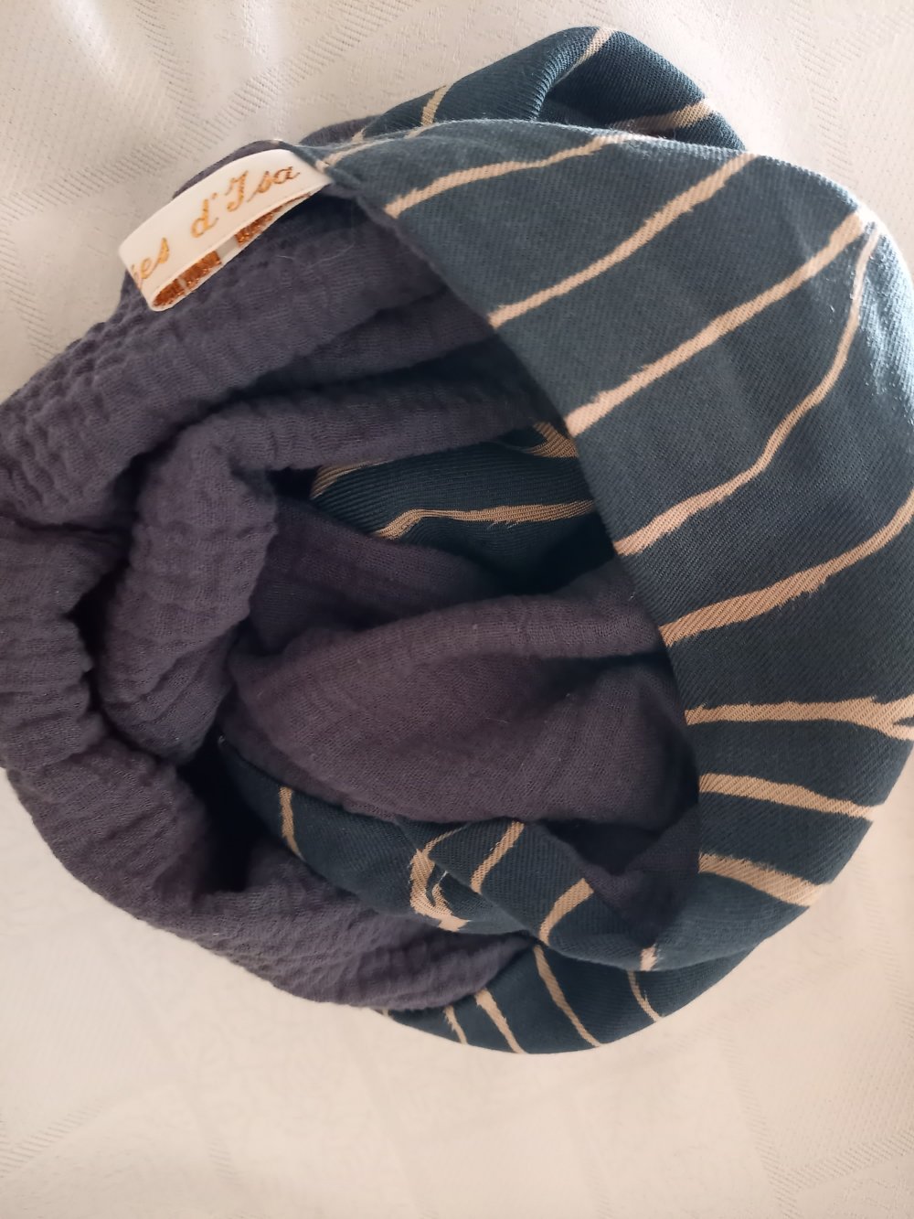 * bleu + gaze de coton écru et beige: dimensions 129 cm de circonférence ou 64.5 cm X 28 cm, mesures prises à plat