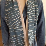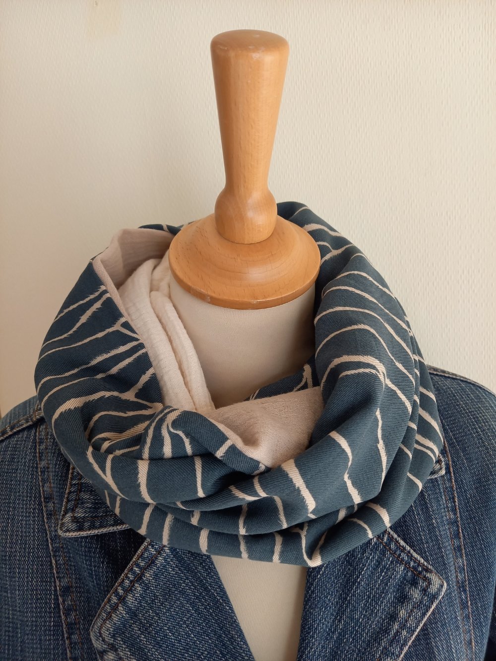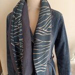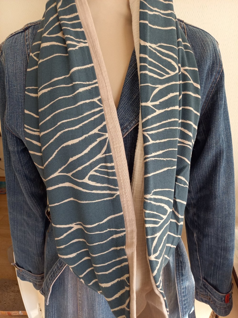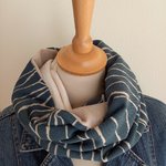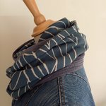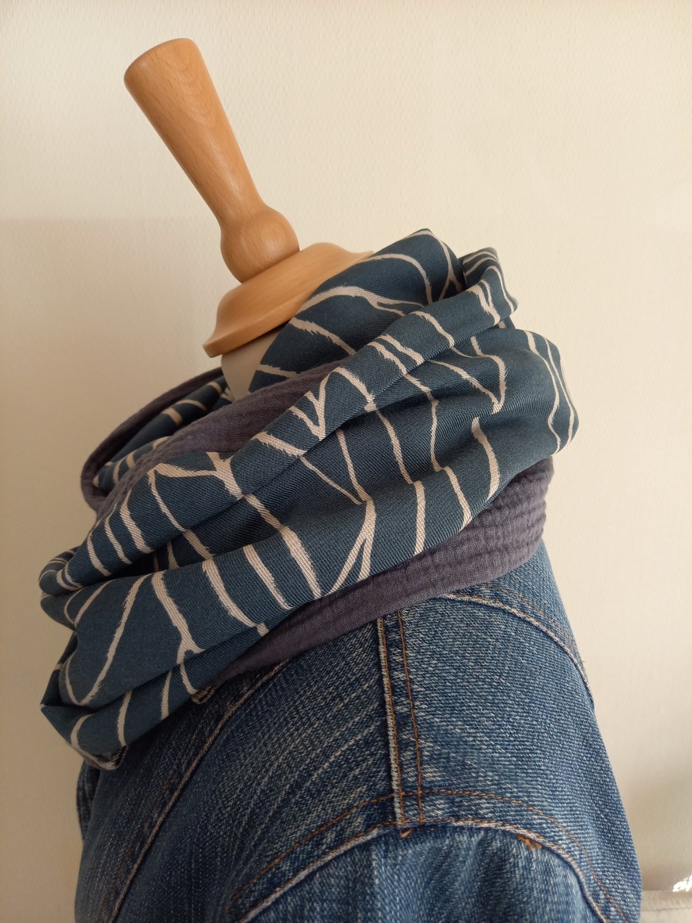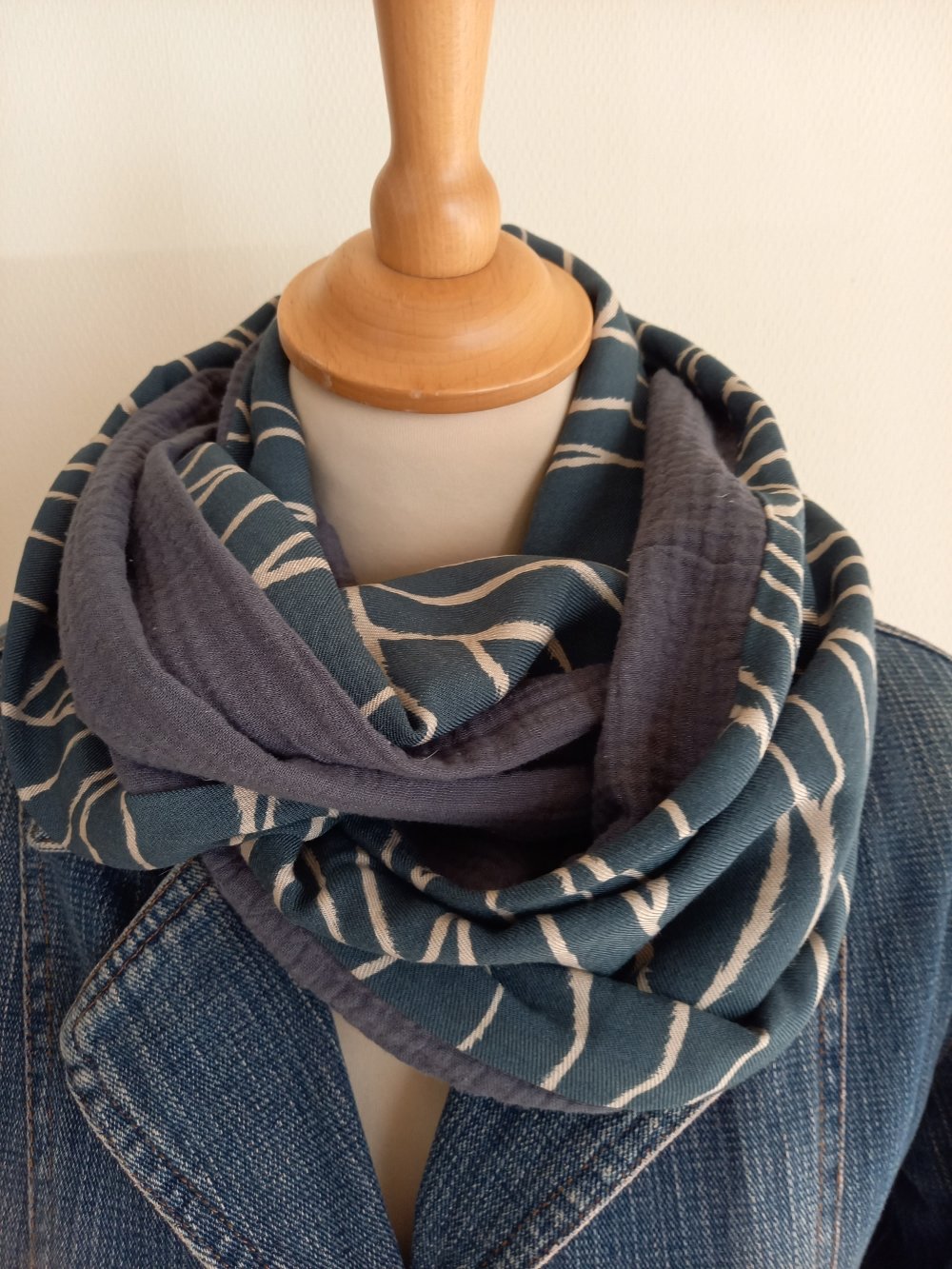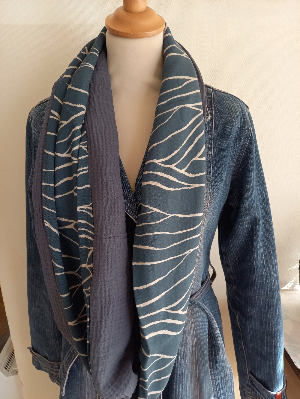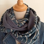 Double écharpe snood ou écharpe circulaire réalisée dans 2 tissus différents: 1 tissu viscose, de belle tenue, fond bleu moyen, un peu bleu "jean" et de la double gaze de coton.