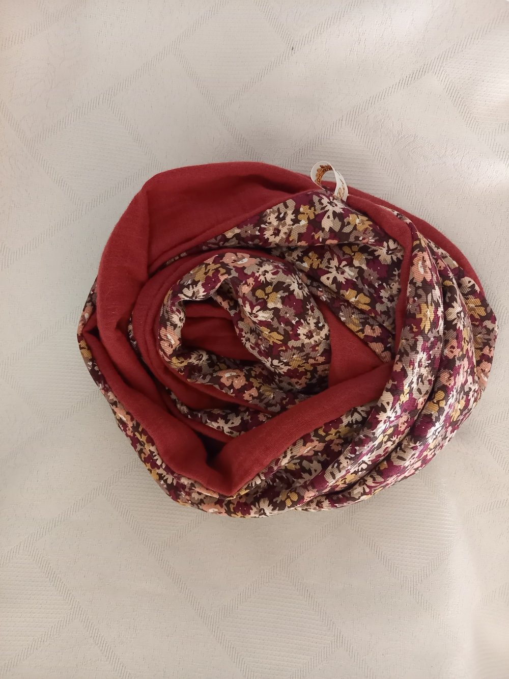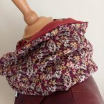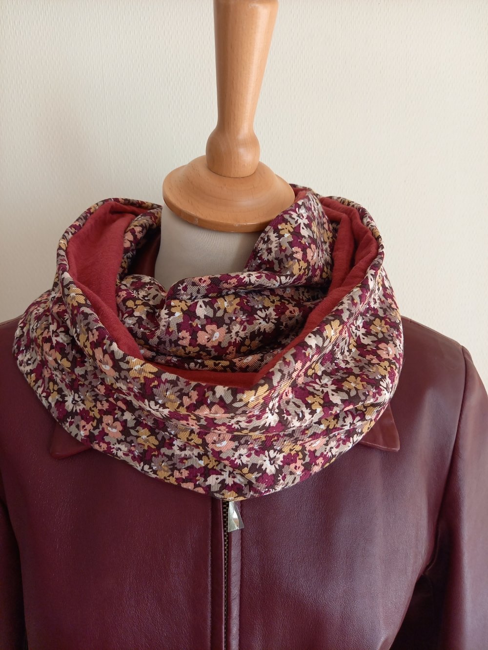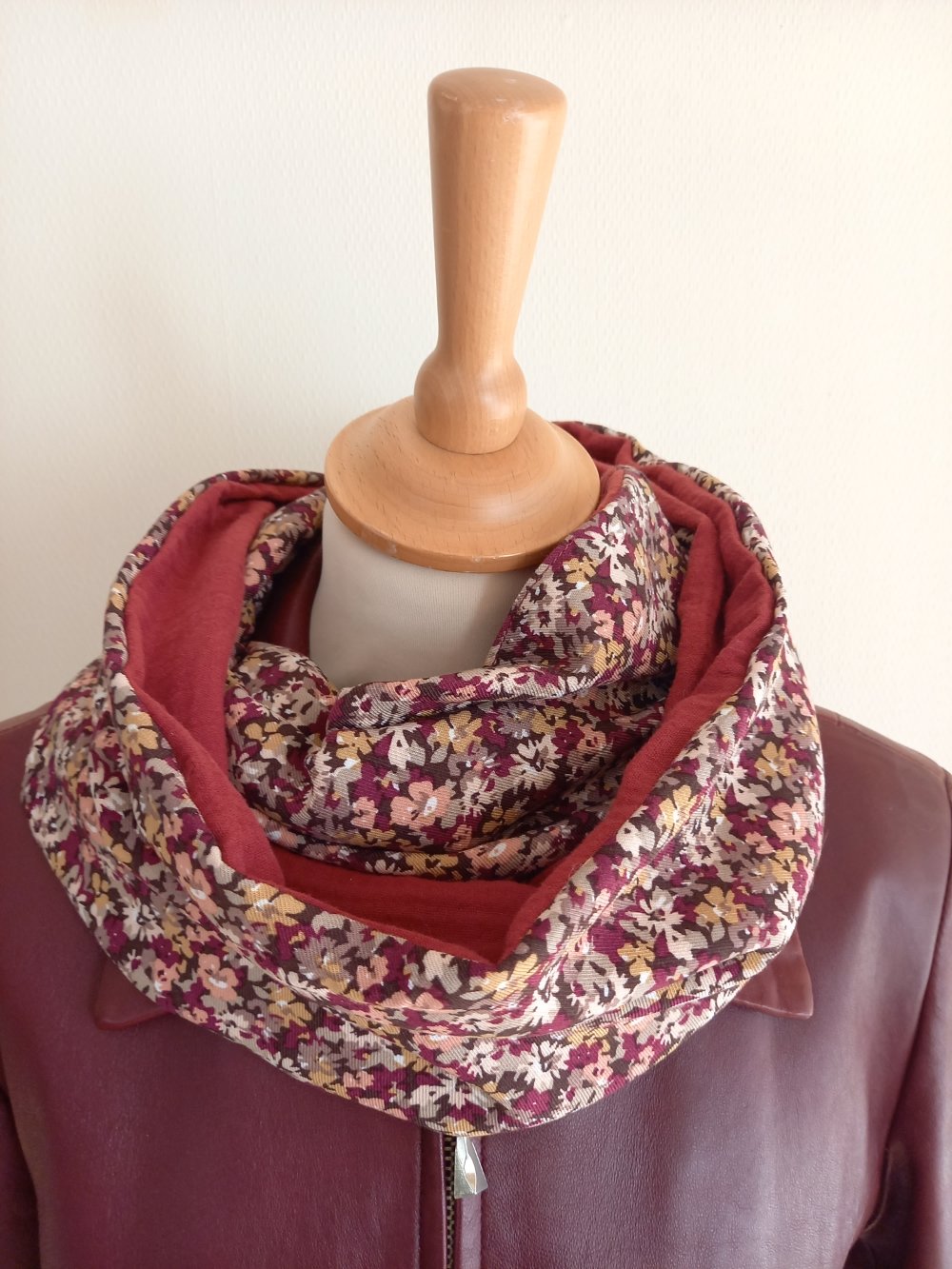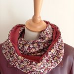 Double écharpe snood ou écharpe circulaire réalisée dans 2 tissus différents: 1 tissu viscose fleuri aux couleurs bordeaux/prune, taupe, beige, de belle tenue, et de la double gaze de coton rouge foncé.
