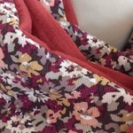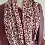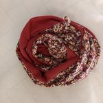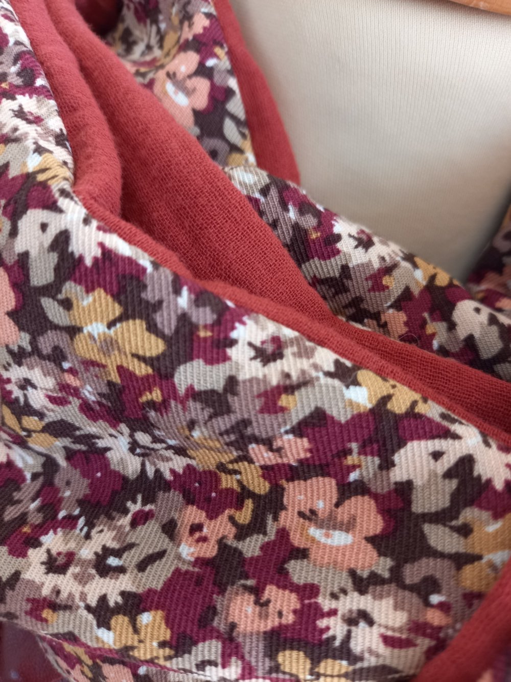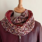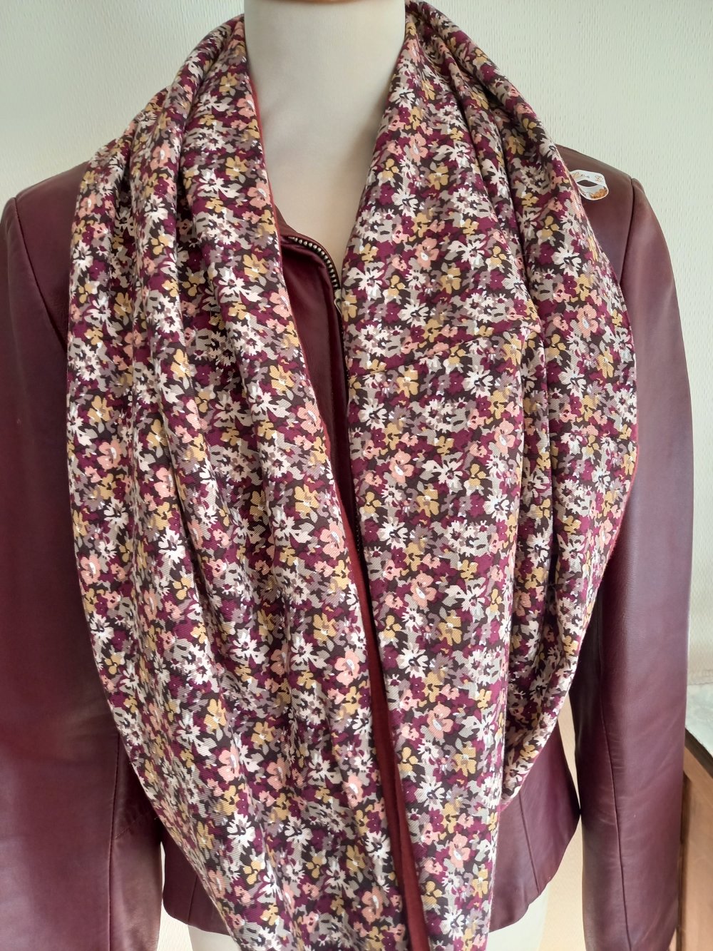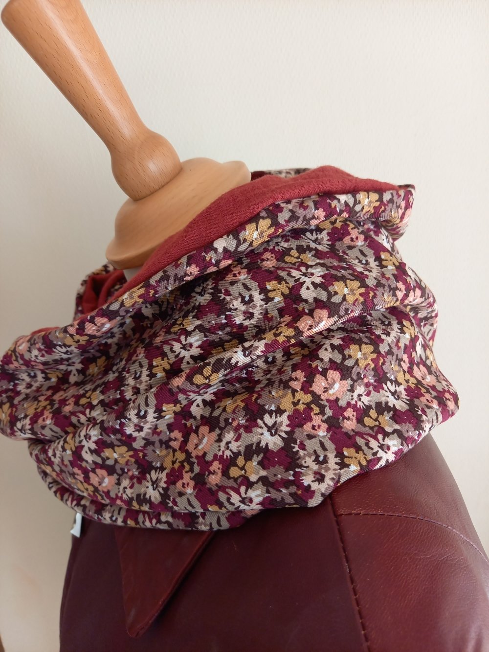 Double écharpe snood ou écharpe circulaire réalisée dans 2 tissus différents: 1 tissu viscose fleuri aux couleurs bordeaux/prune, taupe, beige, de belle tenue, et de la double gaze de coton rouge foncé.