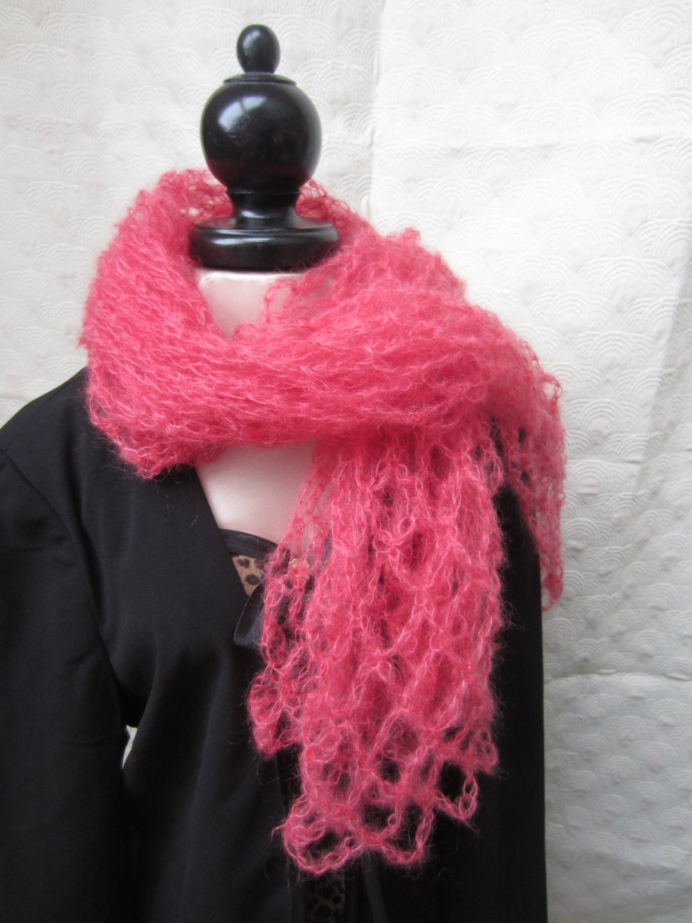 Tour du cou rose en maille dentelle, légère comme une plume, douce et chaude réalisée au crochet
