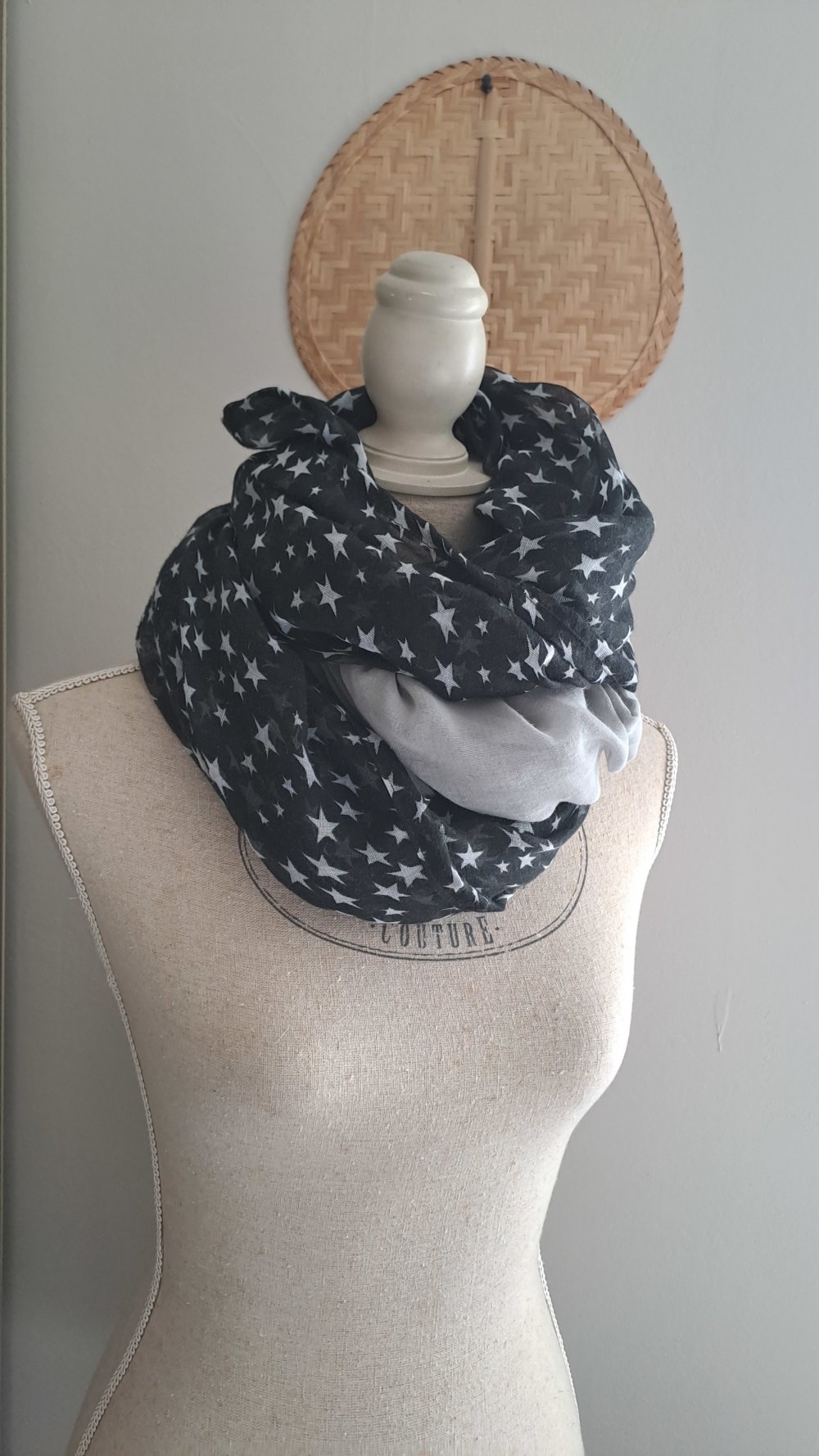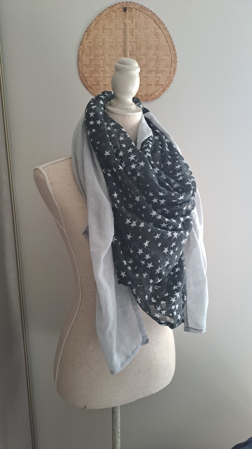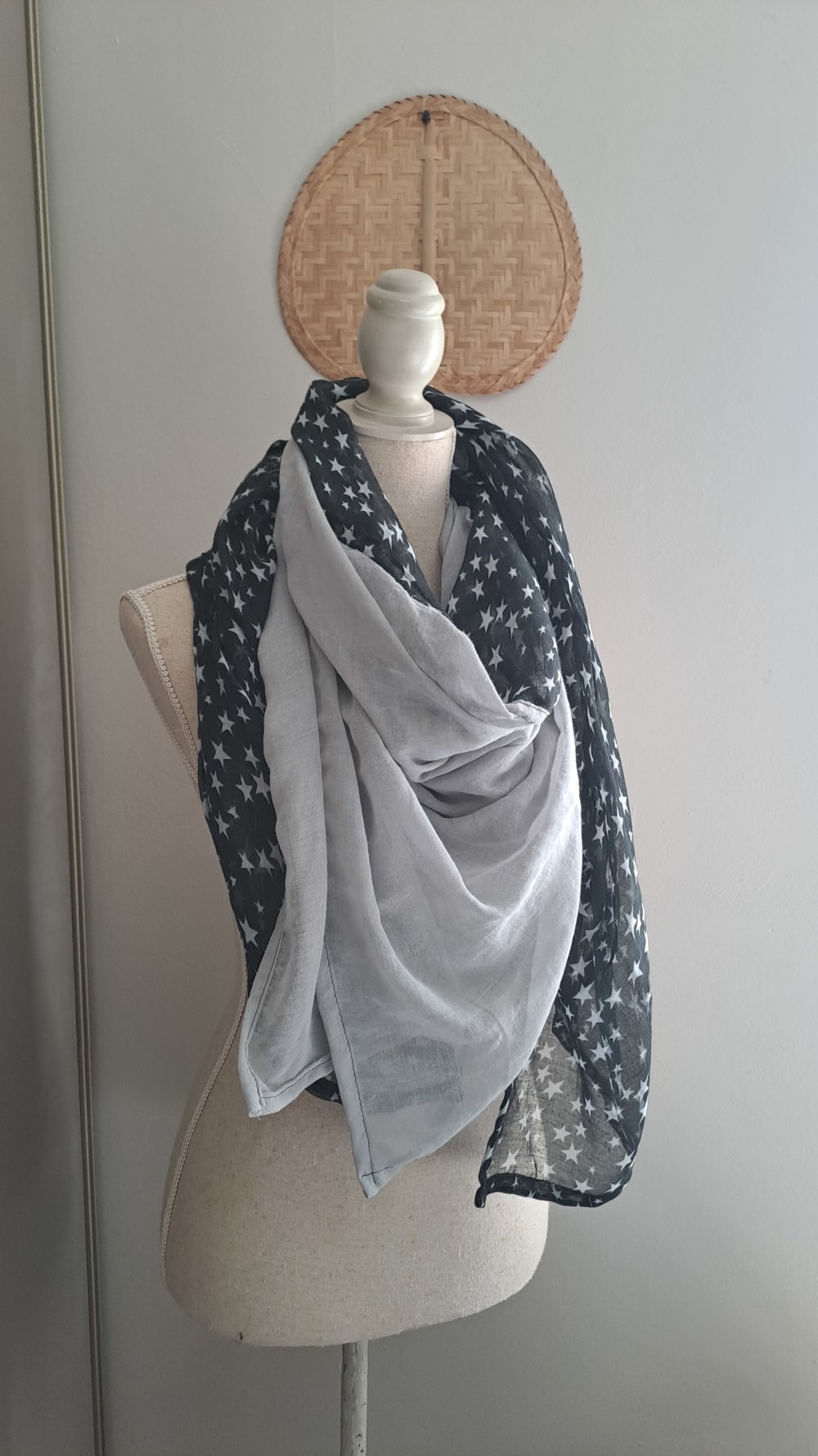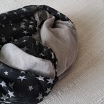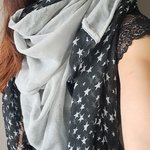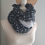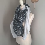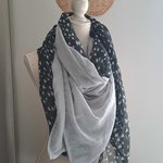 Grande Écharpe Triangle double ( carré plié en deux bi couleur) légère et très douce gaze de coton gris clair et noir motifs étoiles.