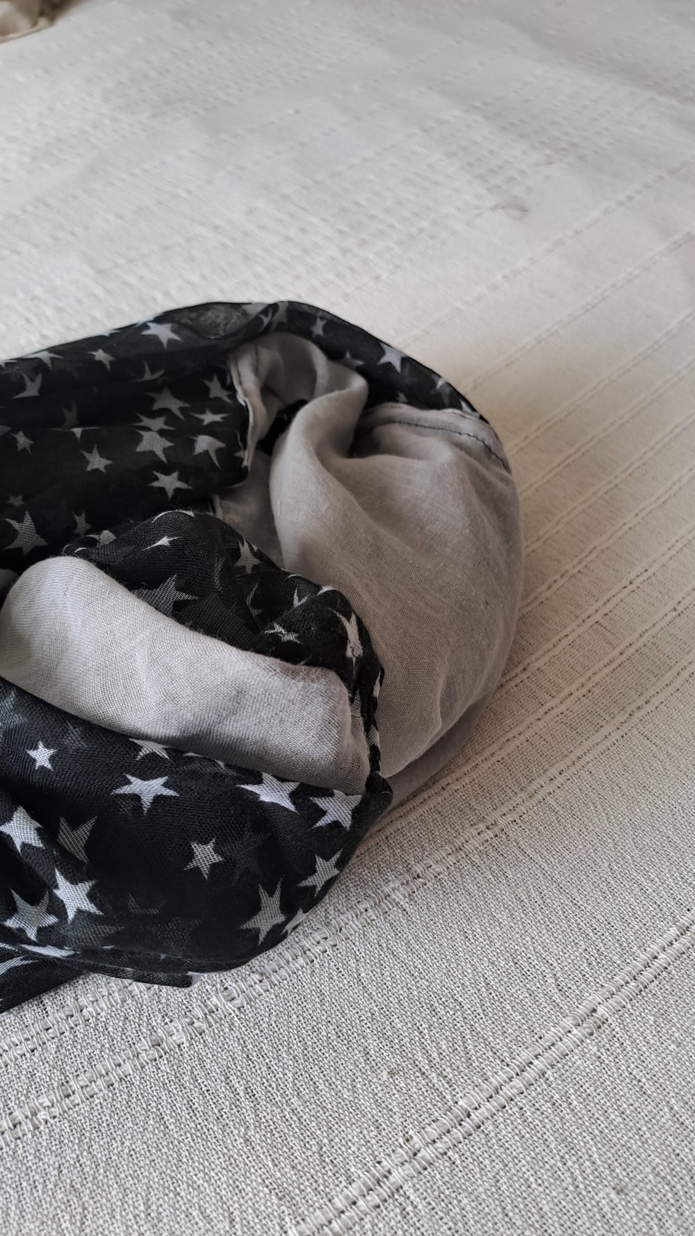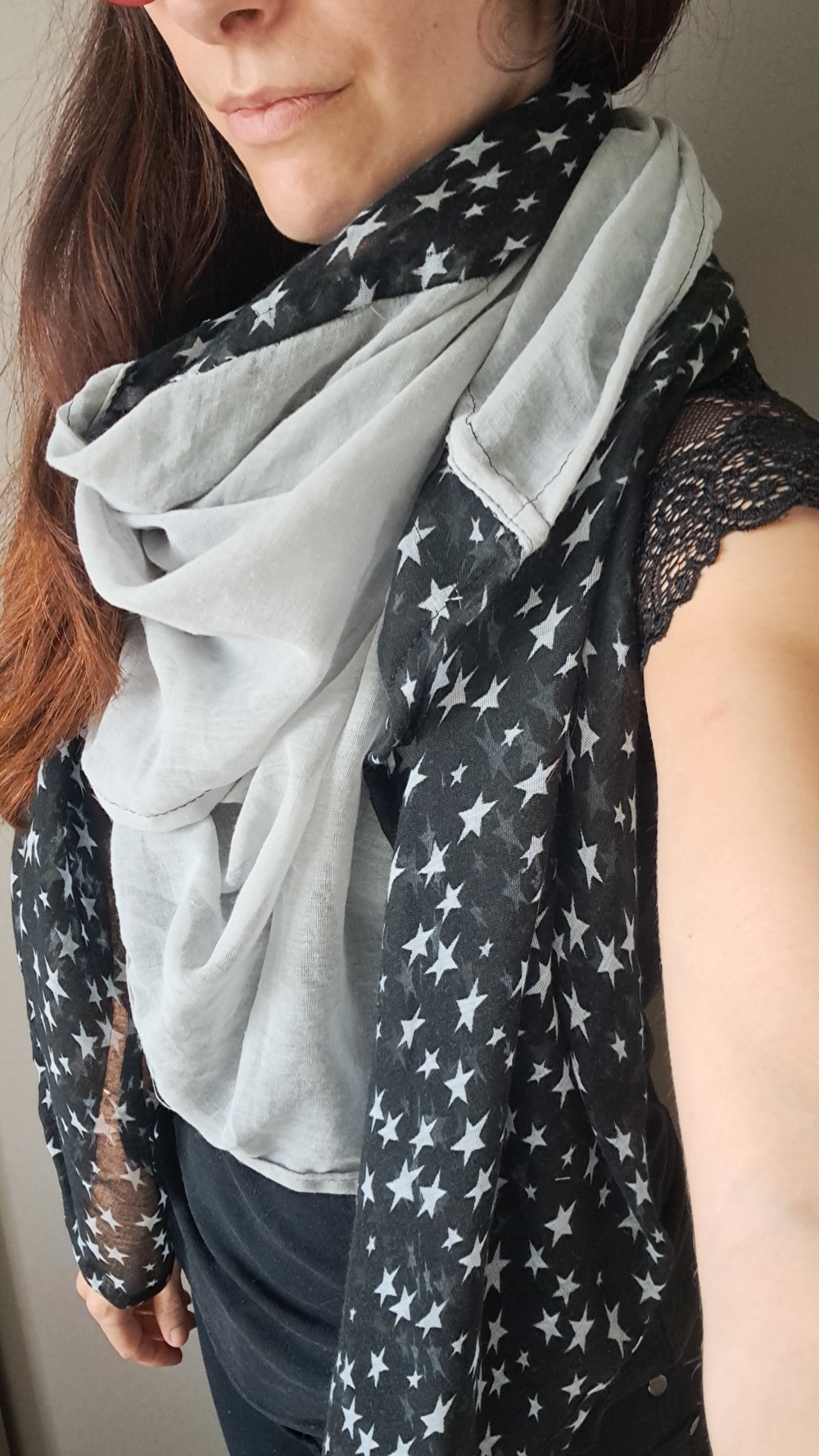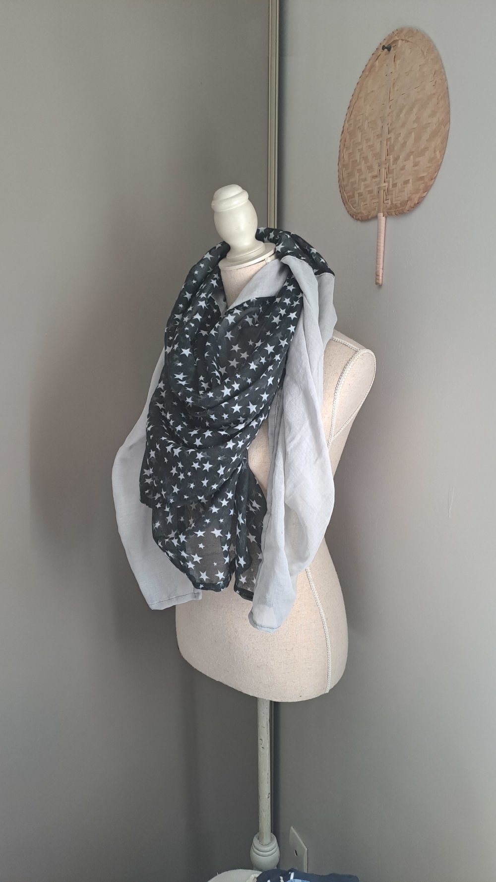 Grande Écharpe Triangle double ( carré plié en deux bi couleur) légère et très douce gaze de coton gris clair et noir motifs étoiles.