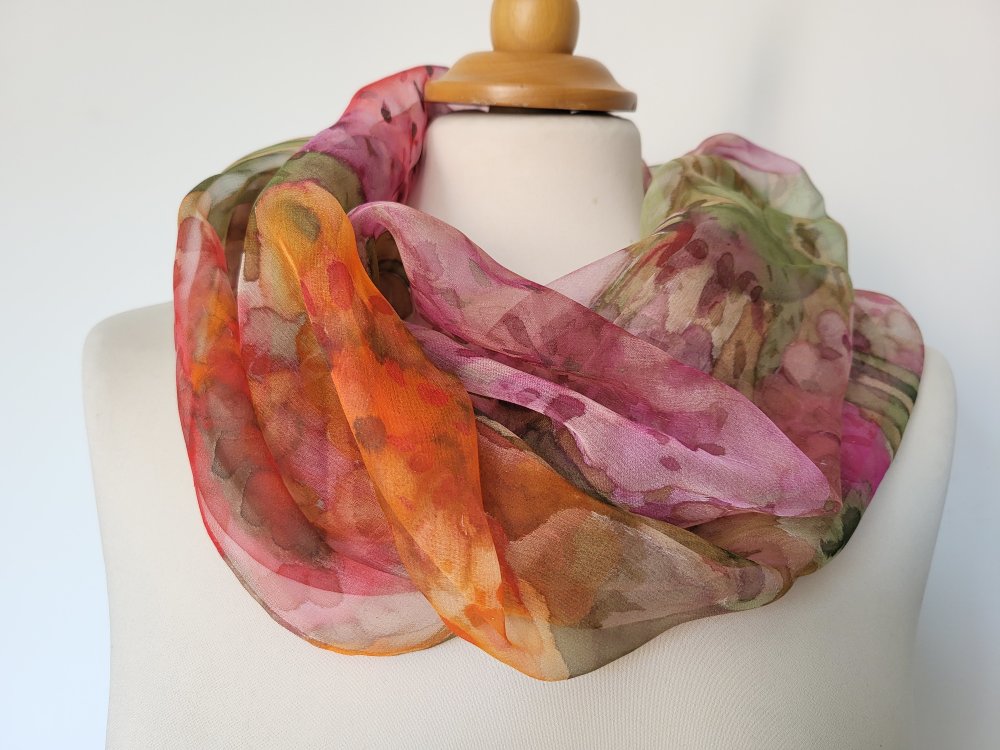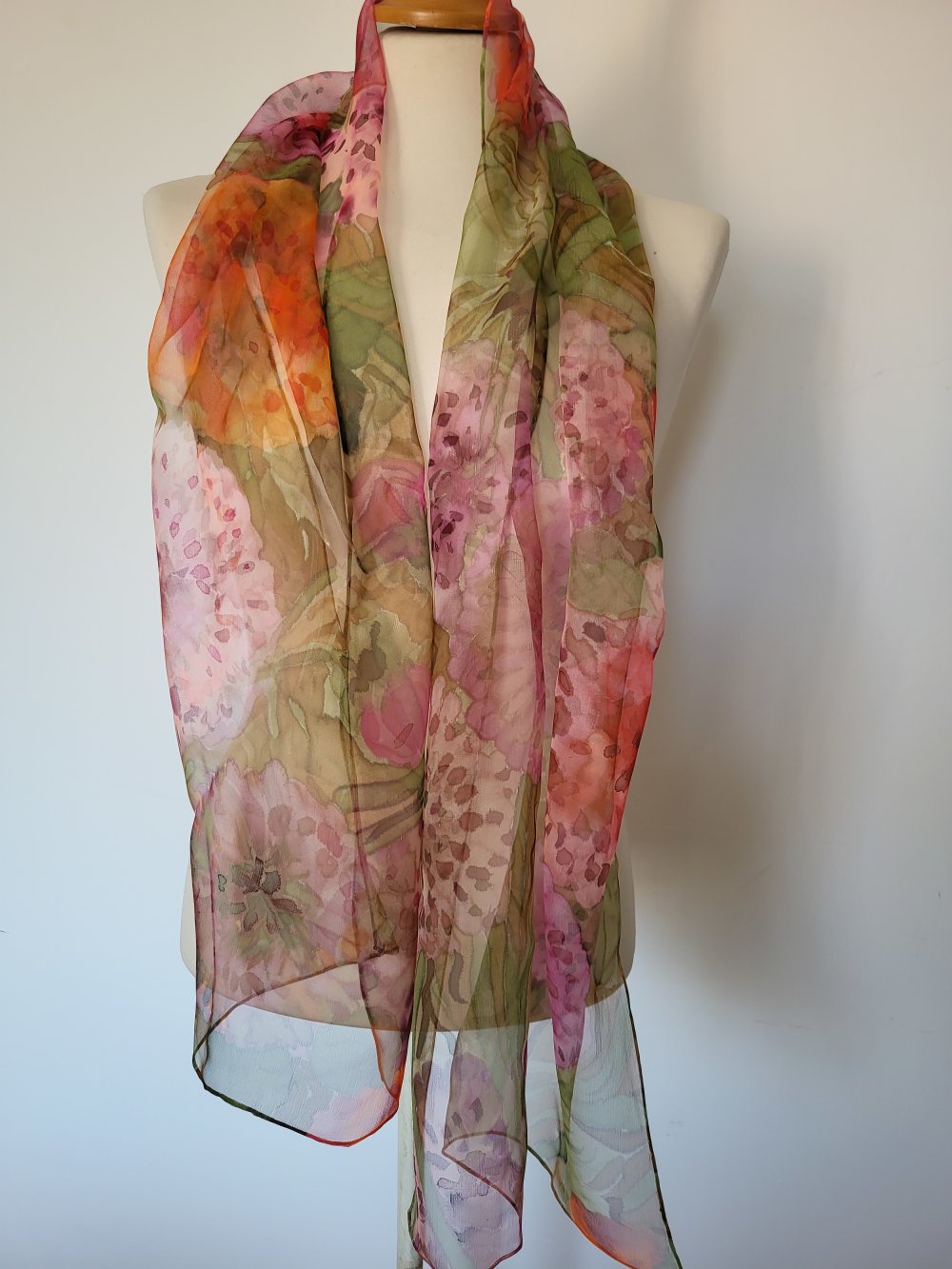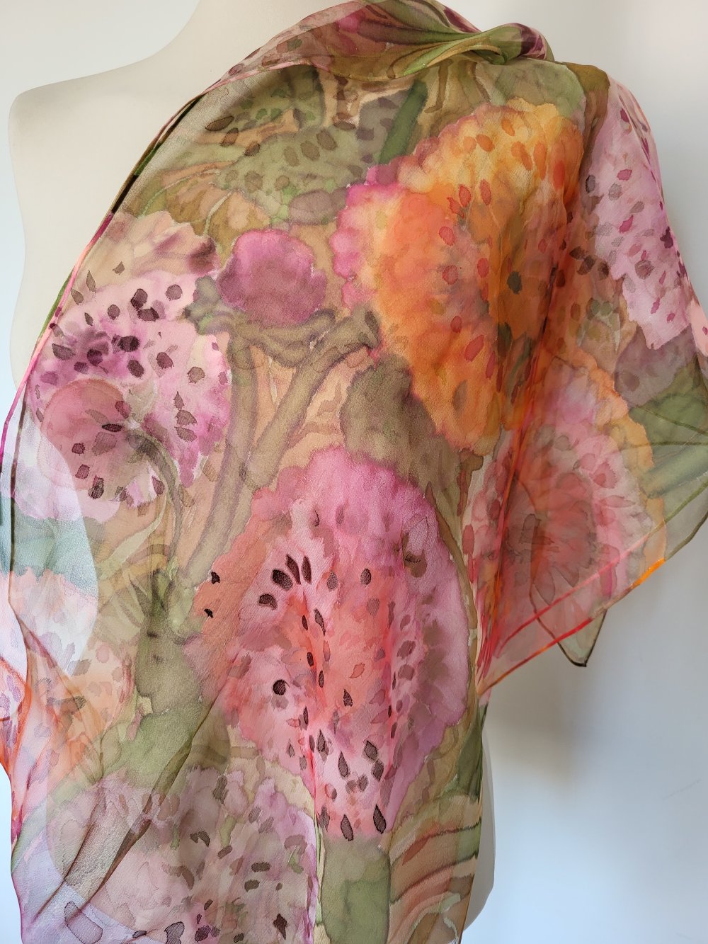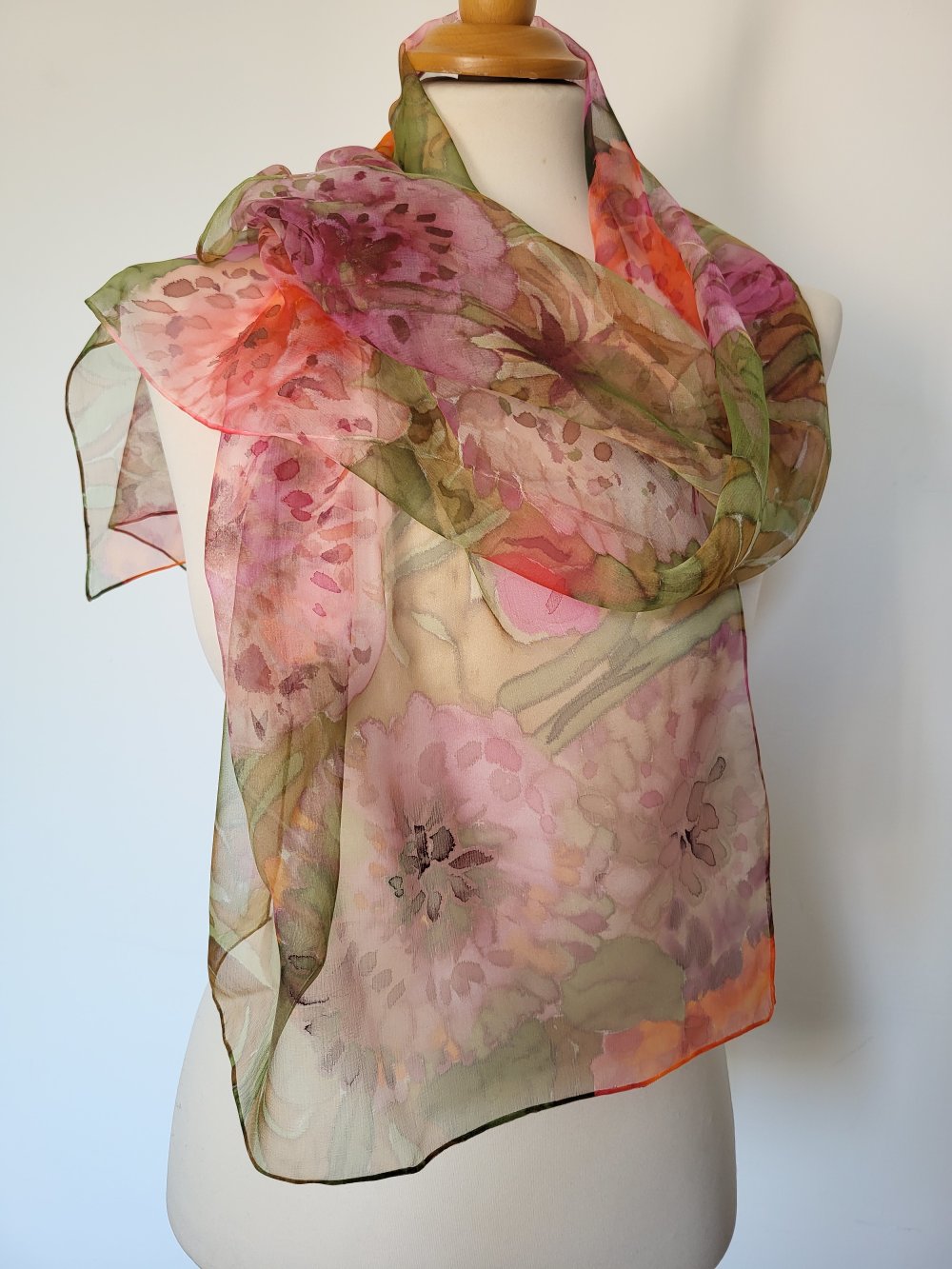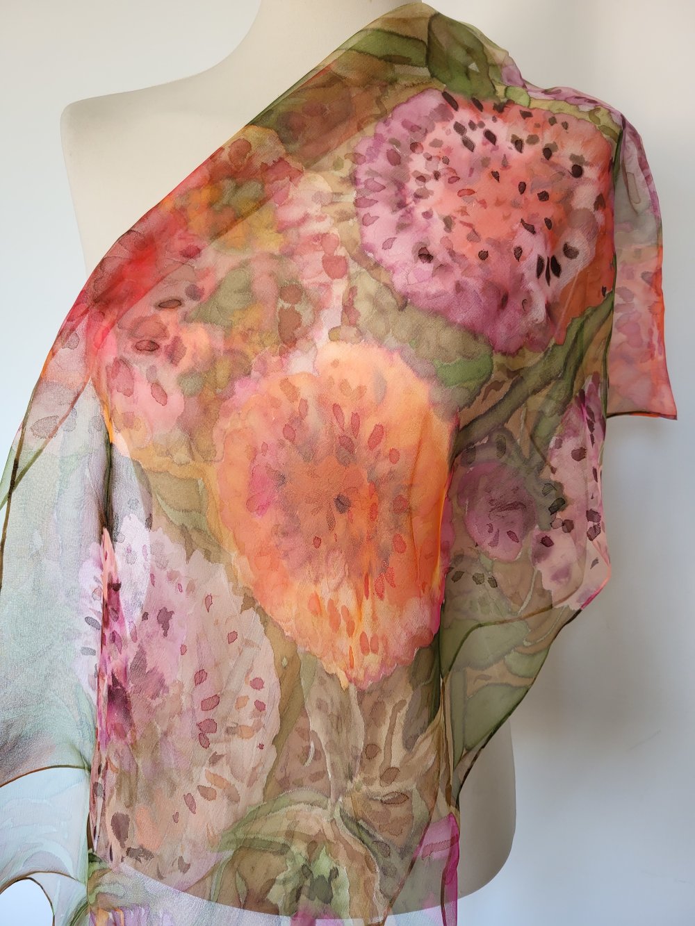 Echarpe en mousseline de soie fleurs de dahlias peinte à la main