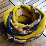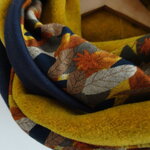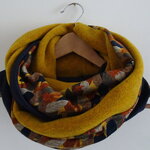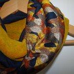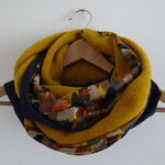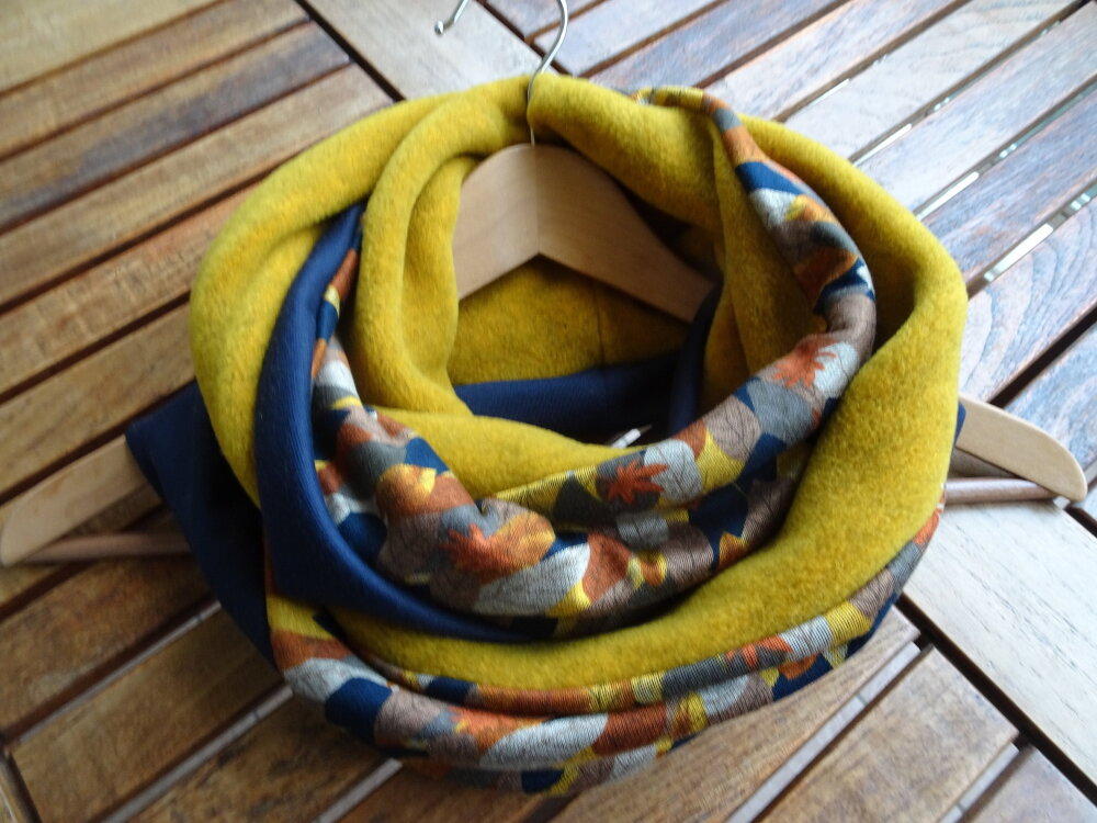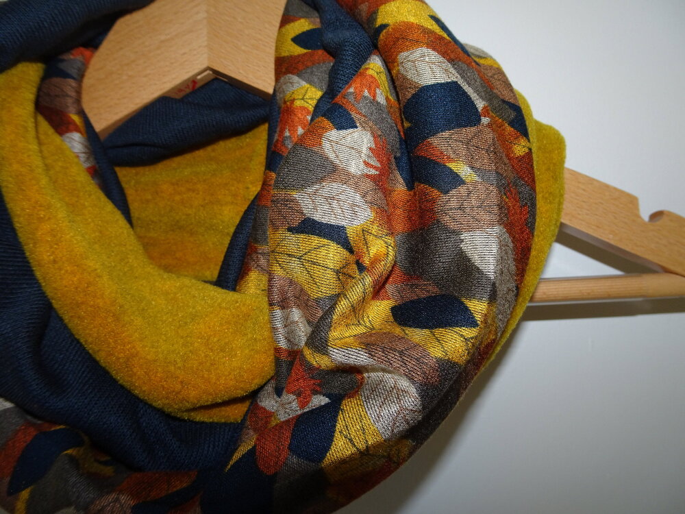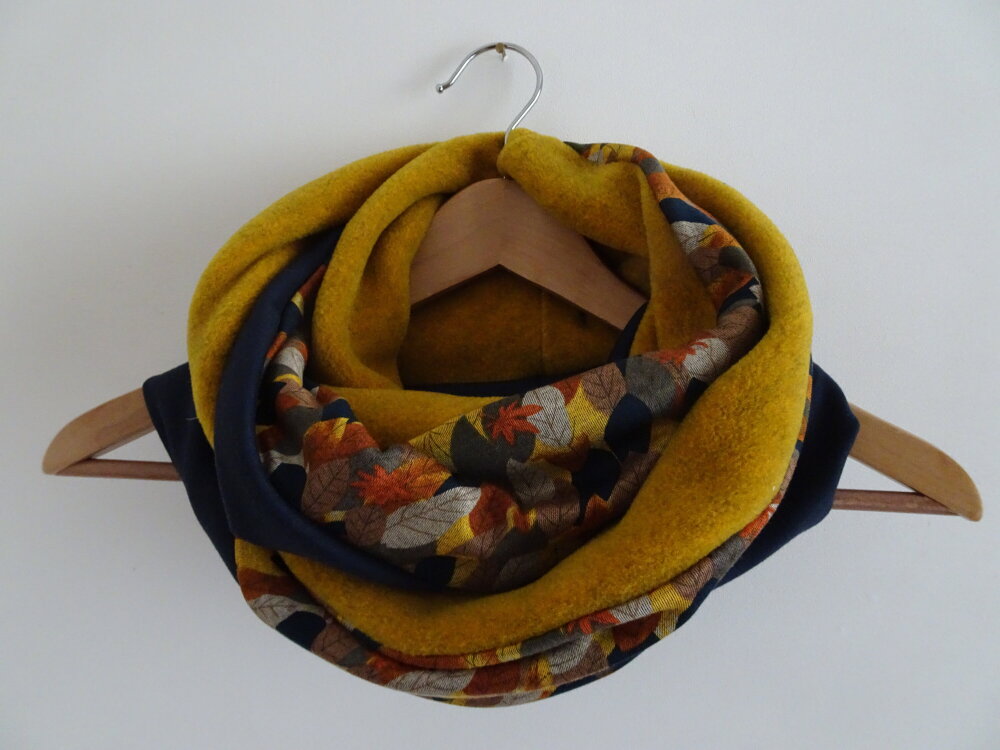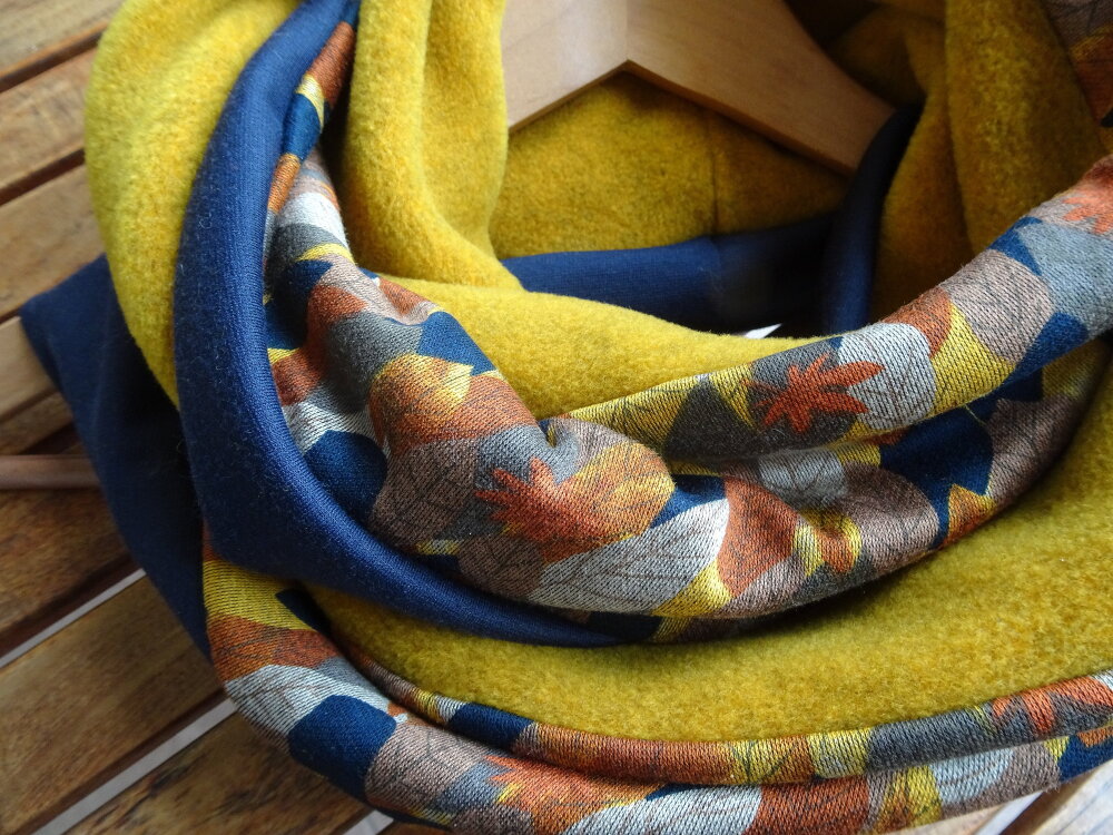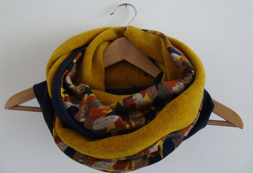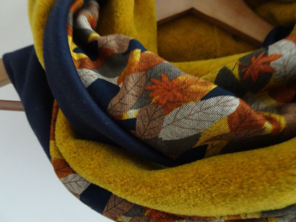 Un snood aux belles couleurs de l'automne. Trois tissus : une polaire curry chinée de très belle qualité, un jersey : un tapis de feuilles avec des magnifiques tons d'automne et une maille Jersey bleue marine. Tous les ingrédients sont là pour faire un snood coloré et original pour l'hiver.