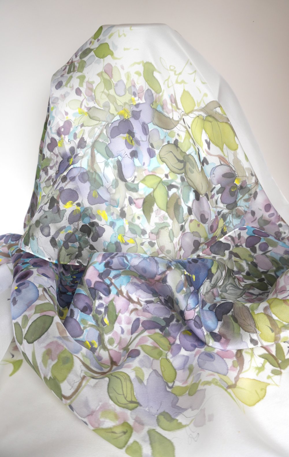 Mettez une touche d'originalité à votre tenue avec cette étole en soie peinte à la main avec de belles glycines sur fond blanc. Guirlande de fleurs sur un côté de l'écharpe .