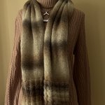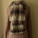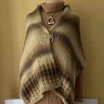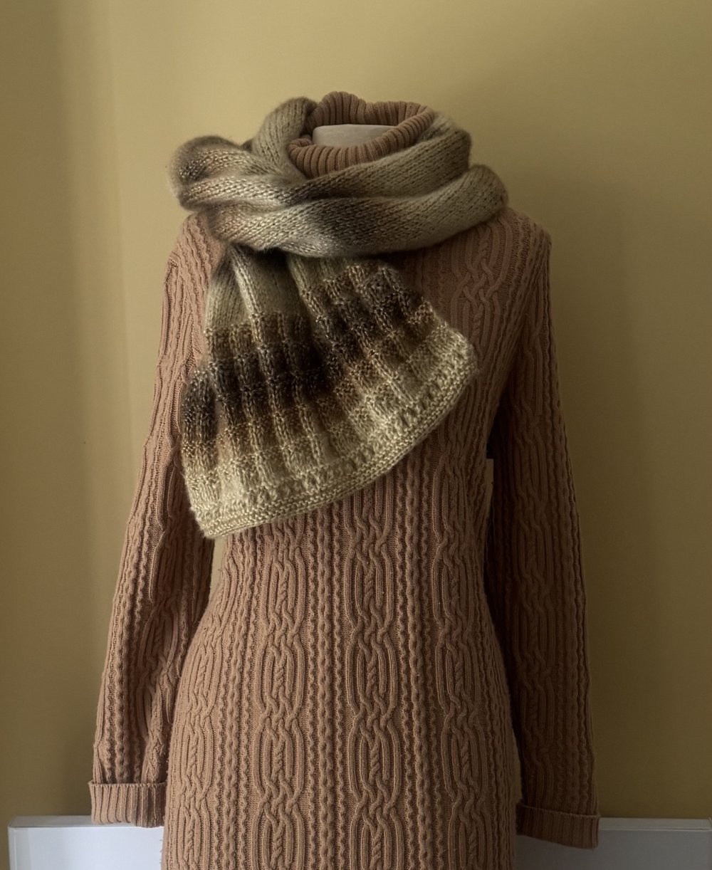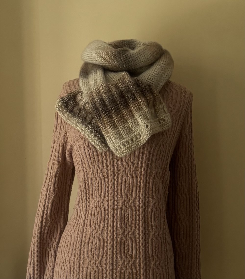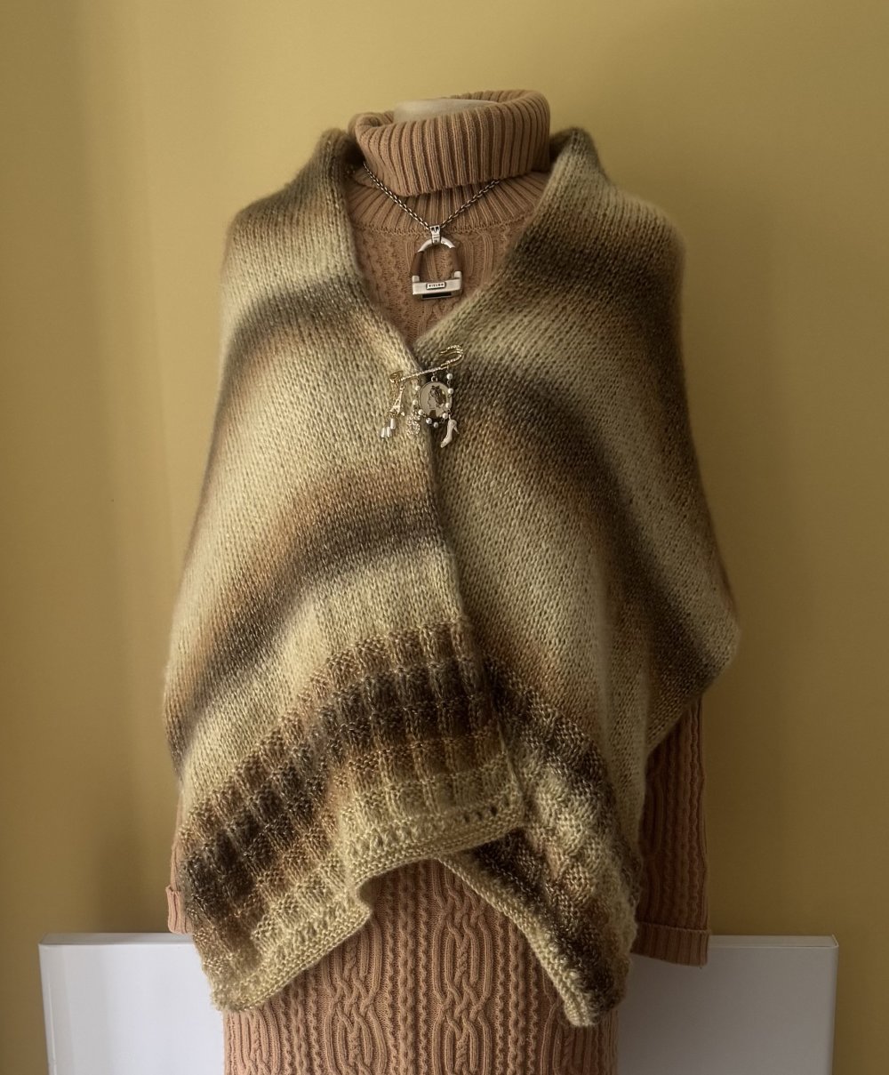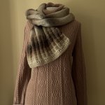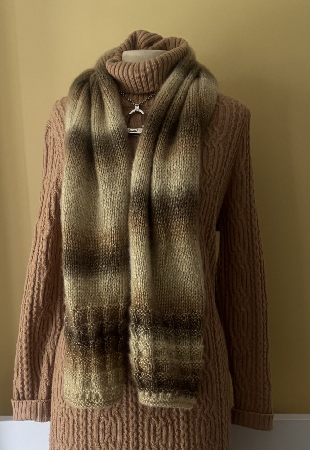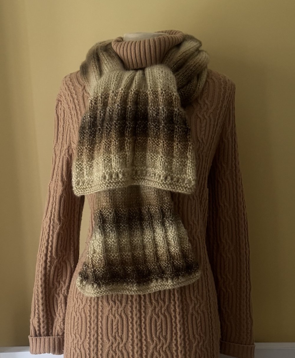 Tricoté dans un fil ( laine et fibres mélangées ) dégradé de couleurs beige, taupe, camel , ivoire avec une petite touche lurex discrète