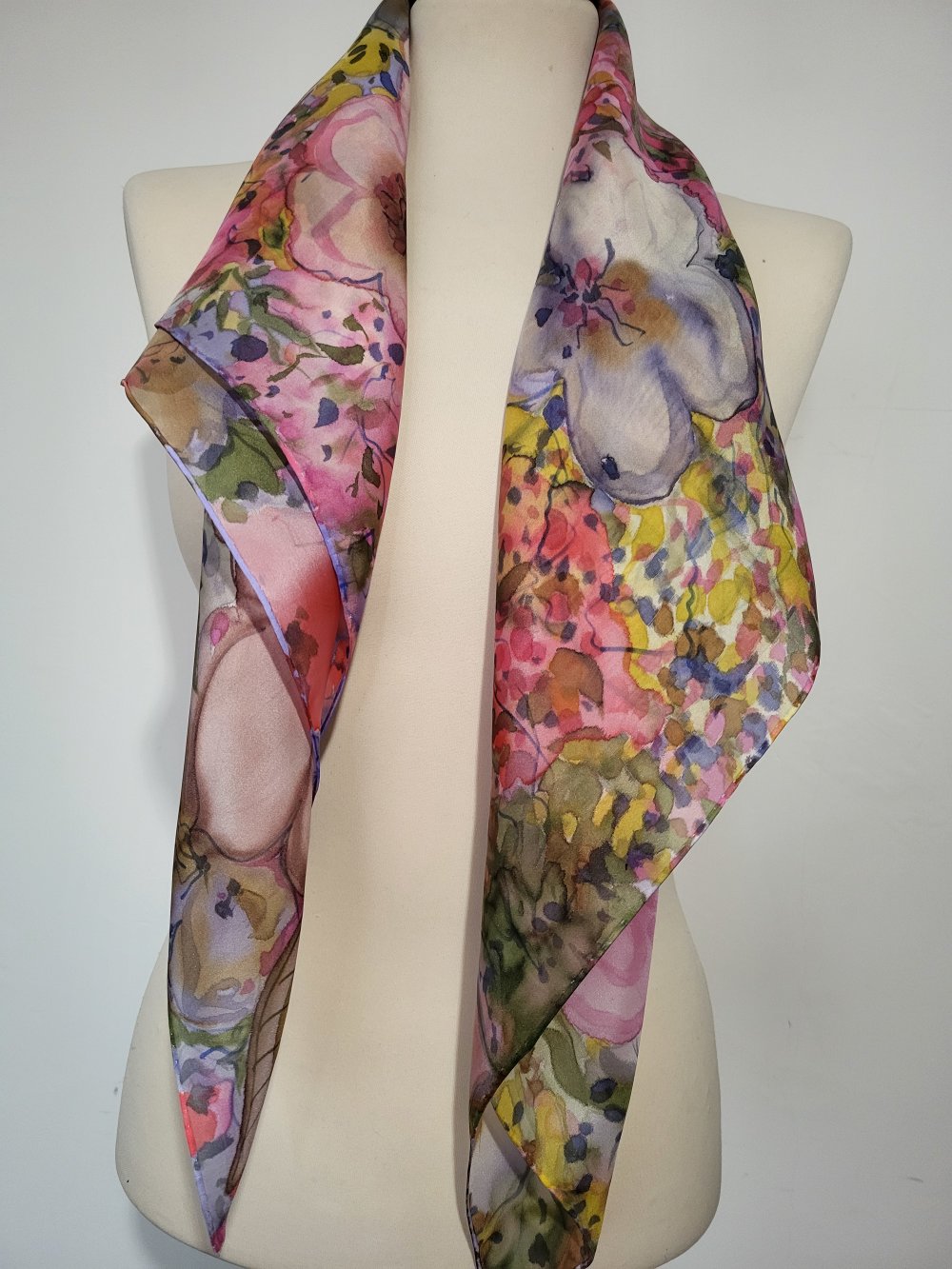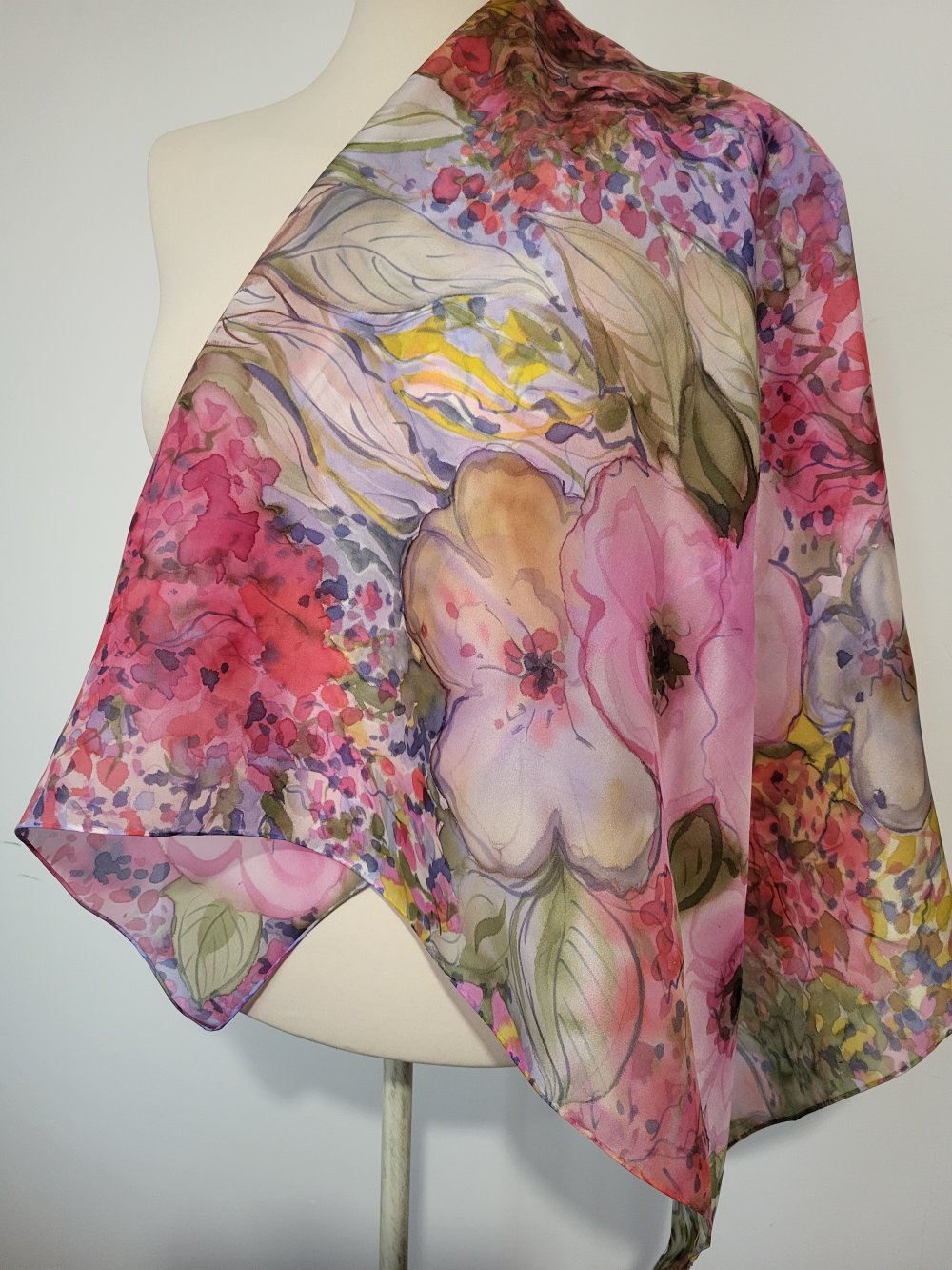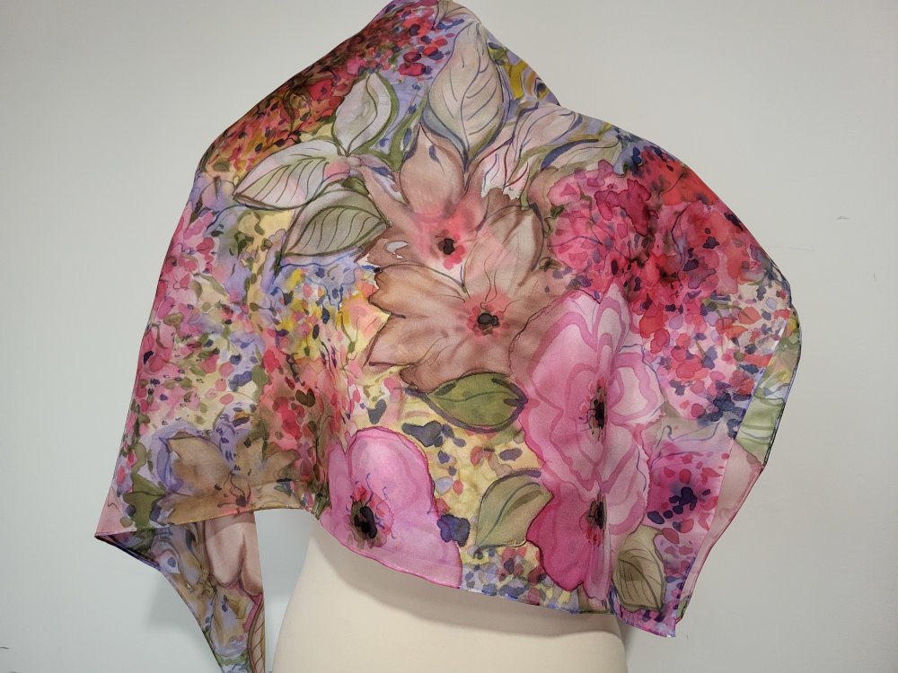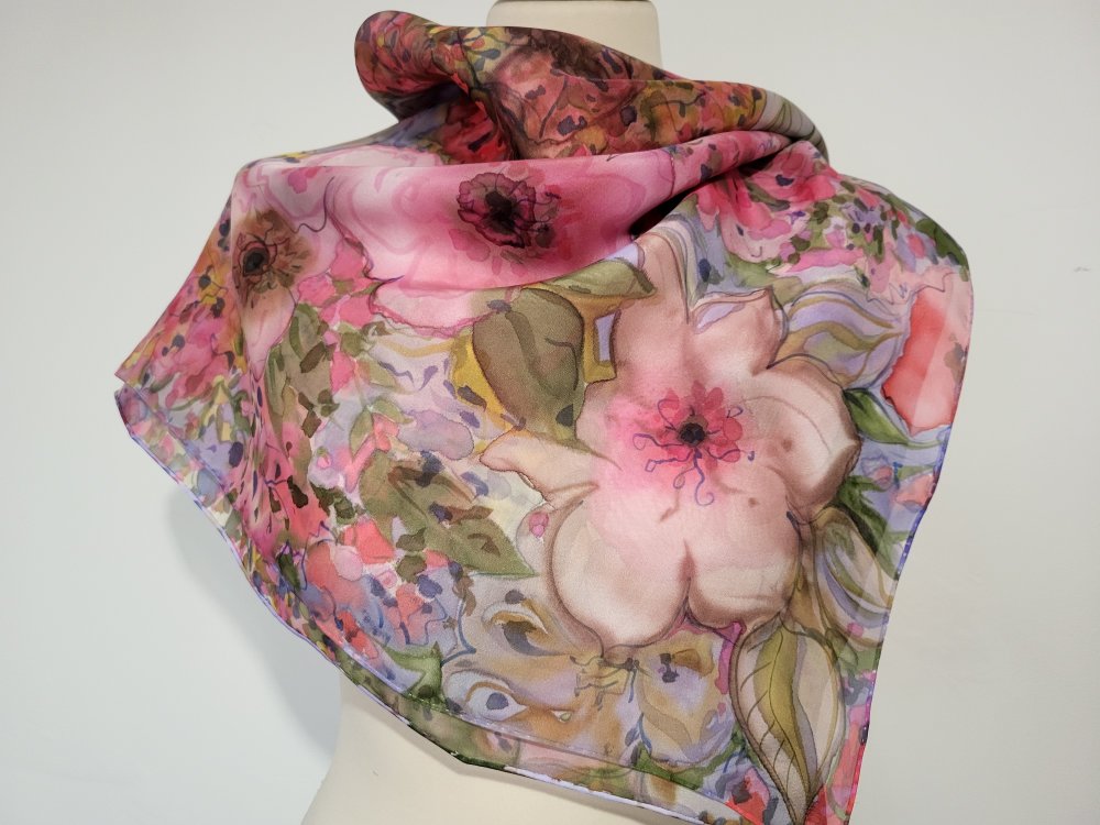 Enveloppez vous de douceur avec ce joli foulard en soie peint main motif fleuri.