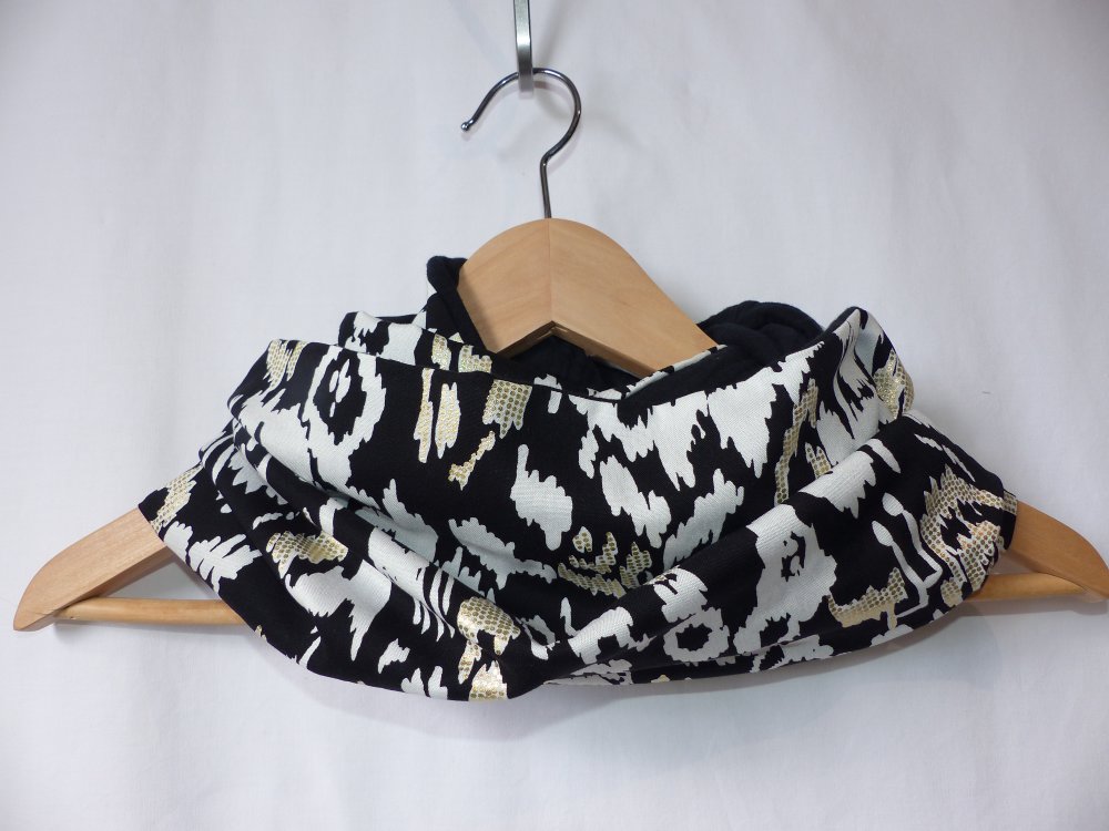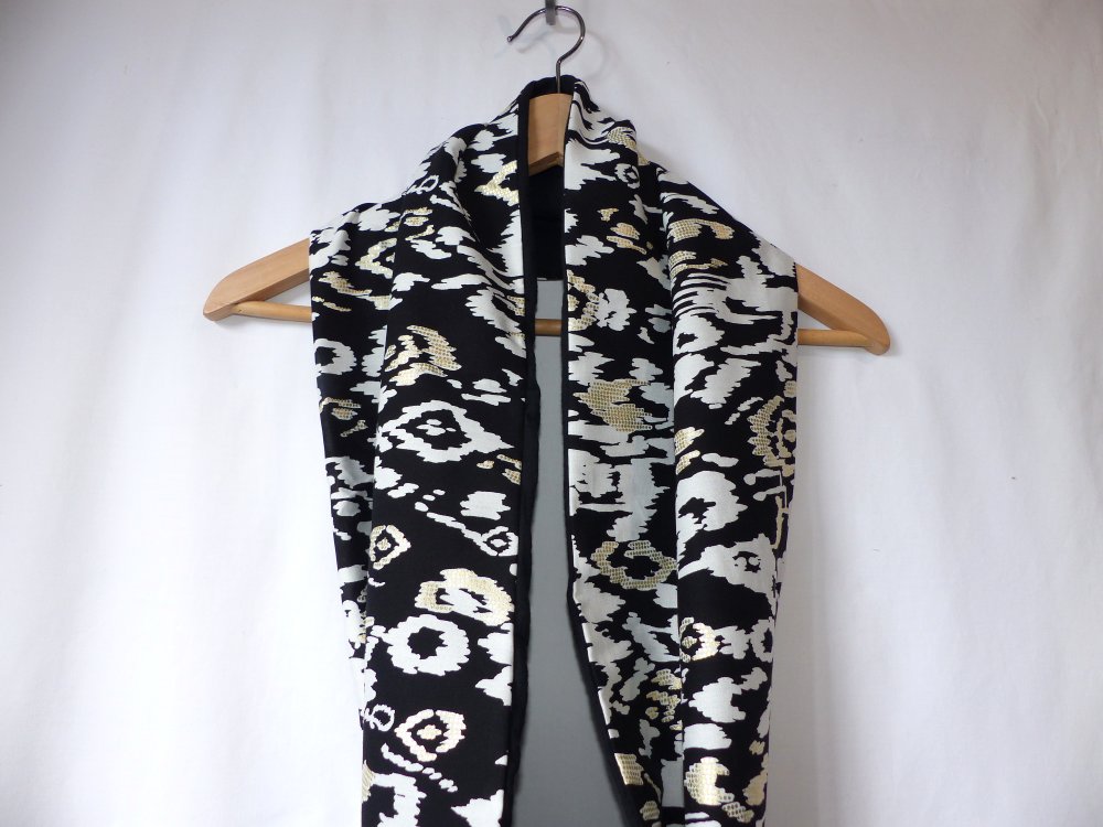 Accessoire à part entière indispensable pour apporter chaleur et douceur, cette écharpe tubulaire est conçue une face en viscose imprimée noir, blanc et pois doré, l’autre en double gaze de coton de couleur noir.