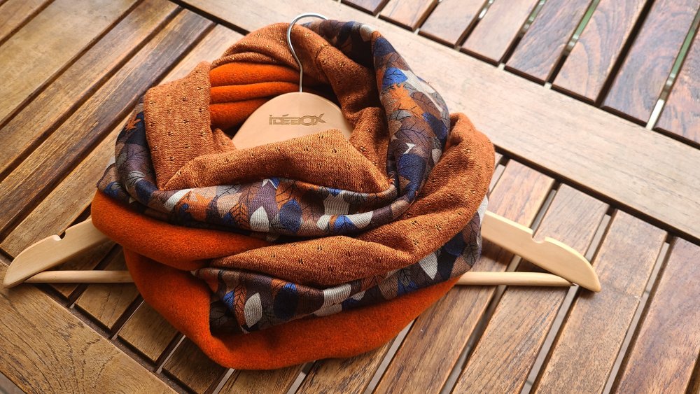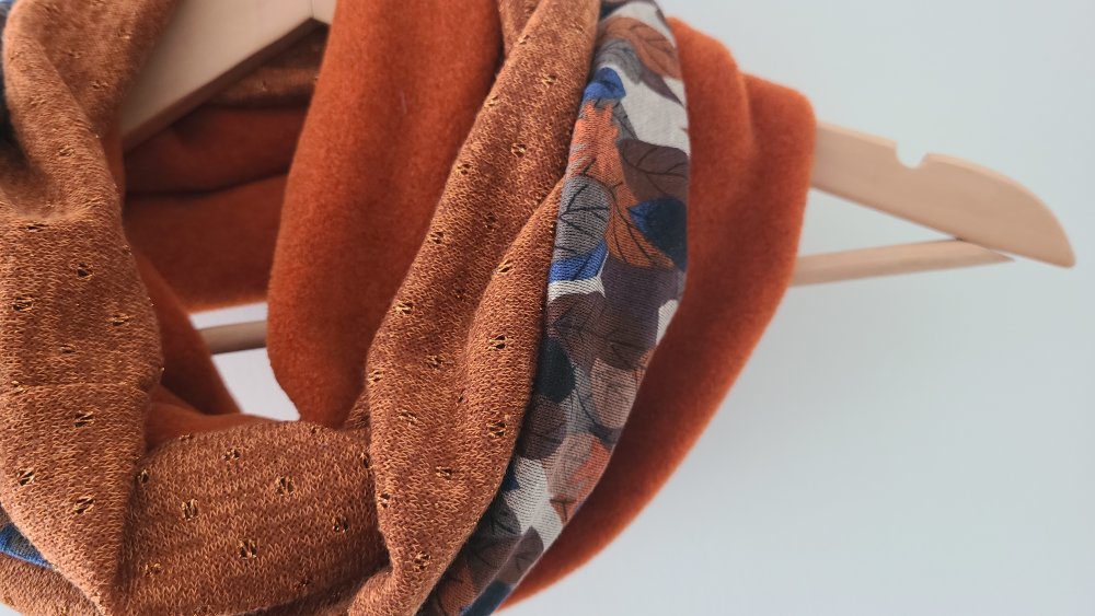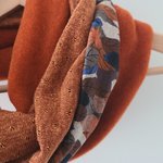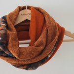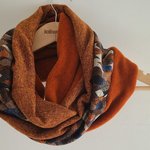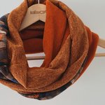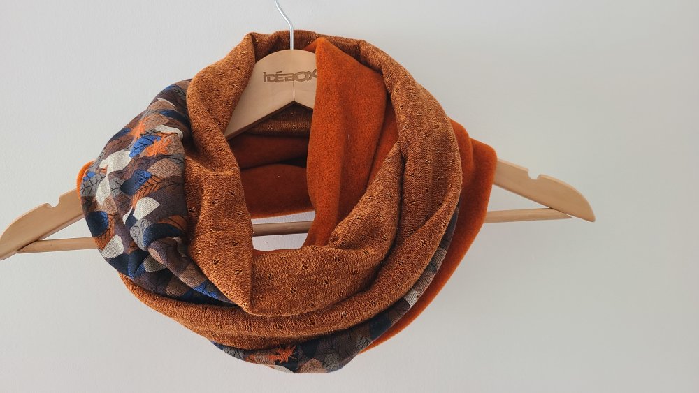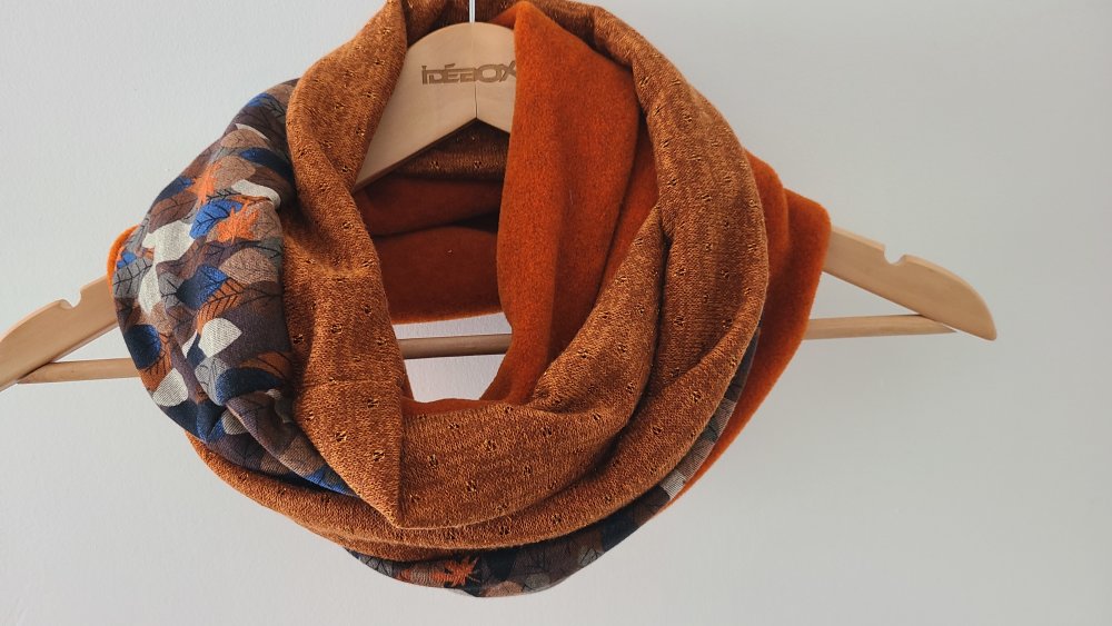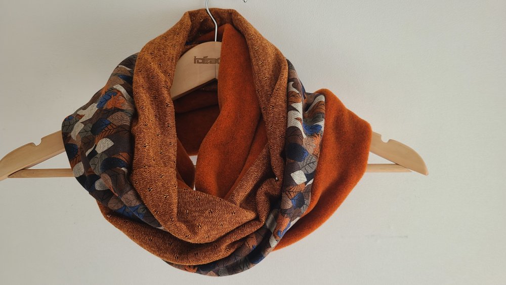 Un snood aux belles couleurs chaudes pour l'hiver. Trois tissus : une polaire orange chinée de très belle qualité, un jersey : un jersey motif feuilles d automne et une maille terracotta. Tous les ingrédients sont là pour faire un snood coloré et original pour l'hiver.