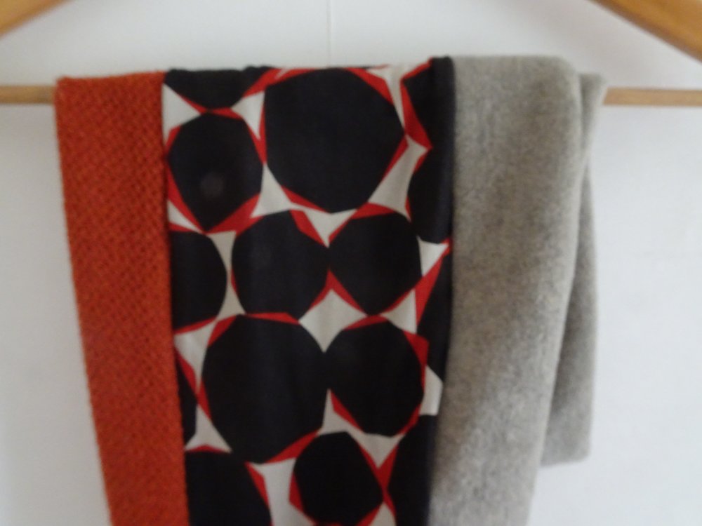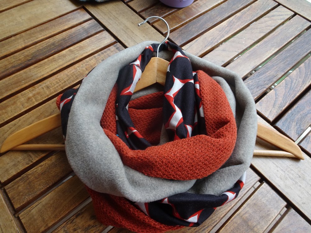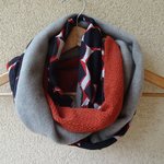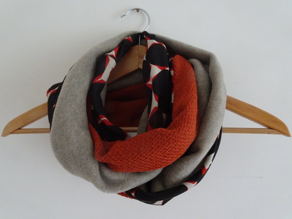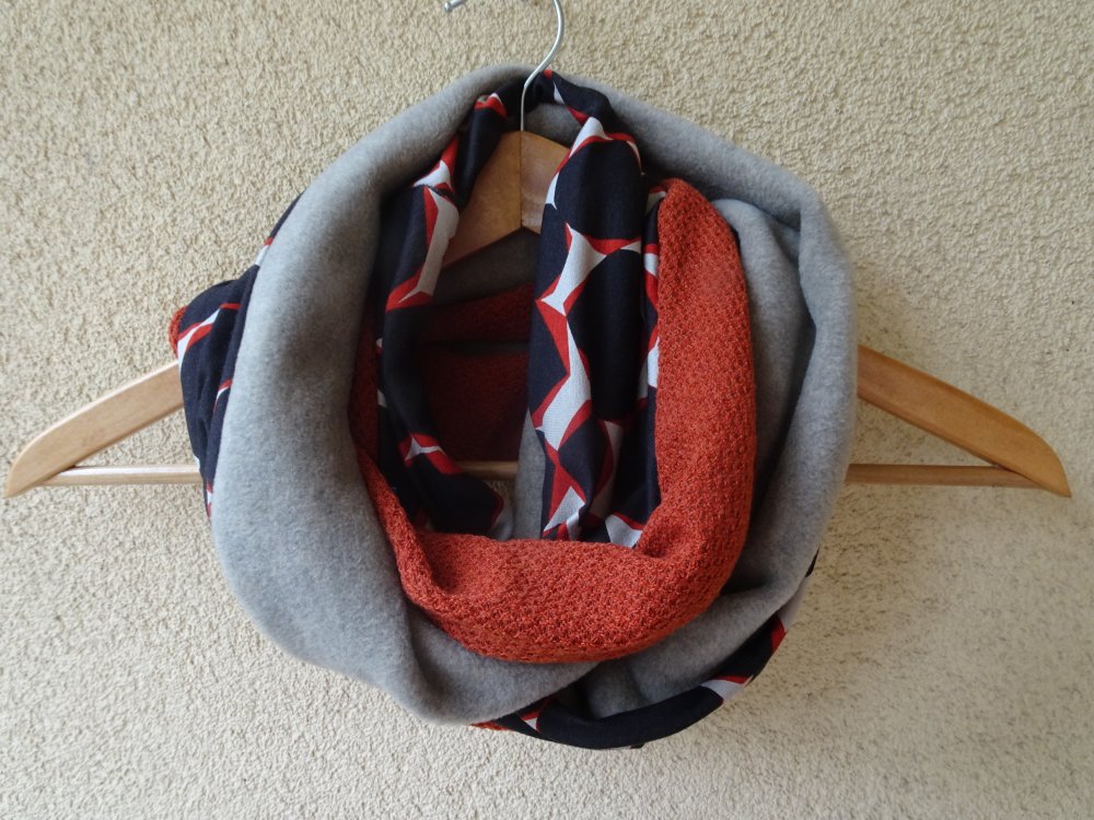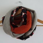 Un snood aux belles couleurs chaudes pour l'hiver pour femme. Trois tissus : une polaire orange chinée de très belle qualité, un jersey : un jersey motif orange et bleu marine et une maille jersey bleu marine. Tous les ingrédients sont là pour faire un snood coloré et original pour l'hiver.