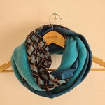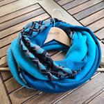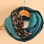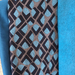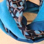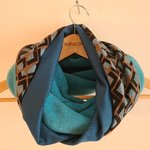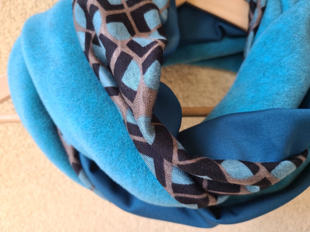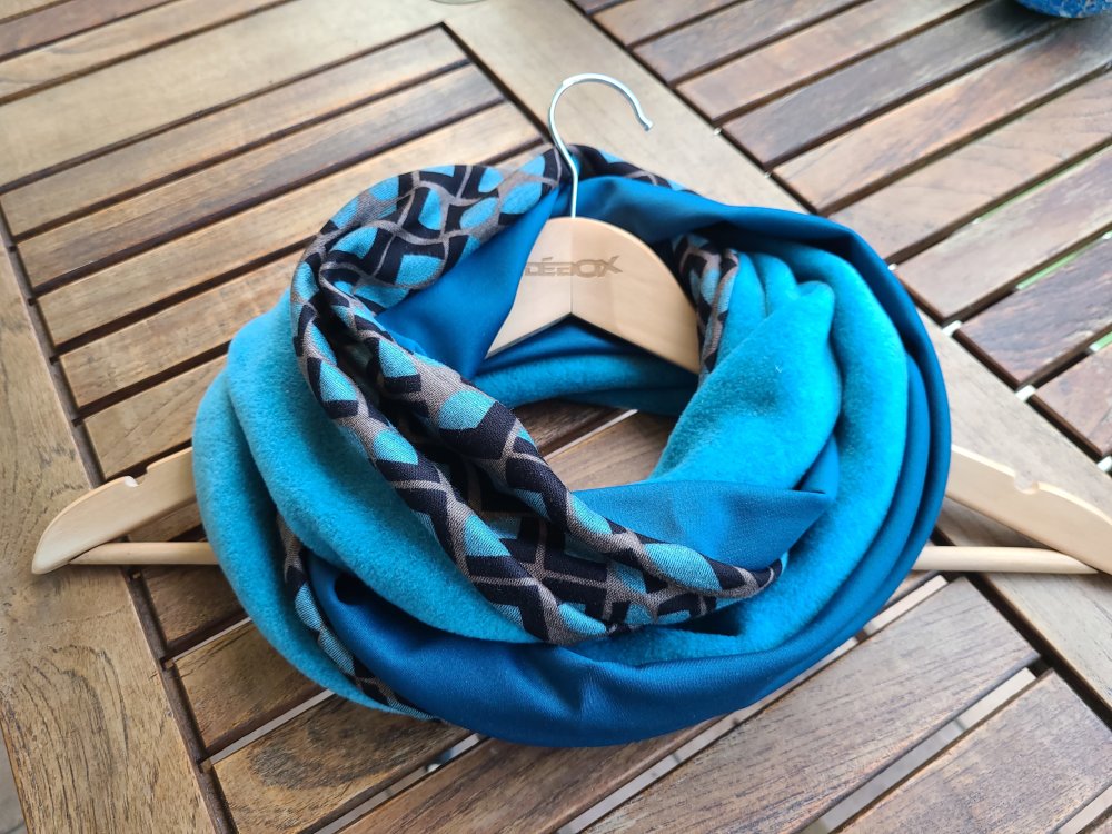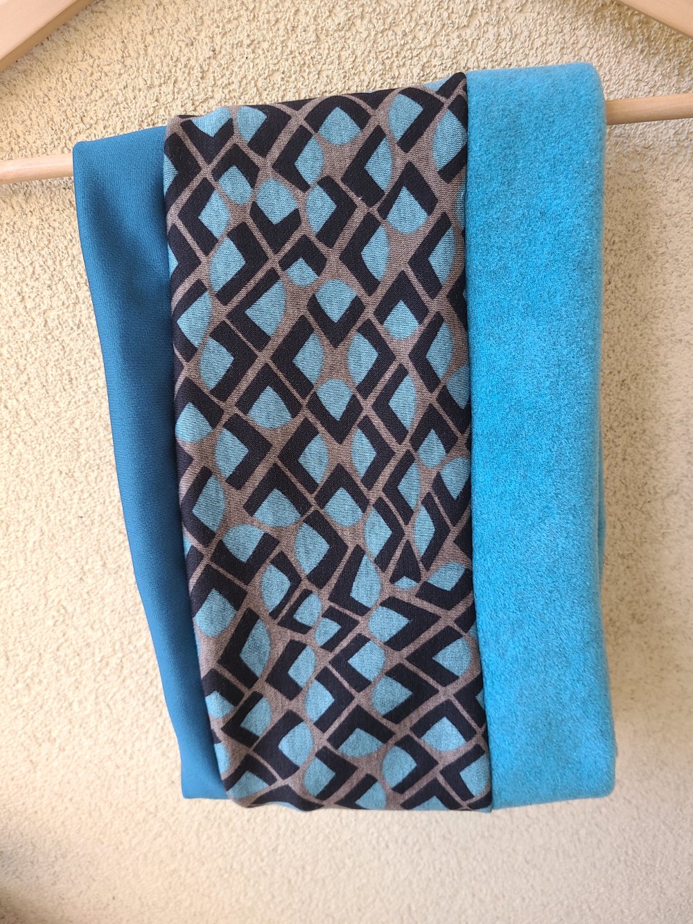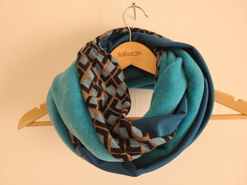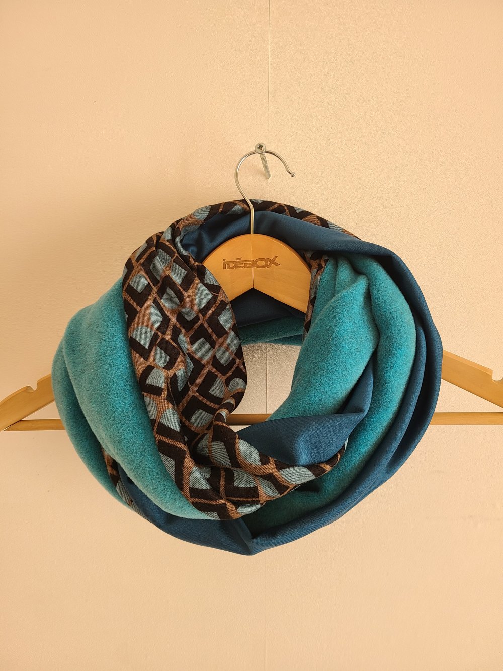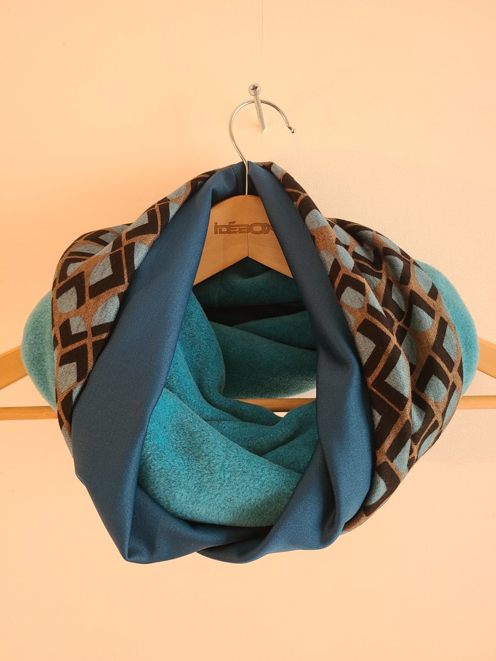Ce snood bien confortable est composé de trois tissus : une jersey imprimé motif géométrique, une maille bleu vert et une polaire turquoise chinée de belle qualité.